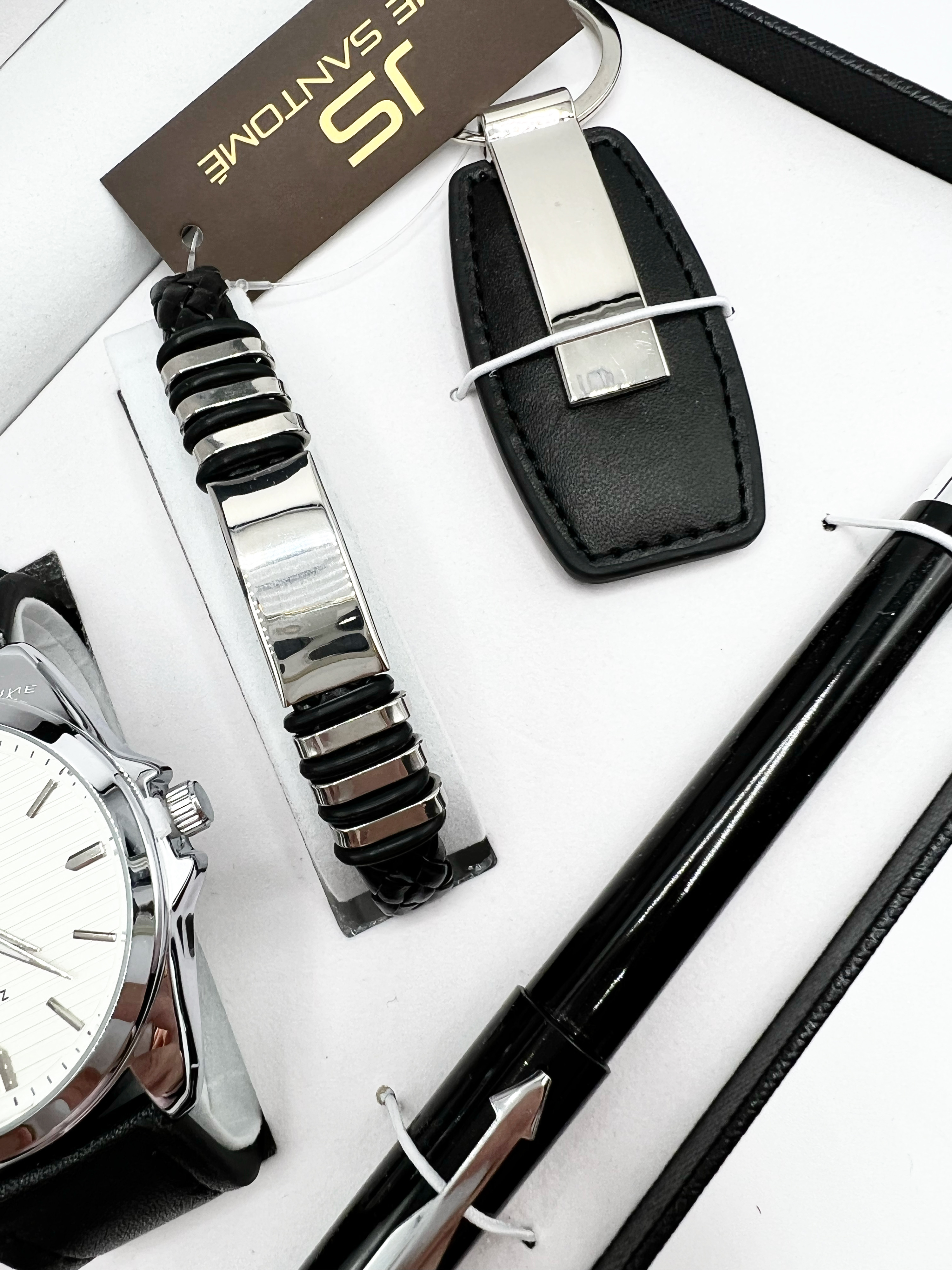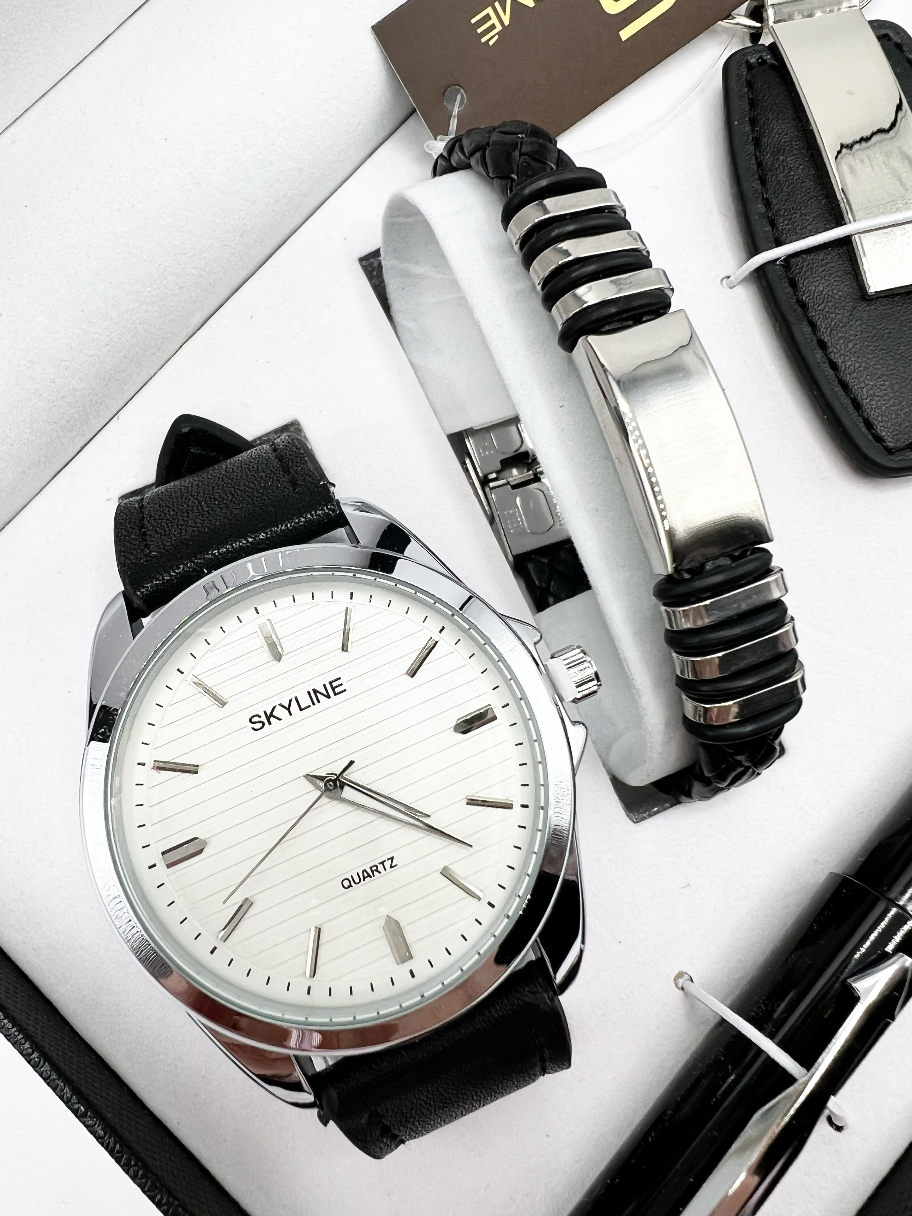 Conjunto de reloj acero Skyline, con bolígrafo, llavero y pulsera trenzada. Movimiento cuarzo japonés. Caja color plata. Correa de polipiel. Impermeabilidad: WR 3ATM. Función: hora.