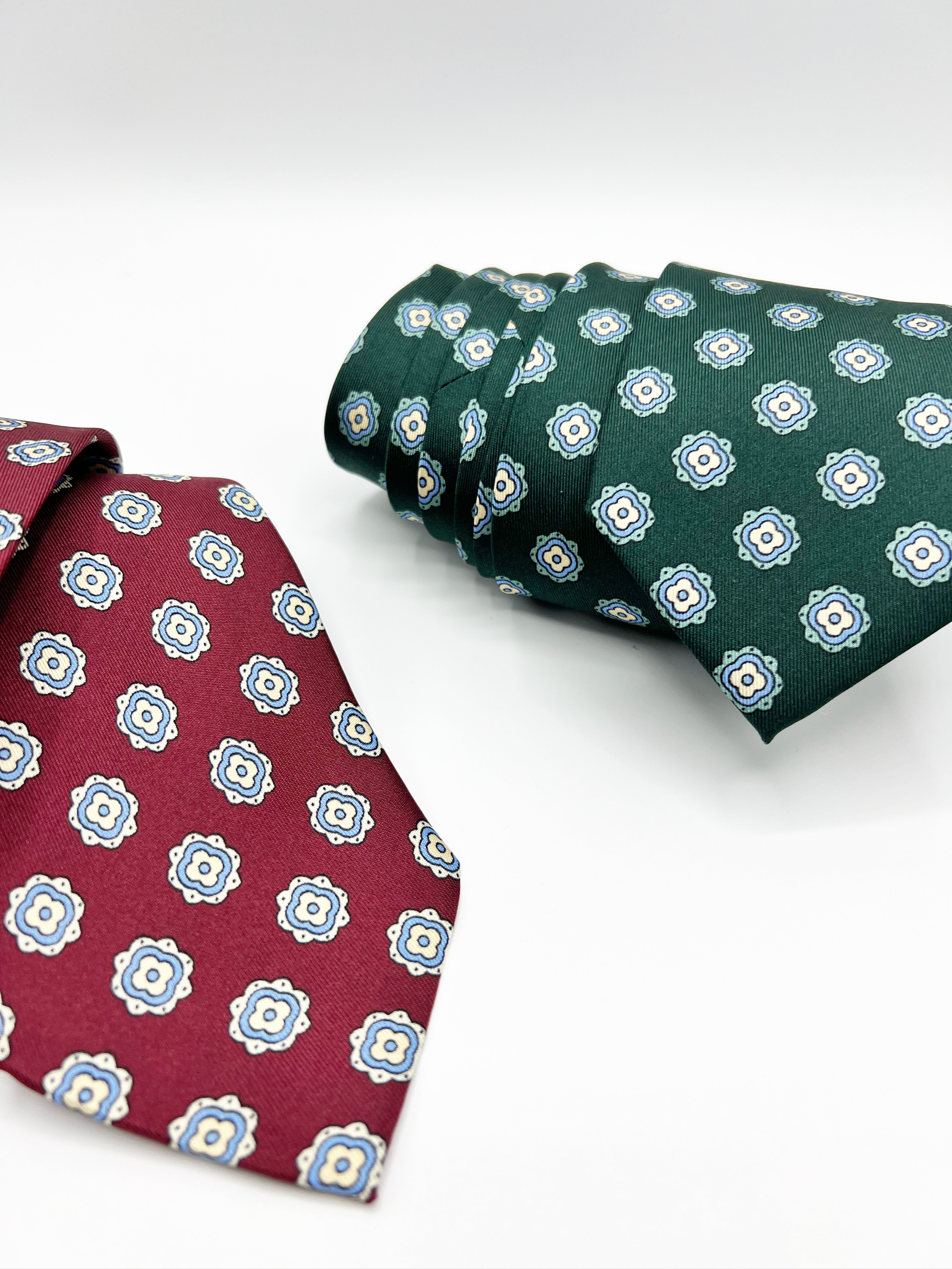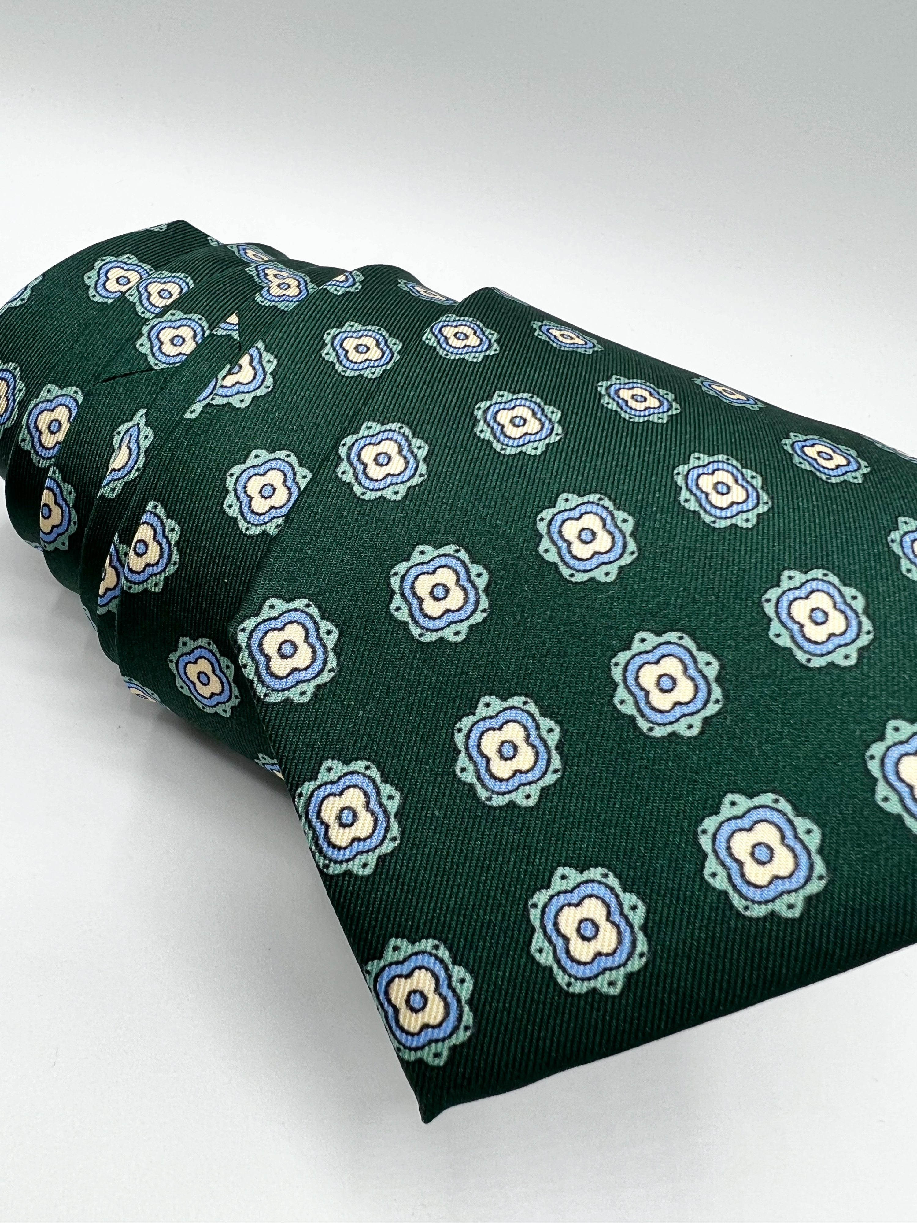 Corbata con estampado de rosetones en tonos blanco y azul, línea FASHION. 100% seda natural. Hecha a mano. Fabricada en Italia.