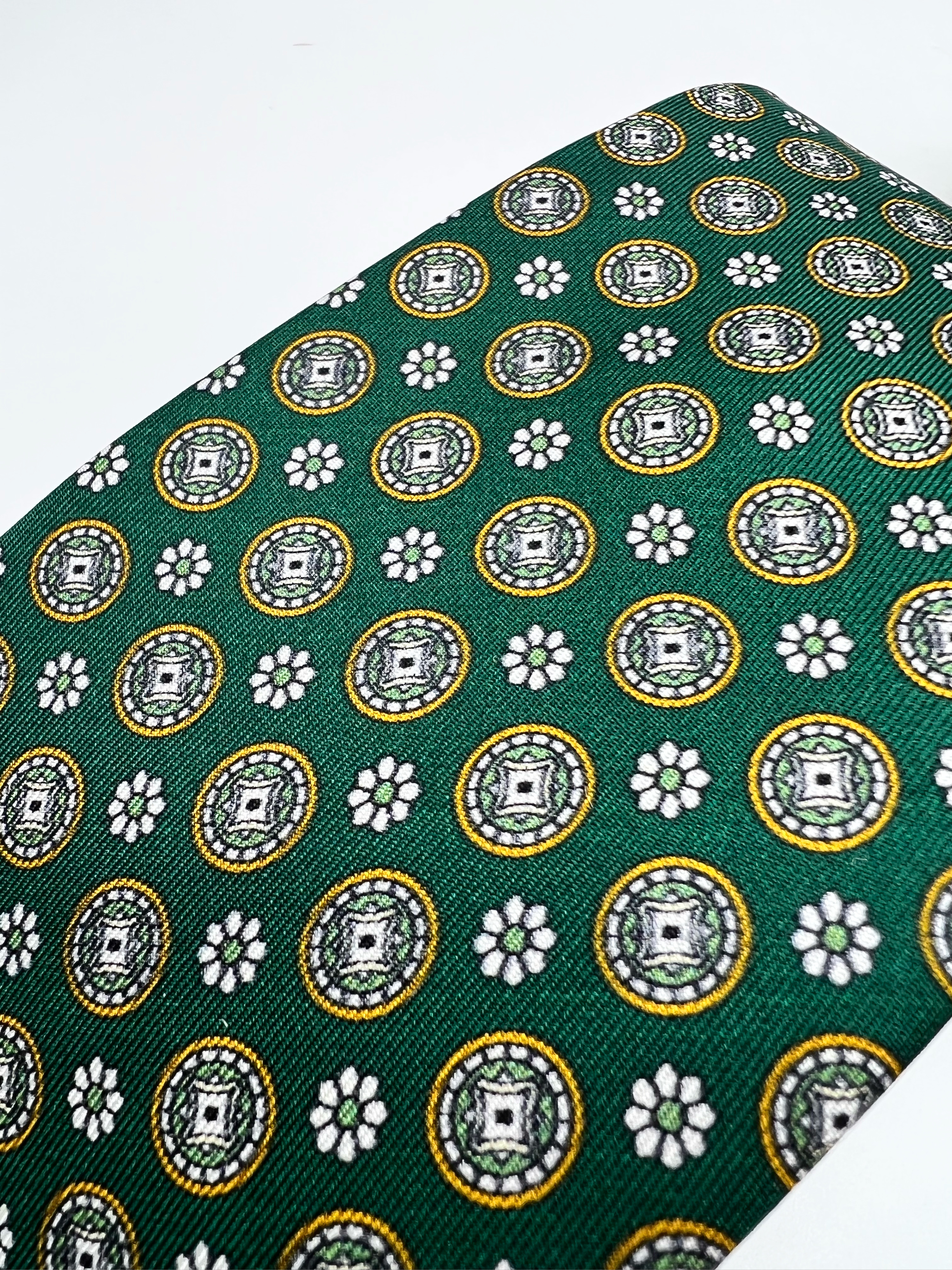 Corbata con estampado de pequeños medallones redondos y margaritas, línea FASHION, 100% seda natural. Hecha a mano. Fabricada en Italia.