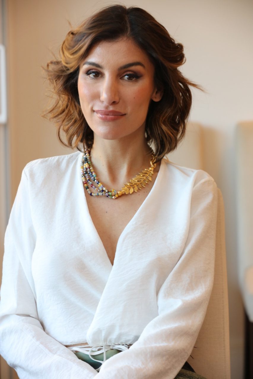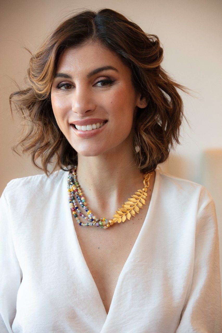 Collar corto de cristal multicolor con entrepiezas doradas y hoja lucerna en baño de oro mate de 18K.