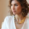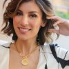 Collar corto de perlas de rio blancas y entrepiezas, con placa y nacar en blanco. Todo en oro mate de 18 kilates. Lleva cierre mosquetón para ajustar el collar a cualquier tamaño de cuello.