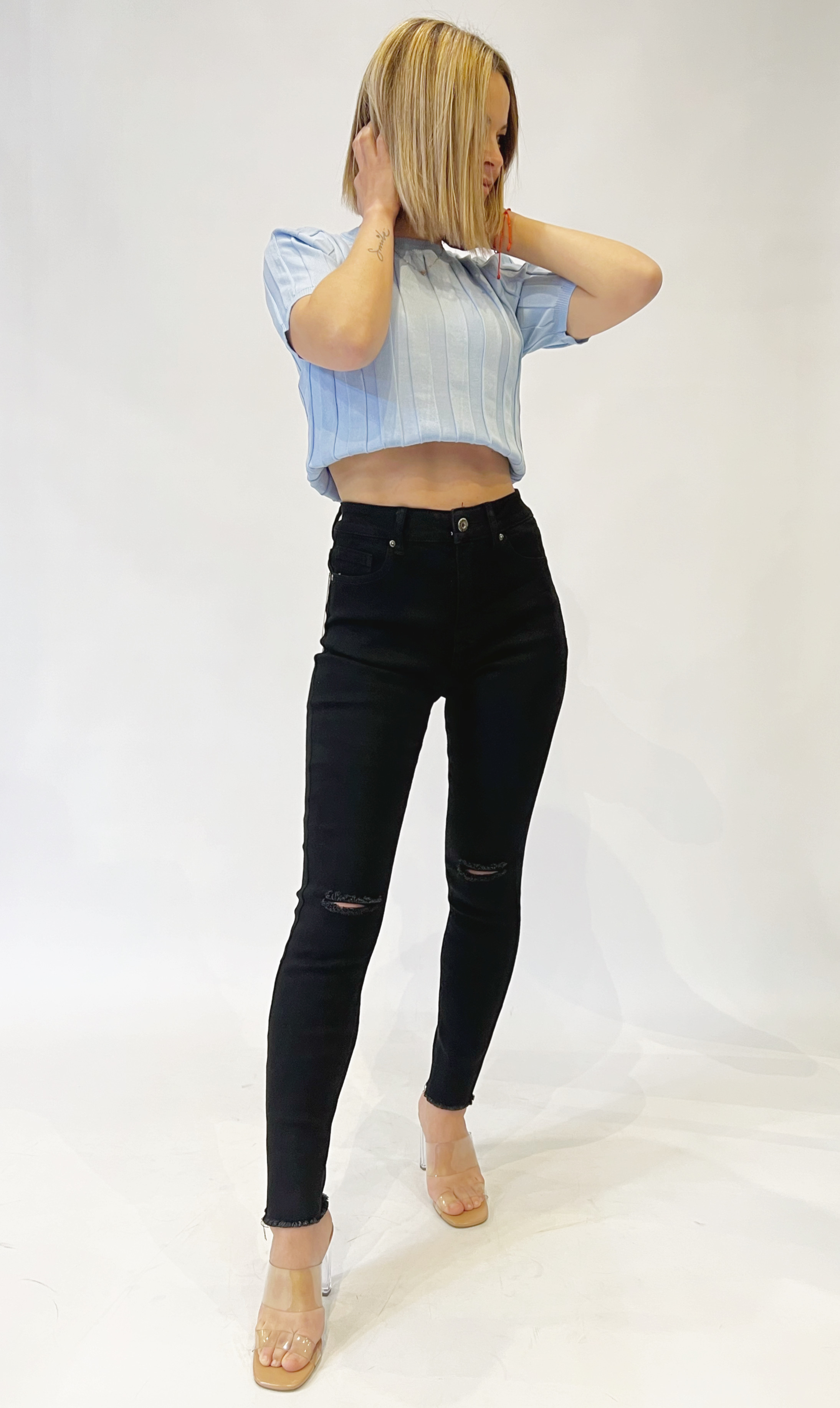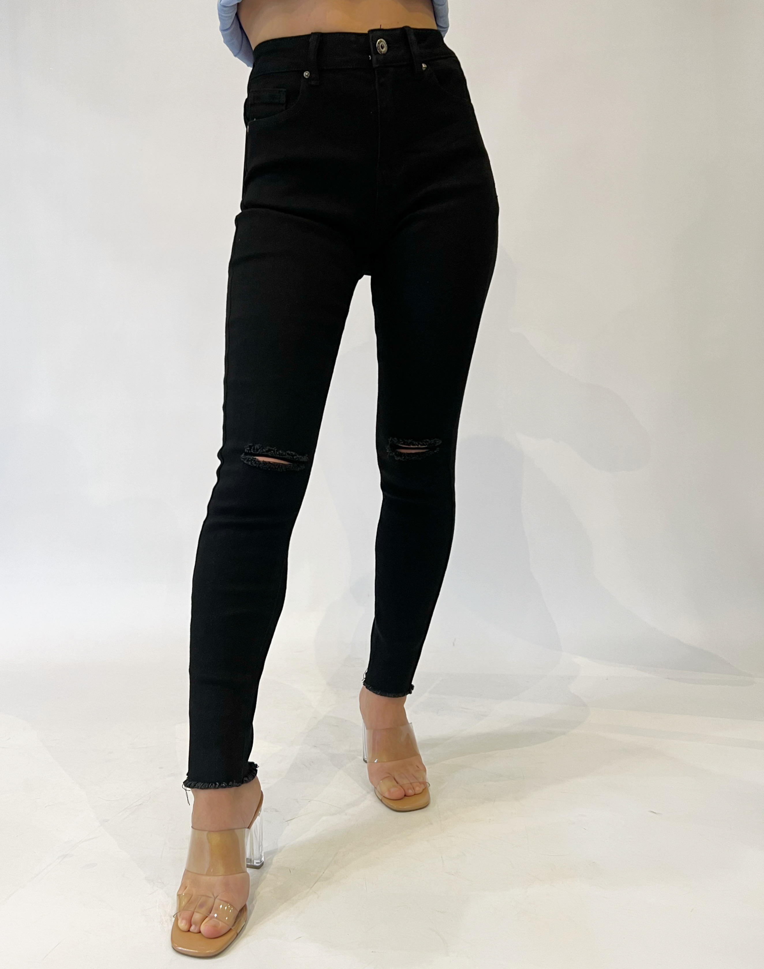 Pantalón vaquero Skinny Fit de tiro alto. Roto decorativo en rodillas. Trabillas para cinturón, cinco bolsillos y cierre de cremallera con botón metálico superior. Bajo deshilachado. Composición: 76% algodón, 19% poliéster, 2% viscosa y 3 elastano.