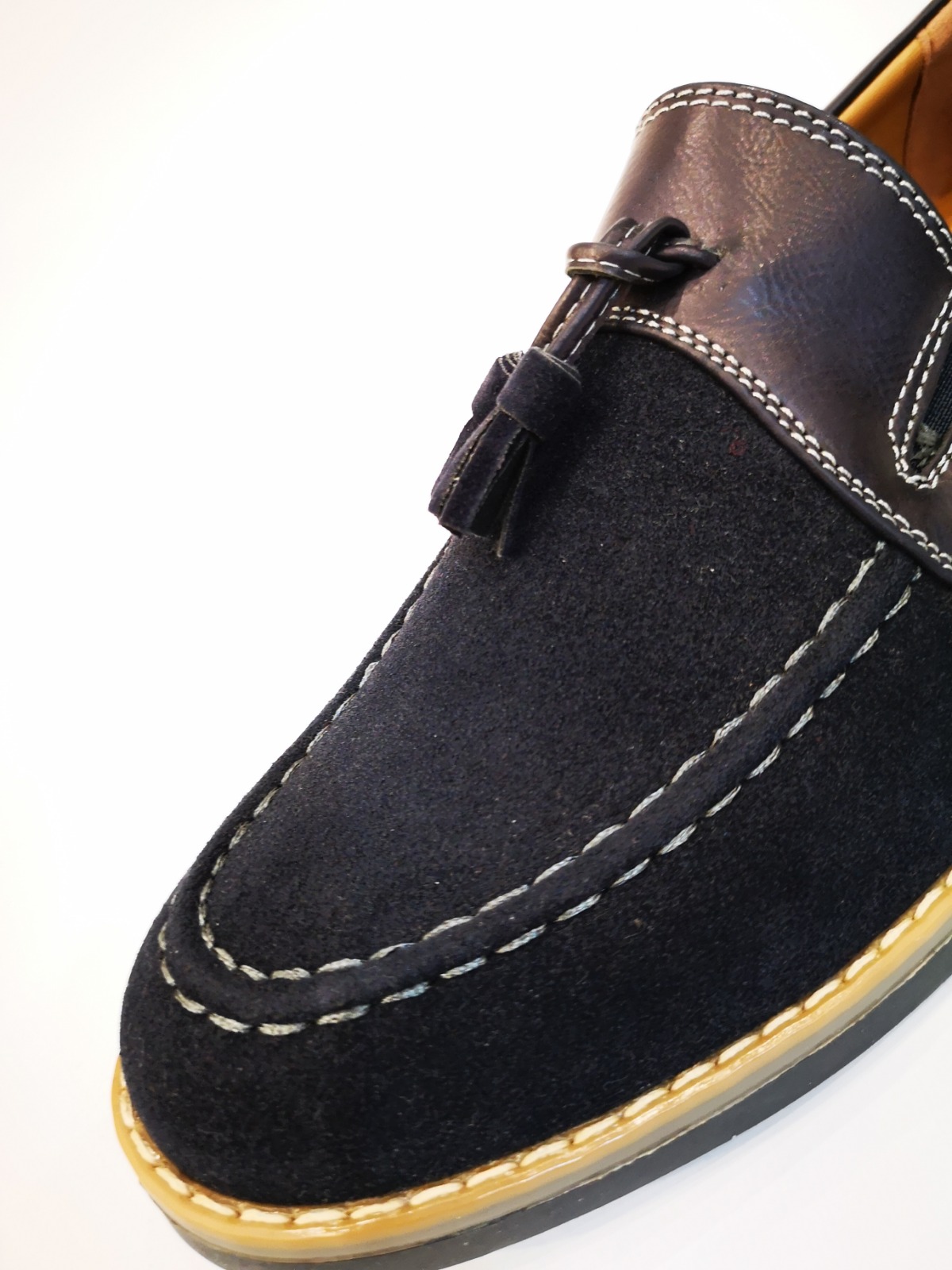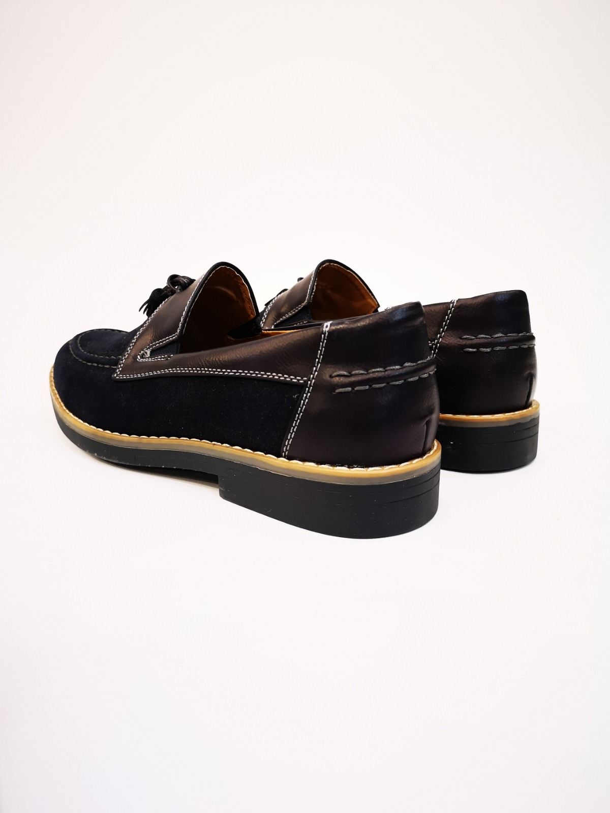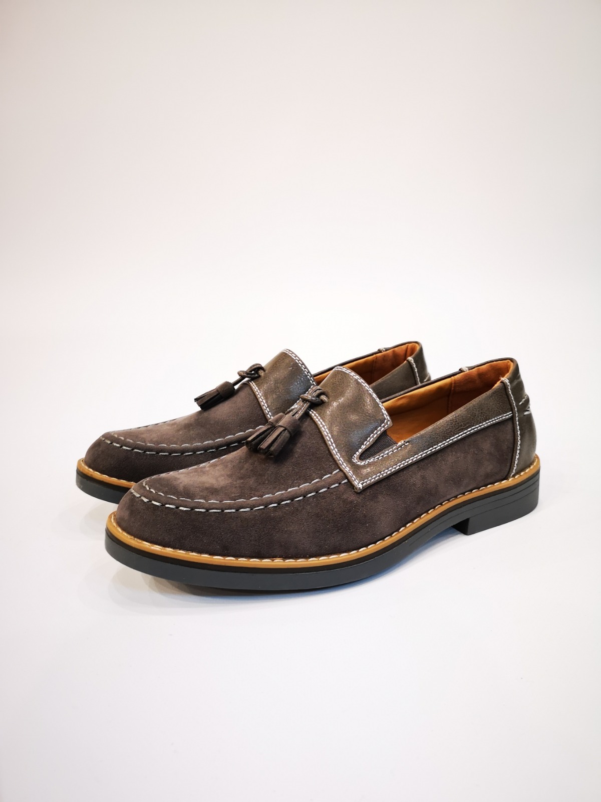 Mocasín con borlas y costuras decorativas. Acabado serraje y polipiel. Plantilla de piel y suela de goma.