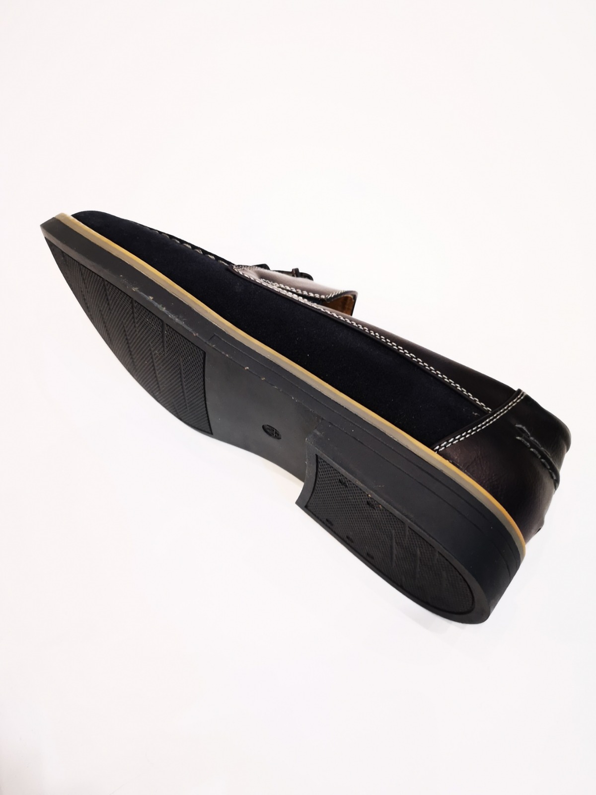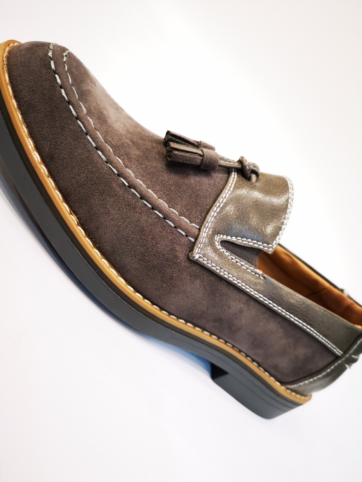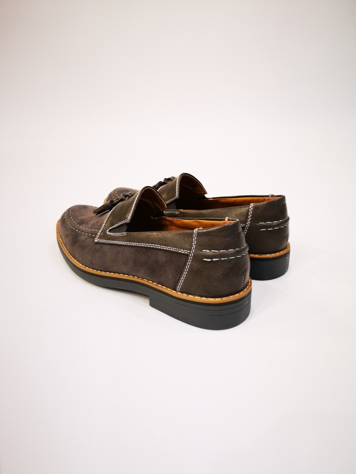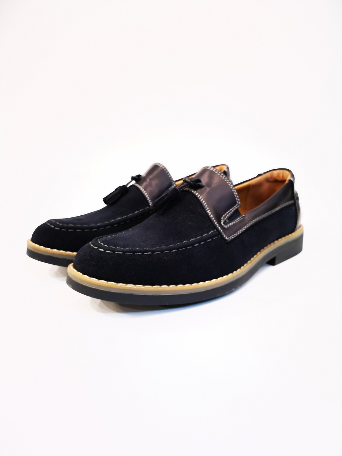 Mocasín con borlas y costuras decorativas. Acabado serraje y polipiel. Plantilla de piel y suela de goma.