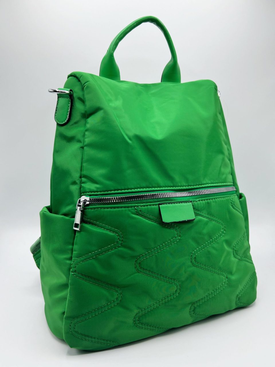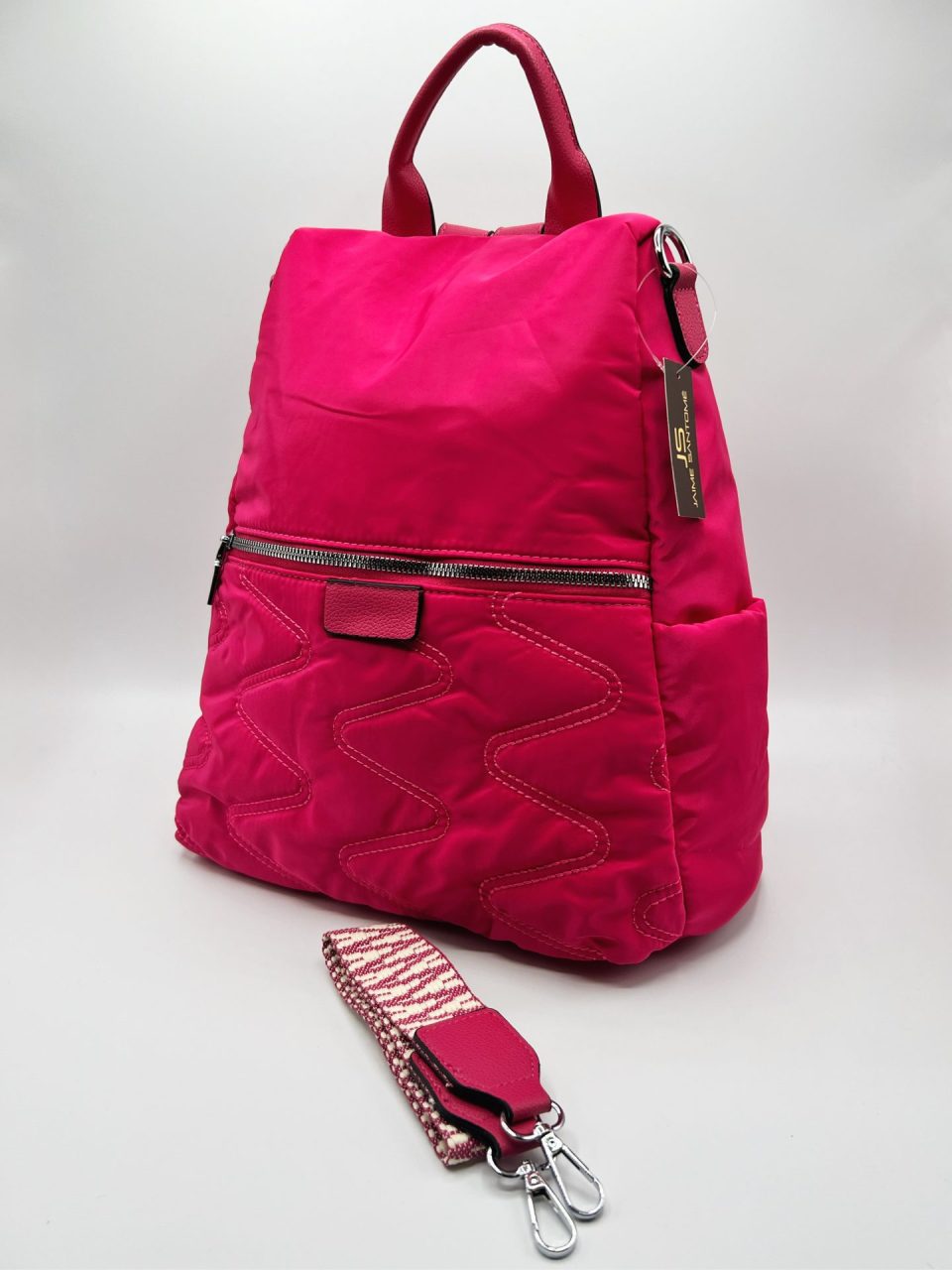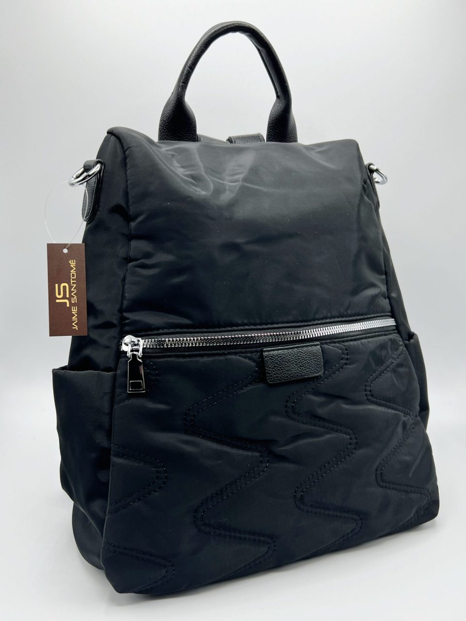Mochila funcional antirrobo con un asa para llevar como bolso. Compartimento principal detrás, con dos bolsillos interiores, uno abierto y otro de cremallera y cierre de cremallera. Un bolsillo grande exterior en frontal, con cierre de cremallera. Dos bolsillos abiertos en laterales. Exterior: 100% Nylon (meterial principal) y 100% PU (material secundario). Interior (forro): 100% poliéster. Fornituras en metal plateado.