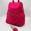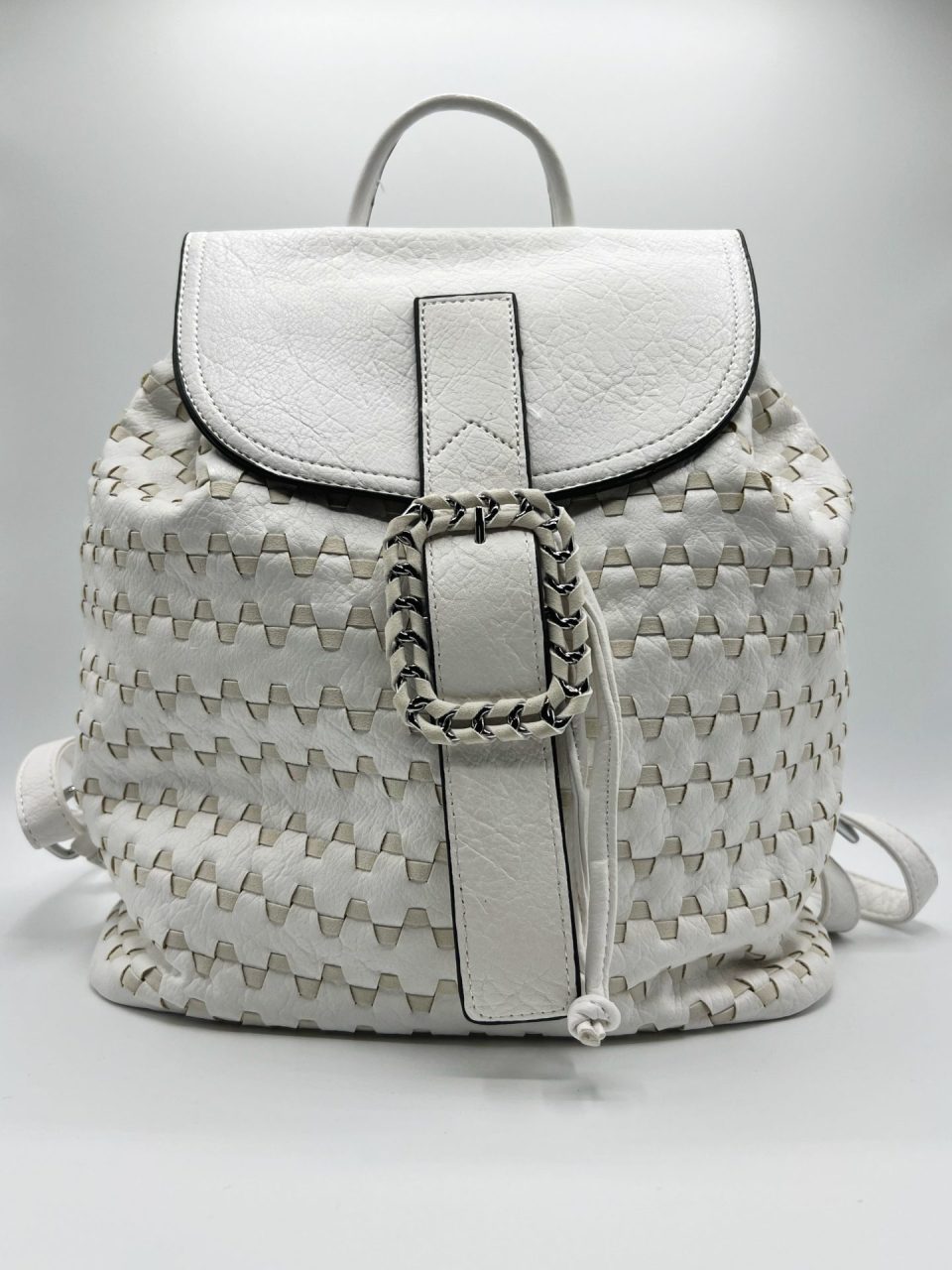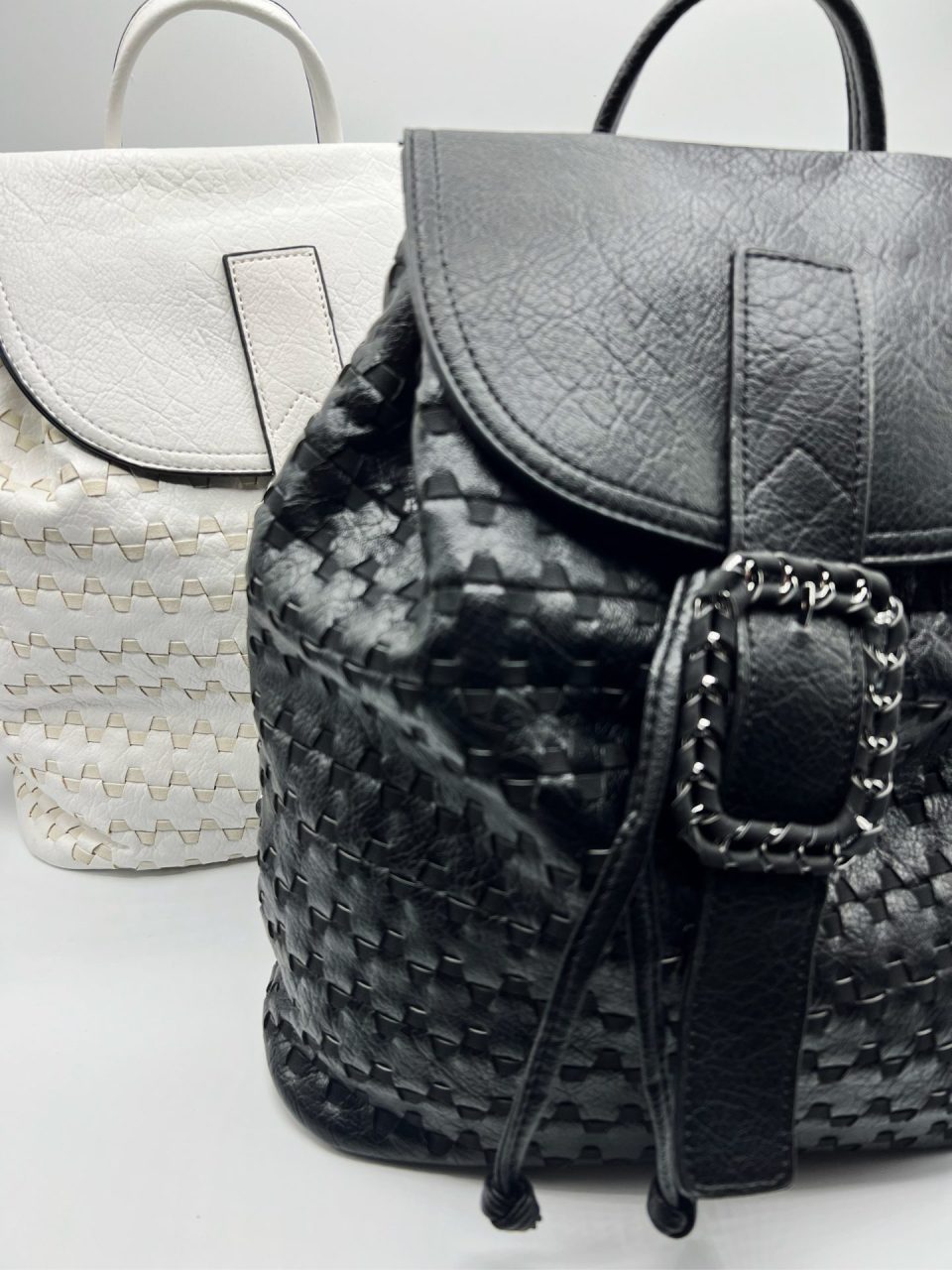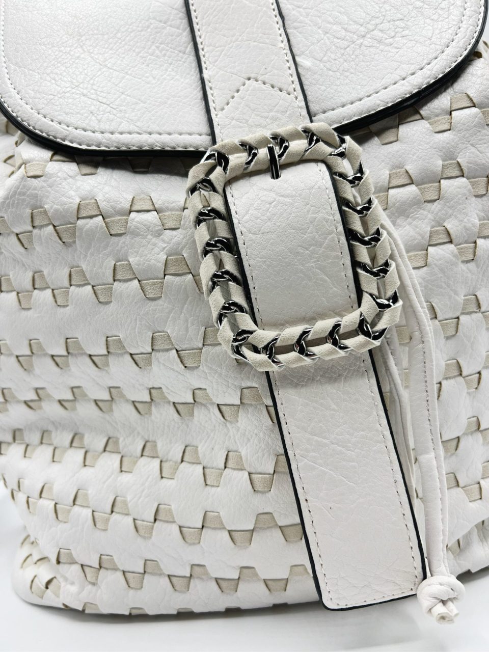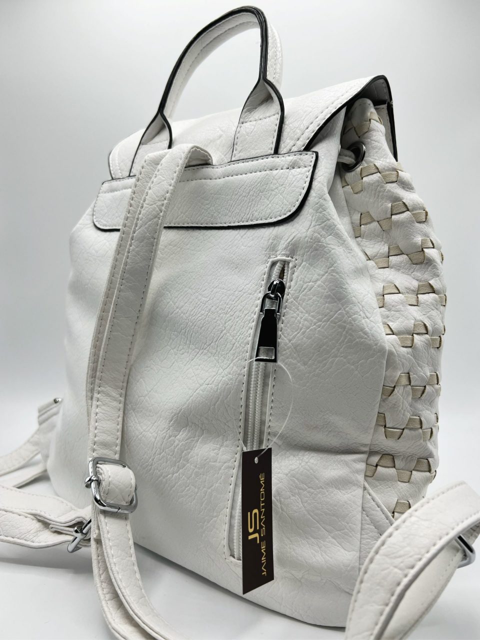 Mochila funcional con cuatro bolsillos interiores, dos abiertos y dos superpuestos de cremallera. Un bolsillo vertical exterior de cremallera. Cierre ajustable de cordones y solapa superior con detalle de hebilla decorativa y cierre de botón de imán. Trenzado en frontal y laterales. Asa en superior. Exterior: 100% PU e Interior (forro): 100% poliéster. Fornituras en metal plateado.