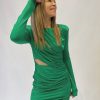 Mono corto con escote cruzado en pico y tirantes. Espala pronunciada abierta en «V». Corte fruncido en cintura. Totalmente cubierto de rayas verticales y flecos de hilos con lentejuelas. 95% poliéster y 5% elastano.