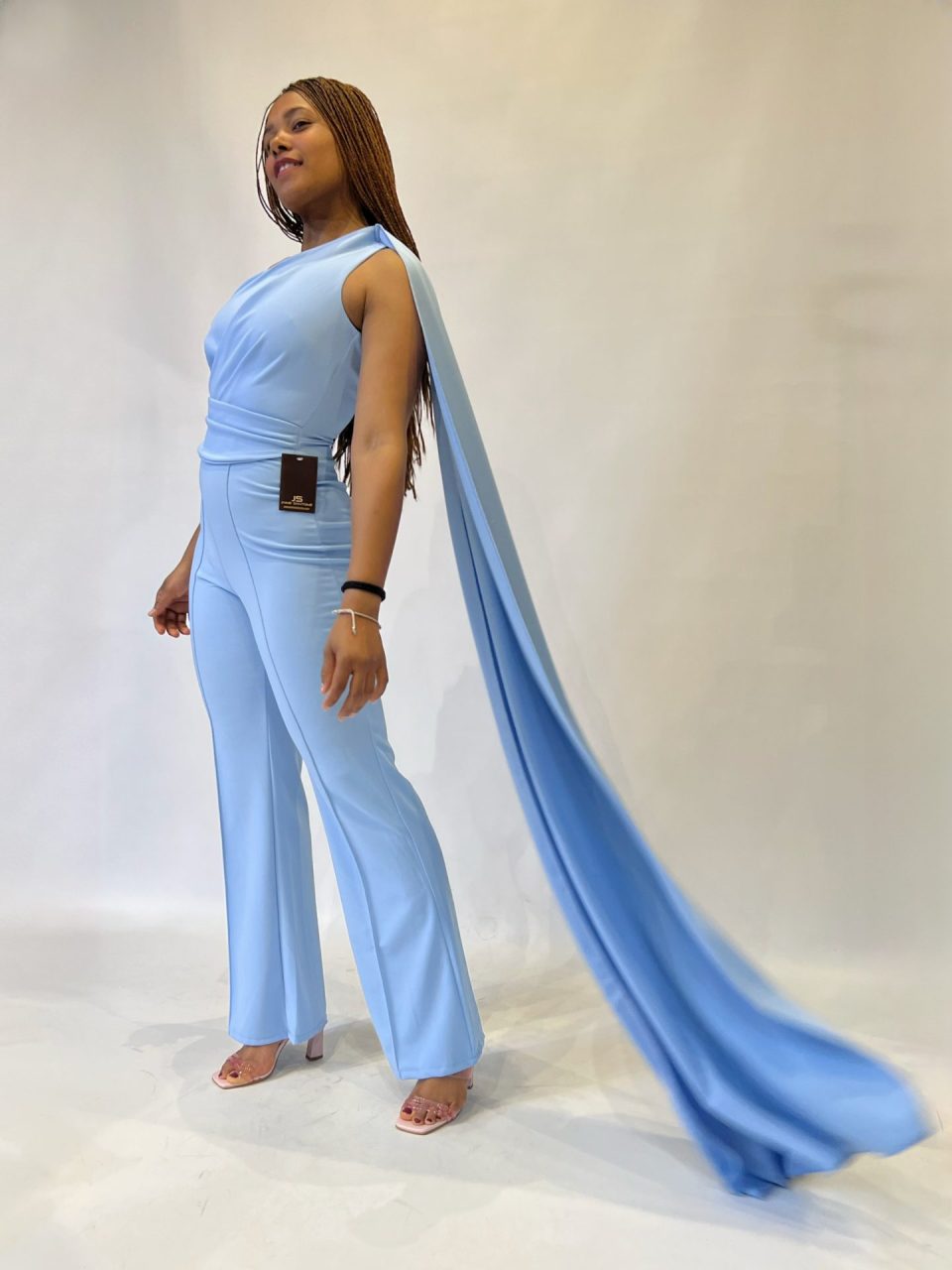 Mono largo en crepé scuba, sin mangas y escote asimétrico drapeado, de una tira, estilo Greco-Romano. Fajín delantero en cintura. Detalle de capa de Vesper. Pernera ancha recta. Cierre de cremallera invisible en posterior. 80% poliéster y 20% elastano. Hecho en Italia.