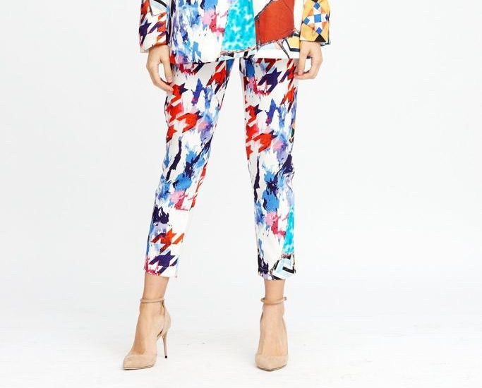 Pantalón estampado tobillero mujer. Trabillas para cinturón. Cuatro bolsillos, dos traseros y dos delanteros. Cierres de cremallera y botón superior. 100% poliéster.