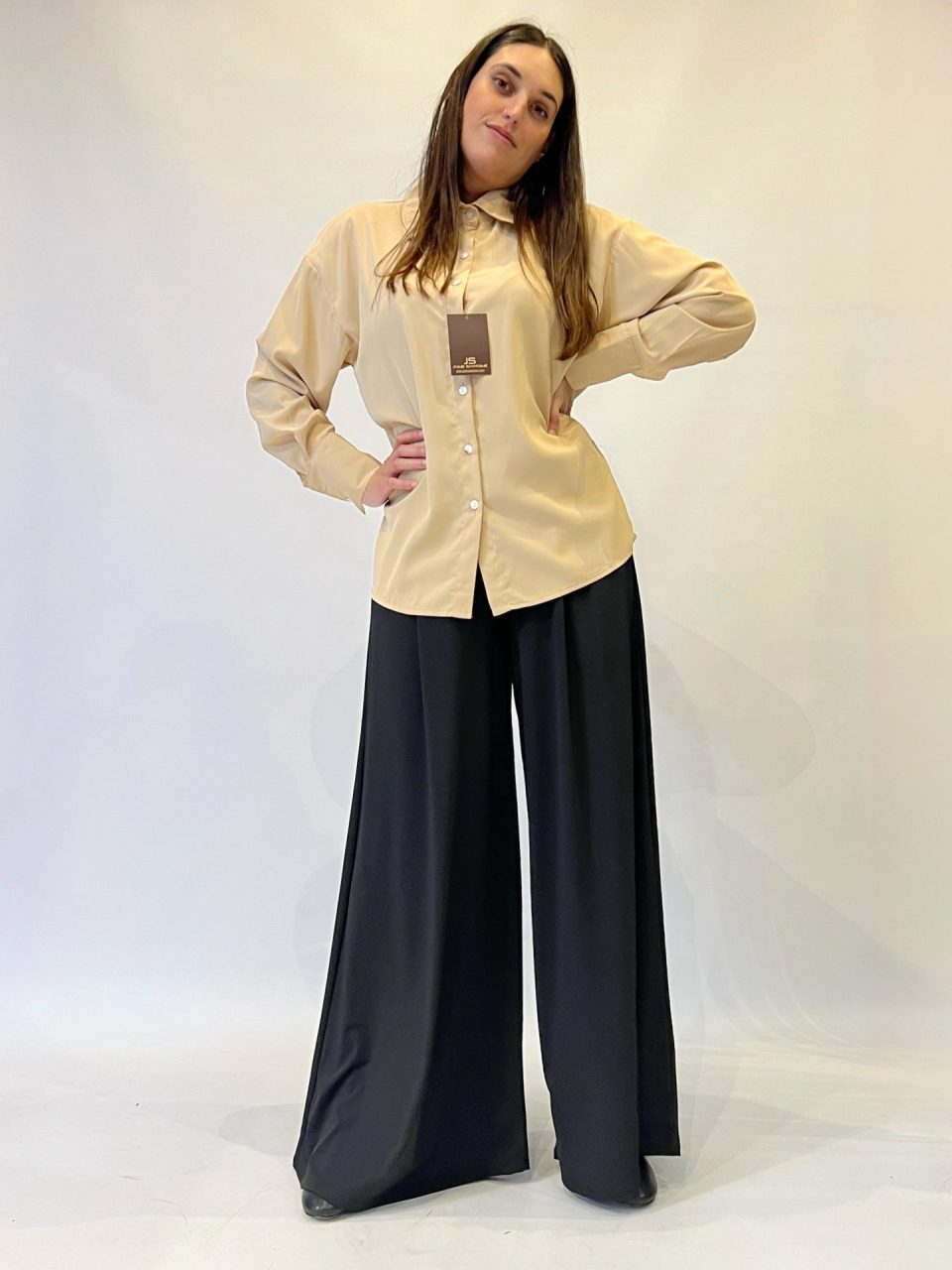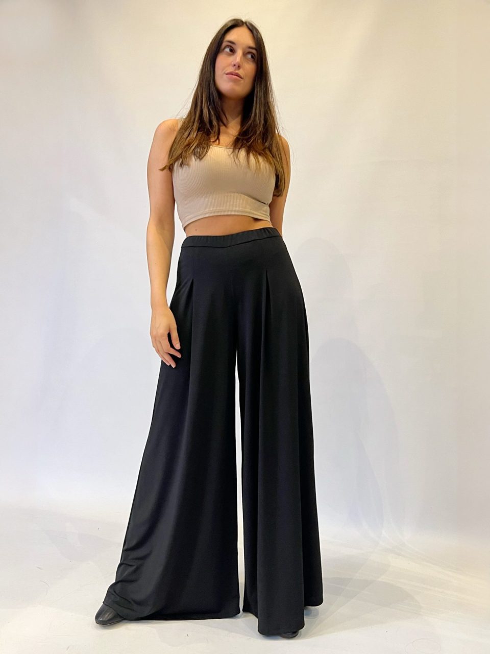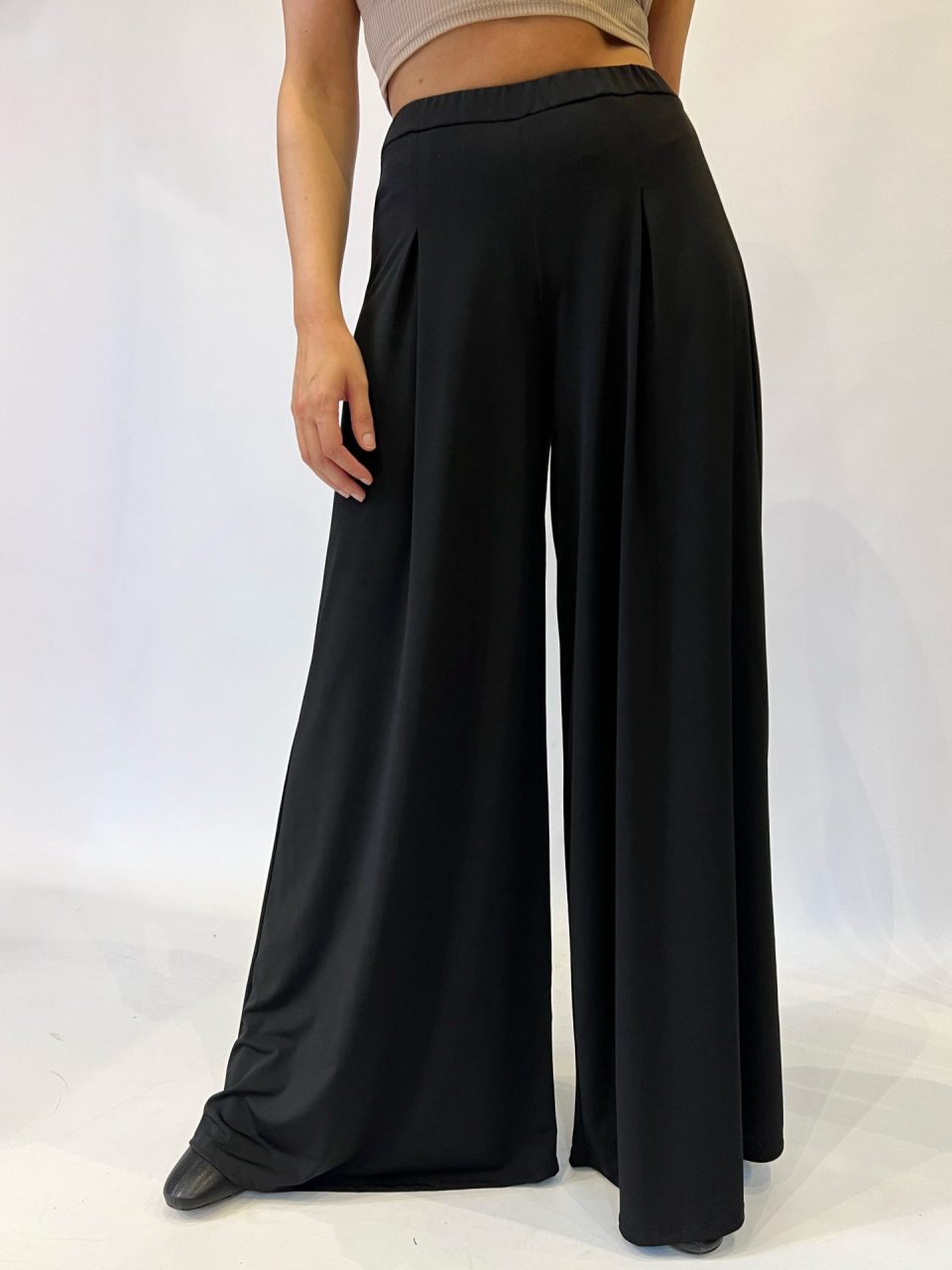 Pantalón de cintura elástica y corte recto con pernera súper ancha. Composición: 95% poliéster y 5% elastano.