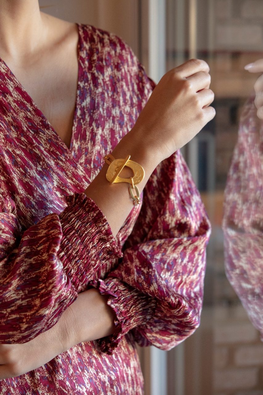 Pulsera de cadena de eslabones ovalados con aro irregular y cierre palito. Todo en oro mate de 18 kilates.