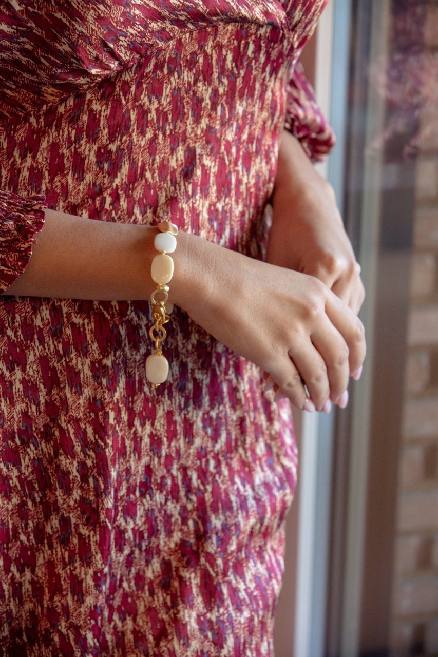 Pulsera de nacar blanco con semillas. Todo en oro mate de 18 kilates.