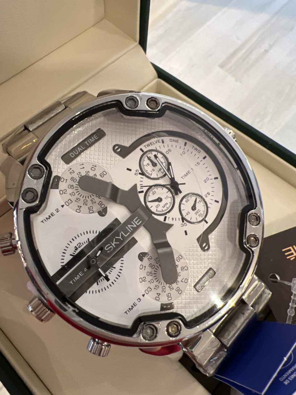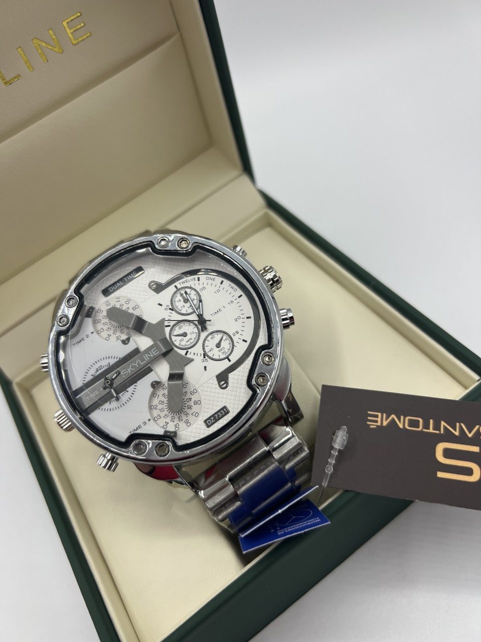Reloj Skyline acero inoxidable dual time con calendario. Movimiento cuarzo japonés. Correa acero inoxidable. Resistencia al agua 3ATM.