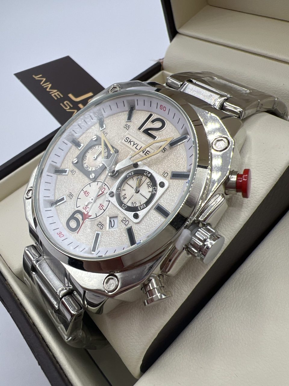 Reloj cronógrafo Skyline en acero. Movimiento cuarzo japonés. Correa en acero inoxidable. Función hora, calendario y cronógrafo.