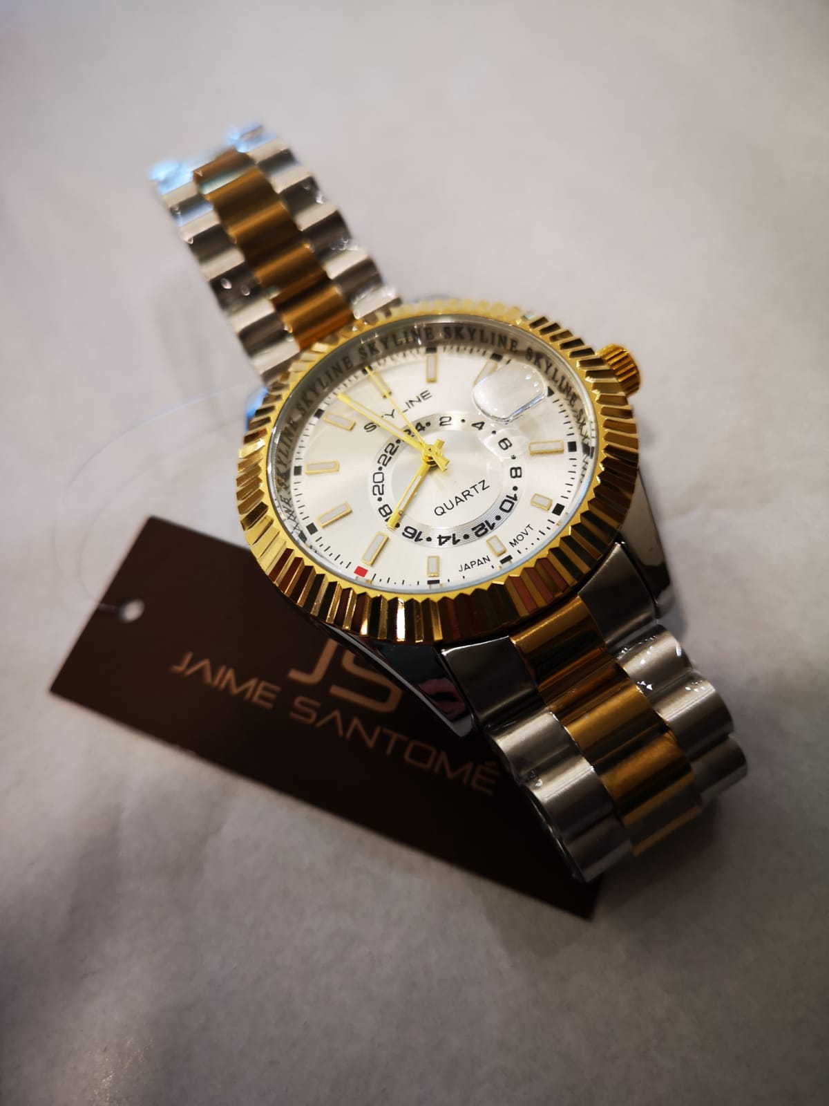 Reloj clásico de acero en color plateado combinado con dorado. Esfera redonda en color grisáceo. Funciones: hora, calendario y cronógrafo.