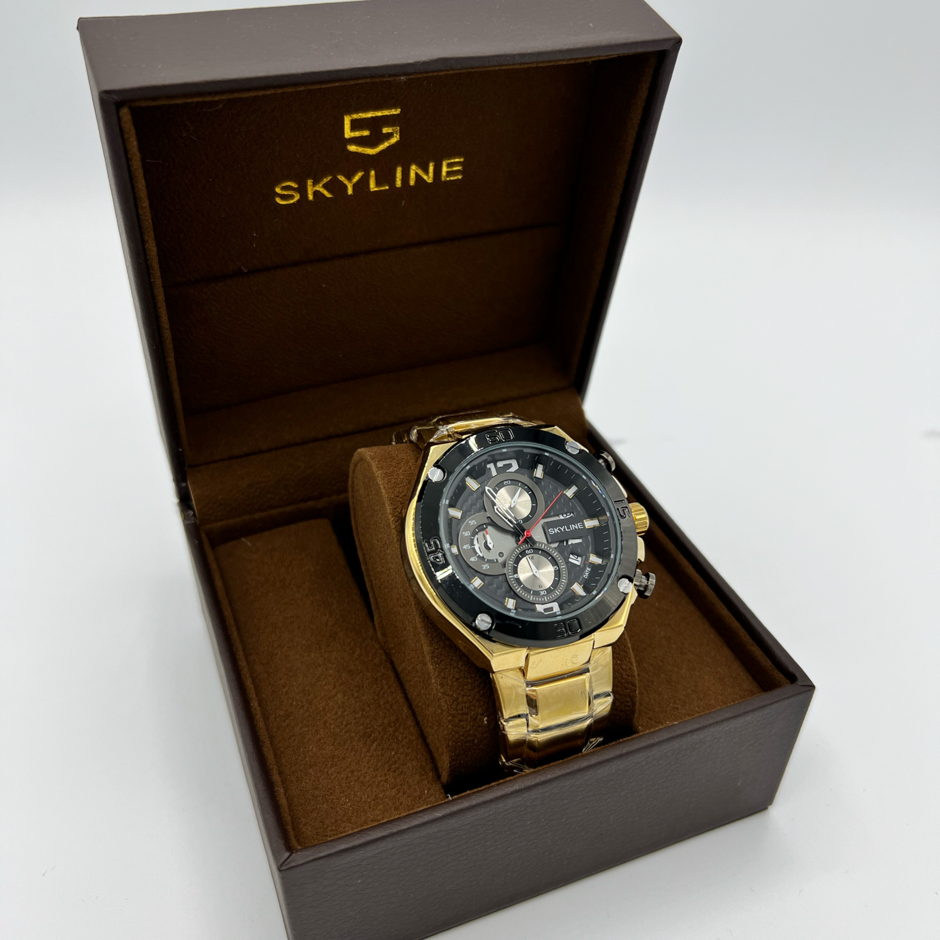 Reloj analógico Skyline en acero. Movimiento cuarzo japonés. Correa en acero inoxidable dorado. Función hora, calendario y cronógrafo.