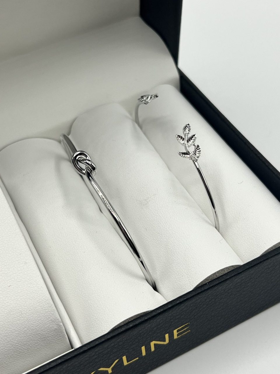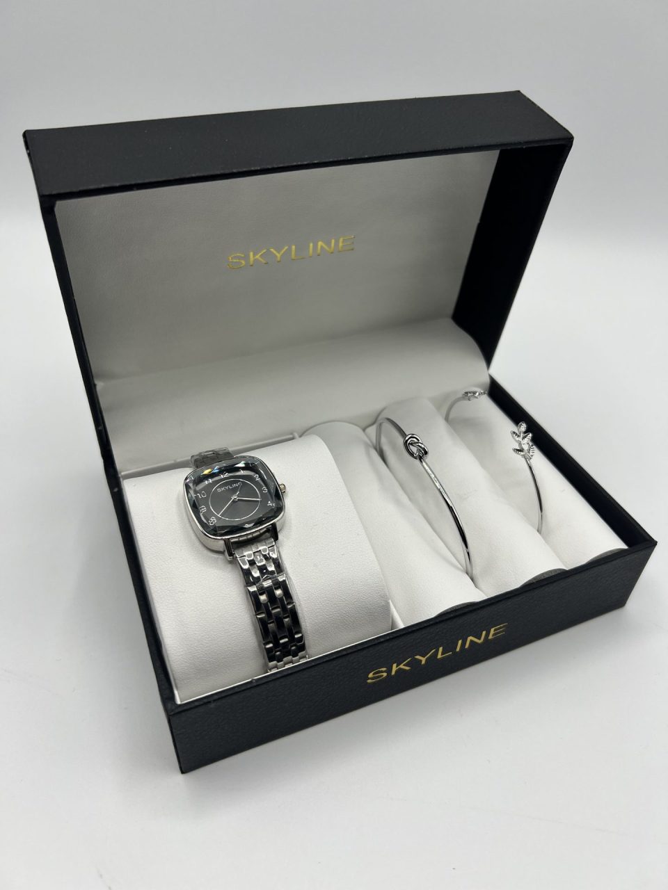 Conjunto reloj acero Skyline, caja cuadrada, con dos pulseras.
