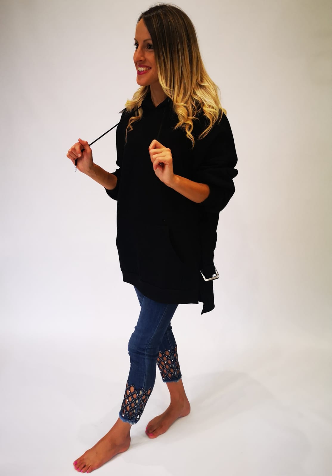 Sudadera con capucha ajustable con cordones. Maga larga. Bolsillo tipo canguro en delantero. Cinturón.