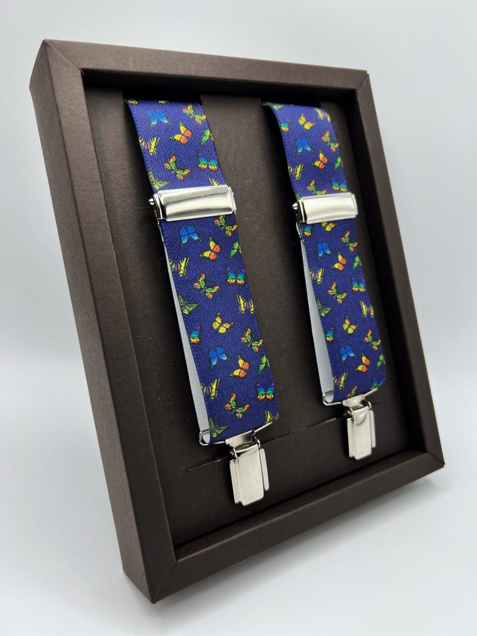 Tirantes en textil elástico ajustables, con estampado de amebas multicolor. La anchura de los tirantes es de 3,5 cm. El largo es de 112 cms. mas 8 cms para regular según la altura. Se adapta hasta una persona de altura 1,94 cms.