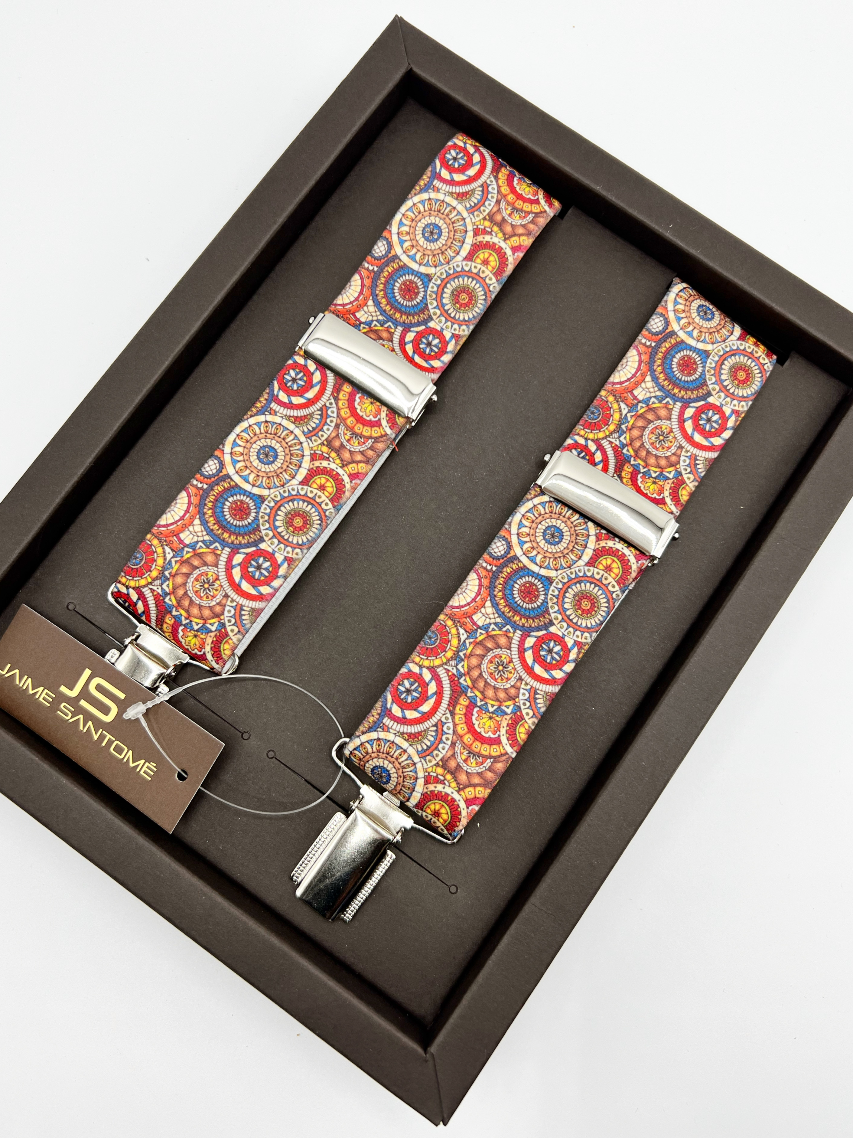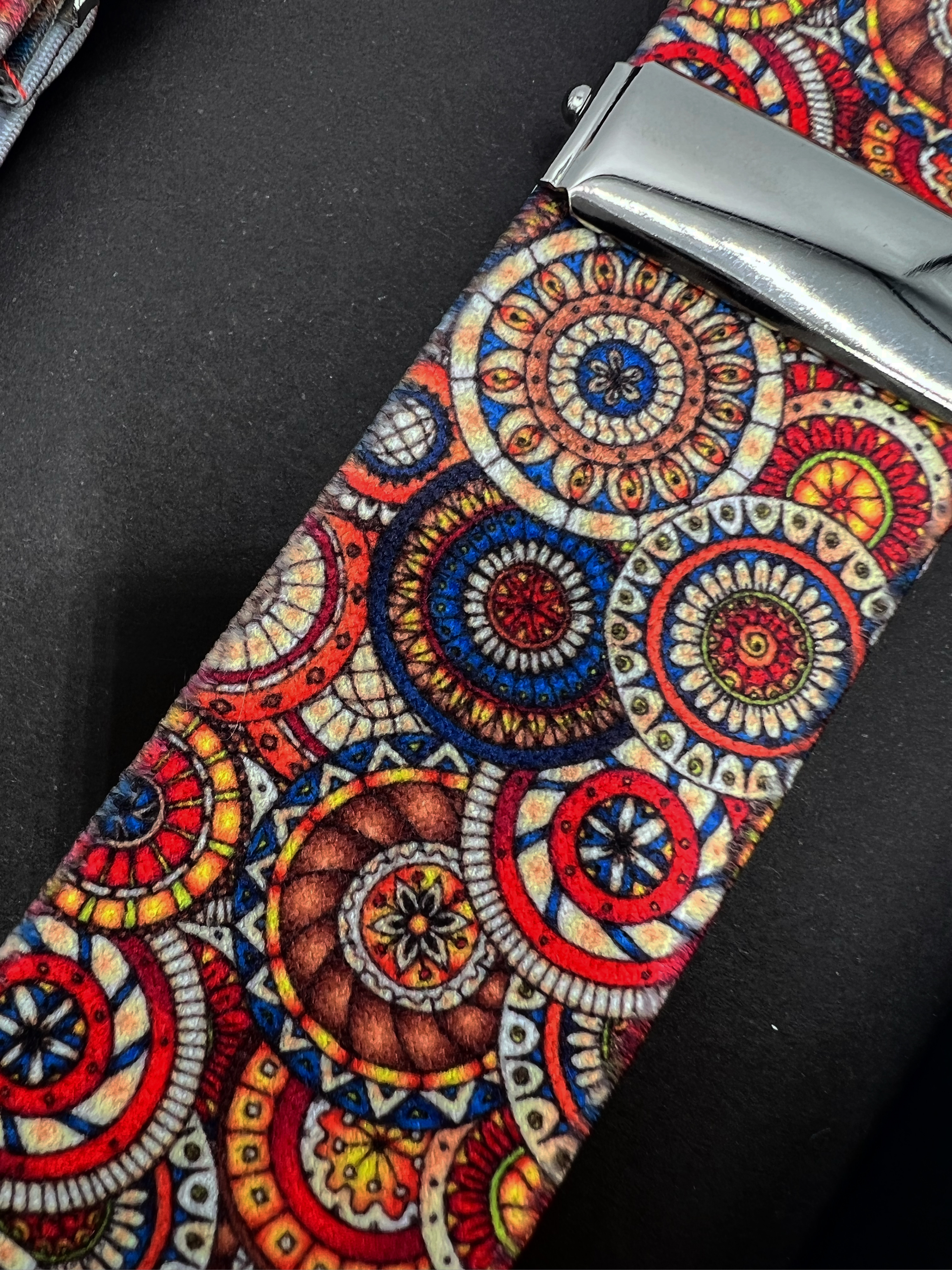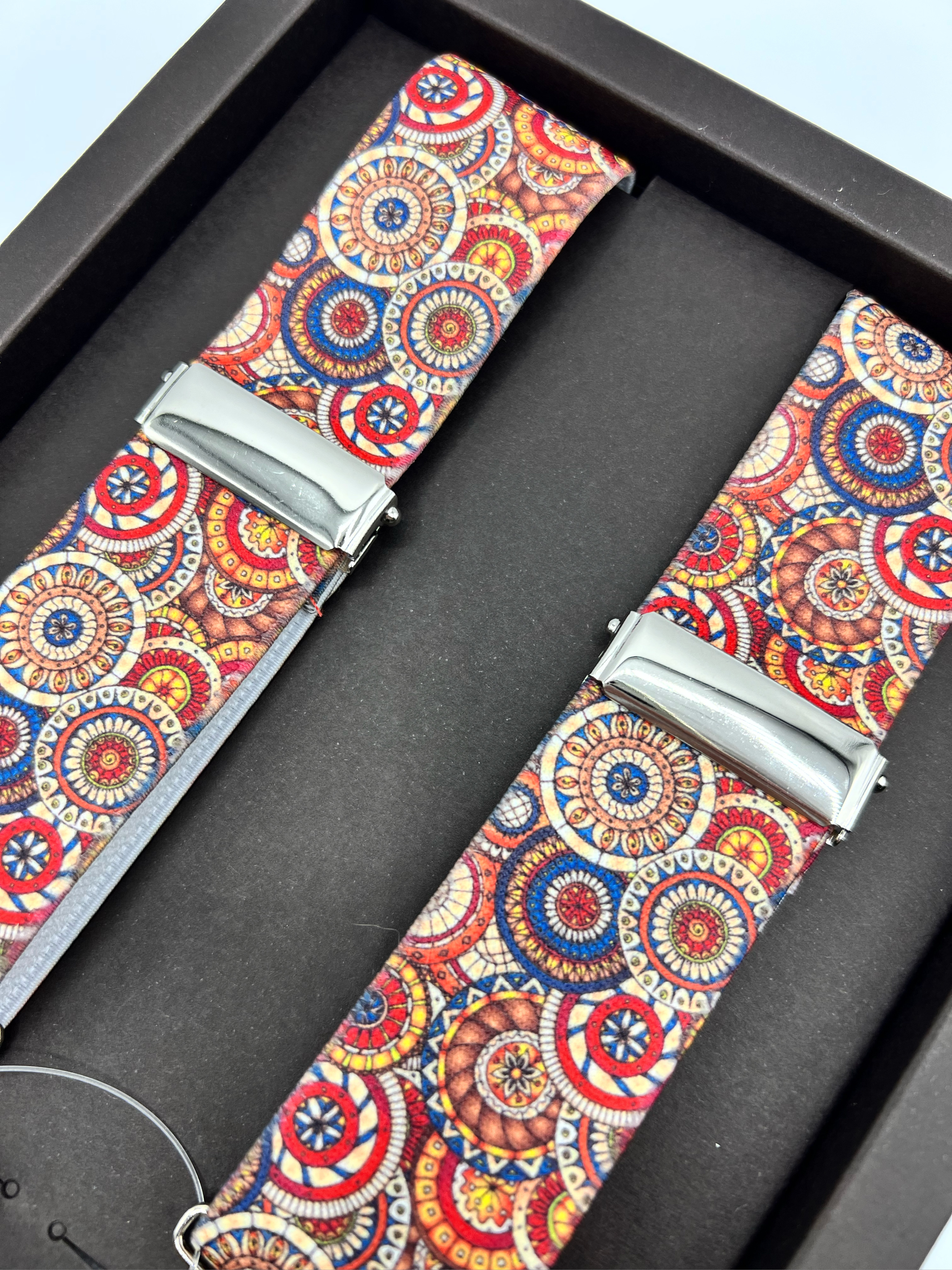 Tirantes en textil elástico ajustables, con dibujos de mandalas en rojo, naranja y azul. La anchura de los tirantes es de 3,5 cm. El largo es de 112 cms. mas 8 cms para regular según la altura. Se adapta hasta una persona de altura 1,94 cms.