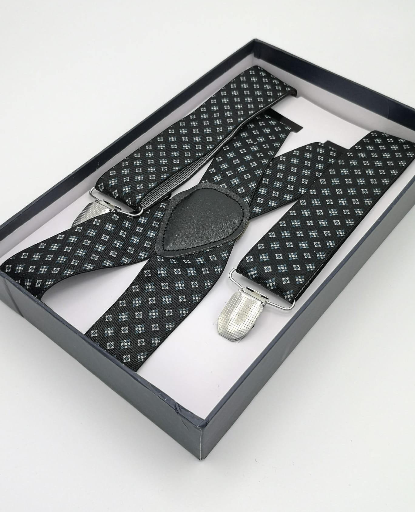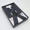 Tirantes elásticos y ajustables con cierre de metal y detalles en piel sintética. Tiras en color negro con estampados de cuadritos en blanco con flor en azul. Ancho tira: 3,5 cm.