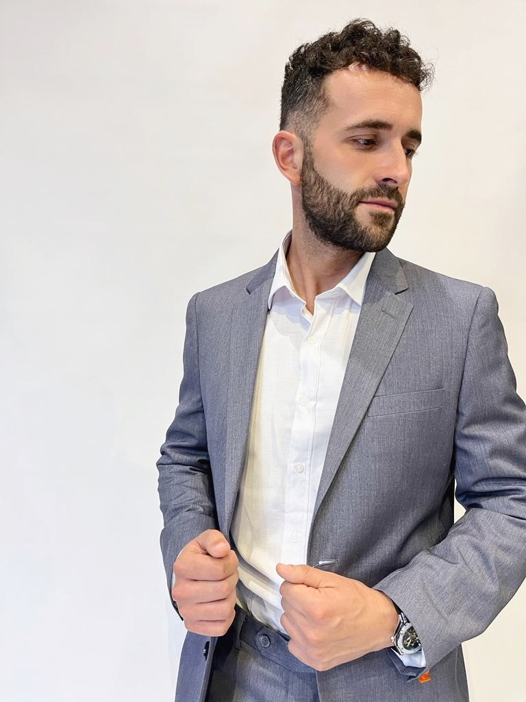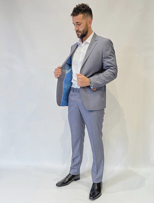 Traje linea Joven. Slim fit. Microestructura. Tejido exterior 75% poliéster y 25% viscosa. Forro azul 100% poliéster.