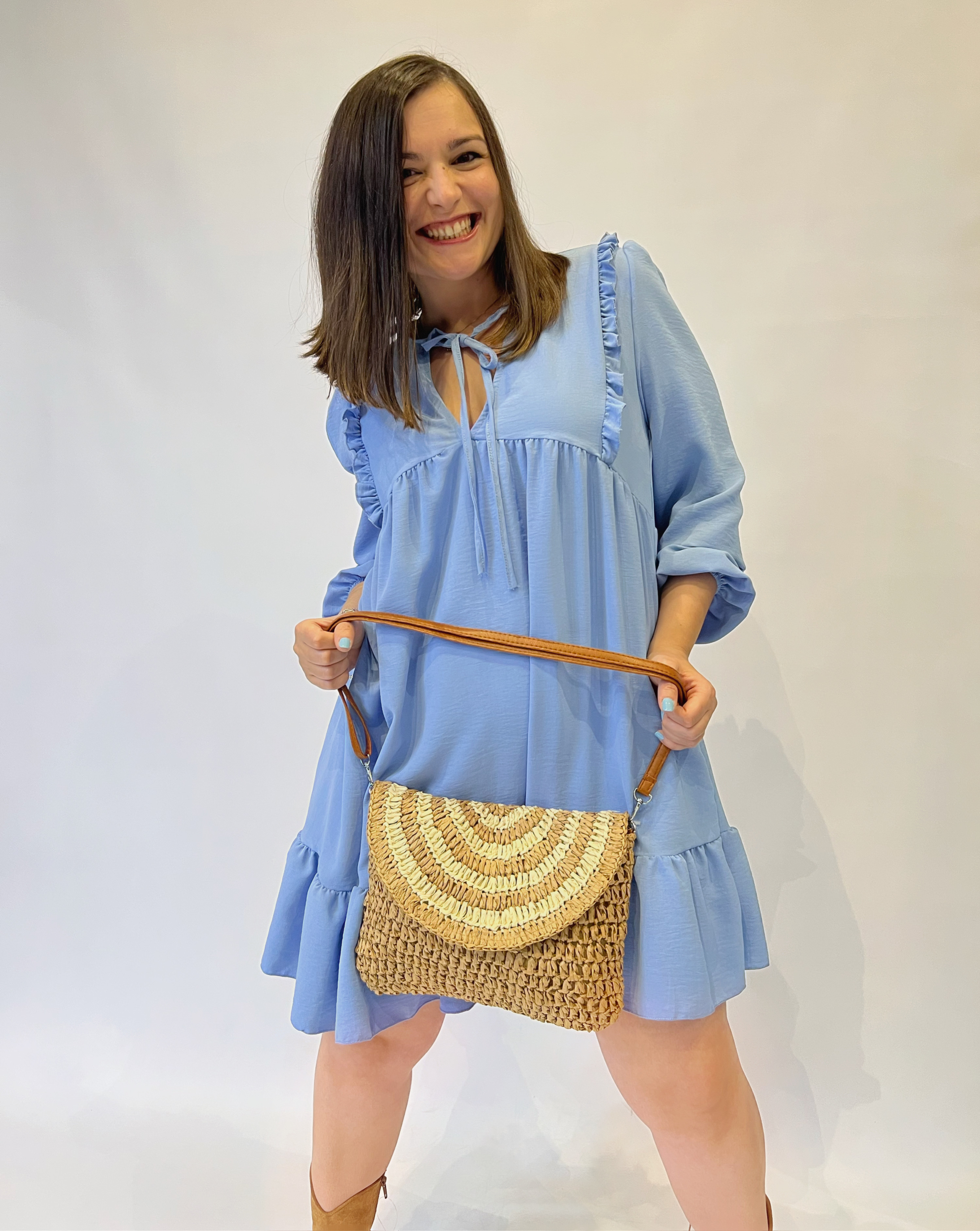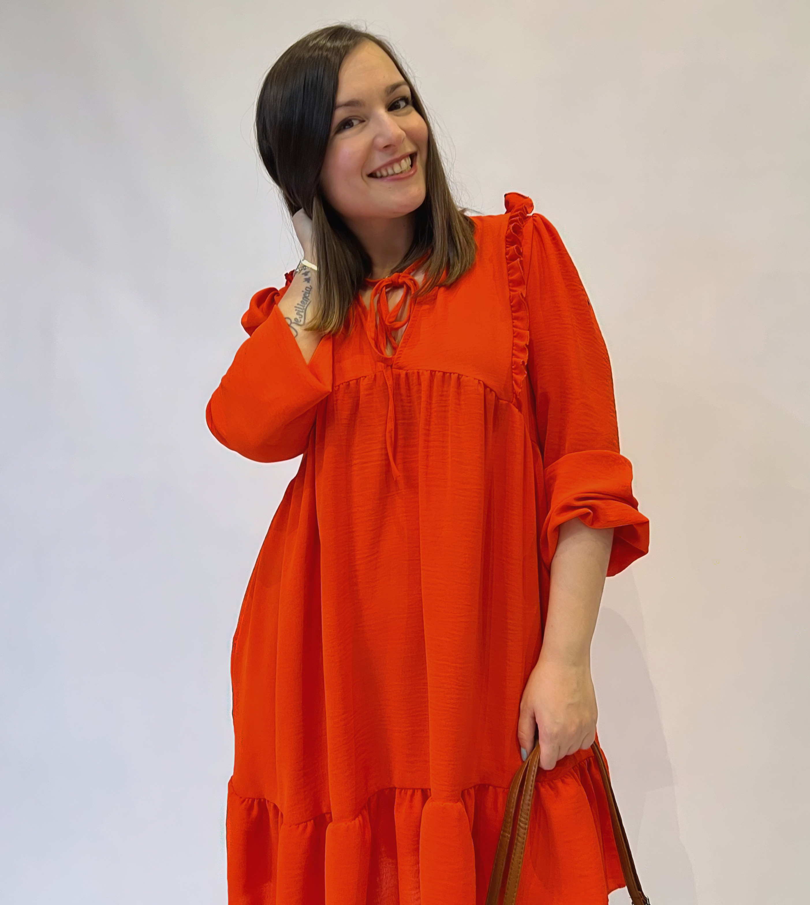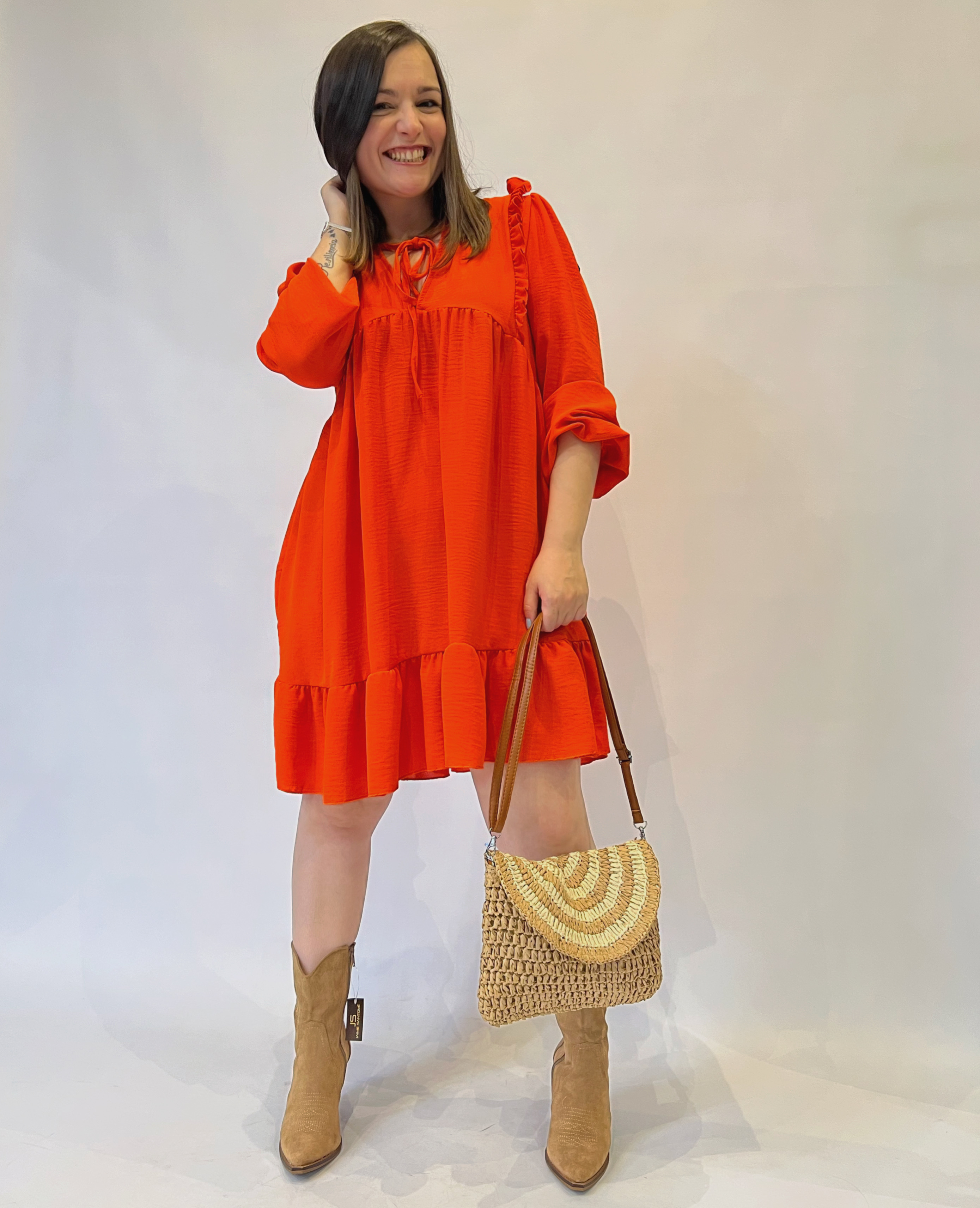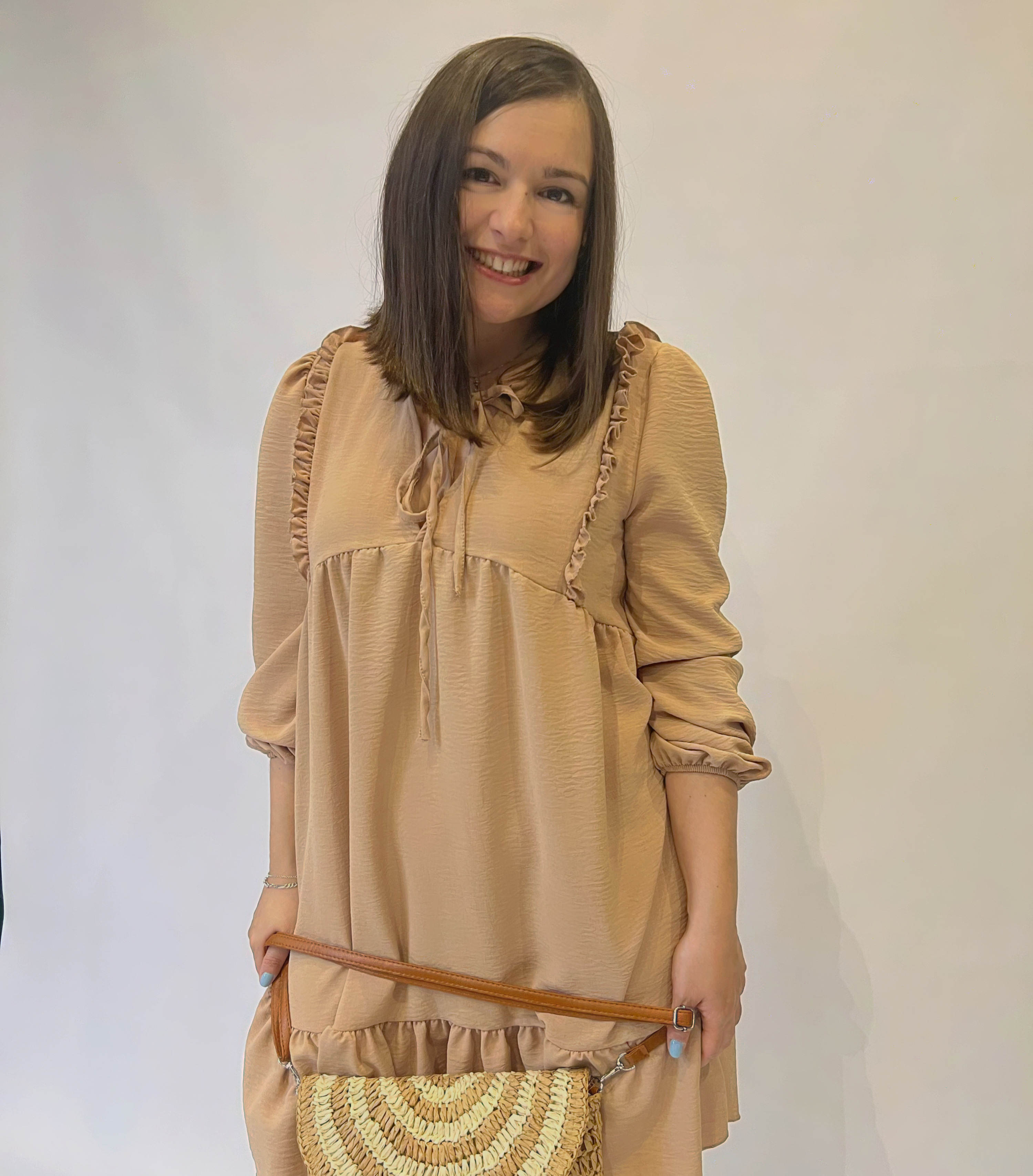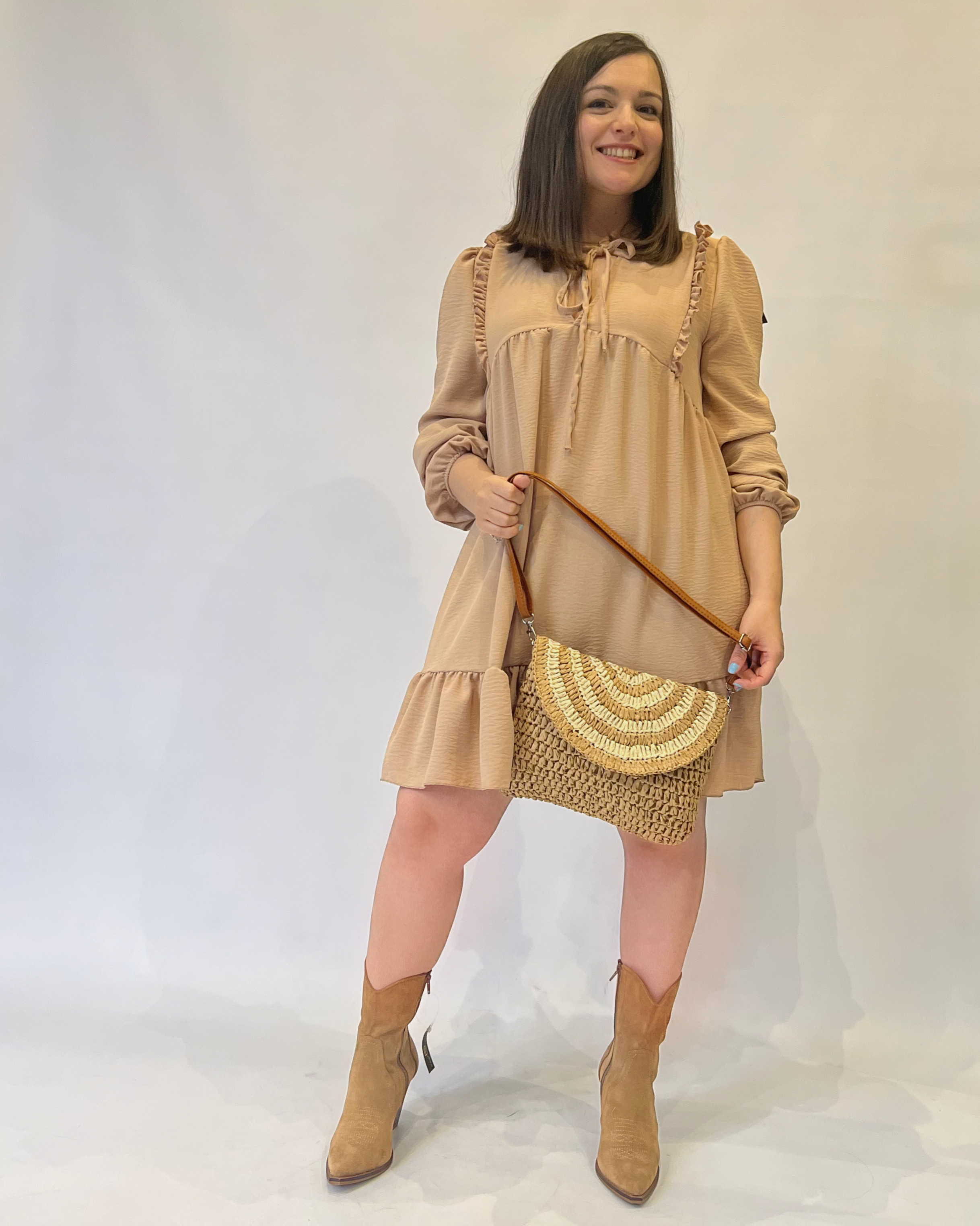 Vestido corto «baby doll» de cuello redondo con abertura frontal y lazada. Manga larga acabada en puño elástico. Detalle de mini volantes en superior. 95% poliéster y 5% elastano. Fabricado en Italia.