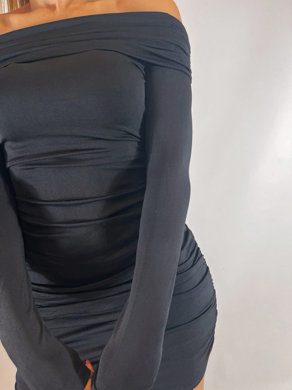 Vestido corto de manga larga, con escote tipo griego. Composición: 90% nylon y 10% elastano. Fabricado en Italia.