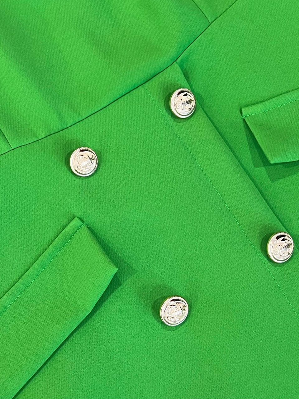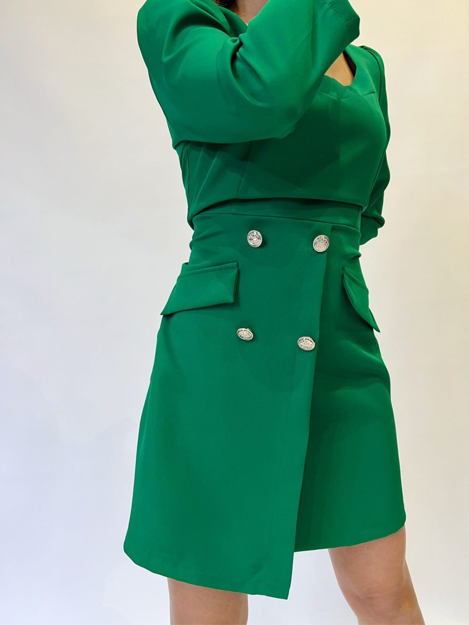 Vestido corto de escote corazón y manga francesa. Dos solapas de falsos bolsillos y detalle de cuatro botones en frontal. Dos pinzas en pechera y falda con solapa desde lateral derecho hasta el centro del frontal. Cierre de cremallera oculta en posterior. 95%`poliéster y 5% elastano. Made in Italy.