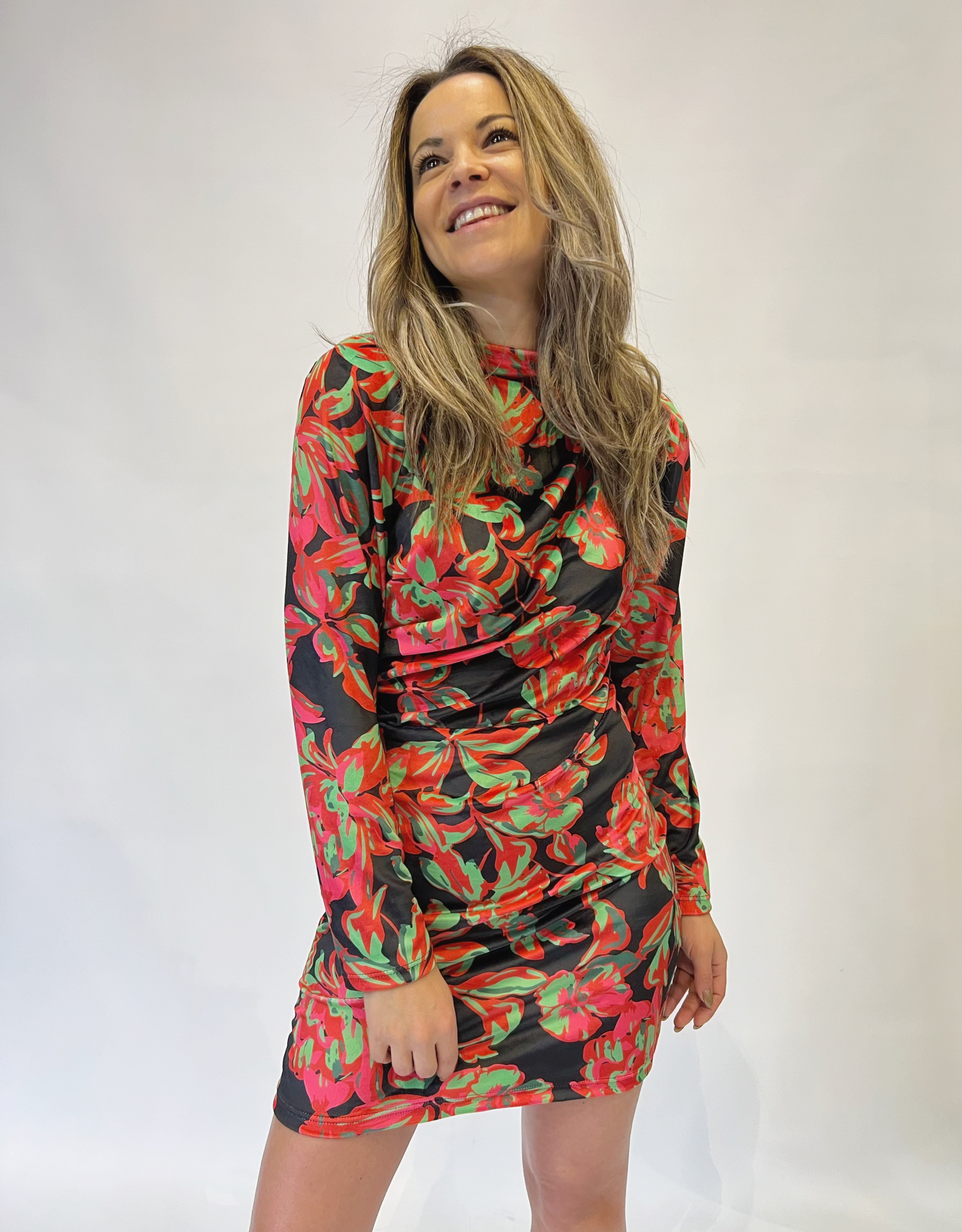 Vestido corto terciopelo, de cuello alto y manga larga. Estampado floral. Composición: 95 poliéster y 5% elastano. Made in Italy.