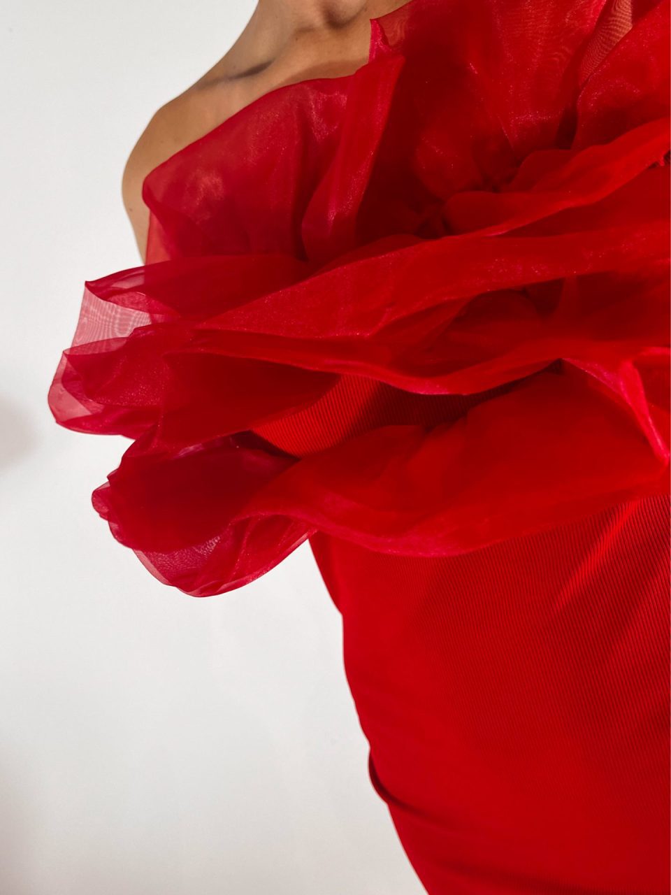 Vestido corto sin mangas y escote palabra de honor con tres capas de tull superpuestas. 95% poliéster y 5% elastano. Fabricado en Italia.