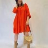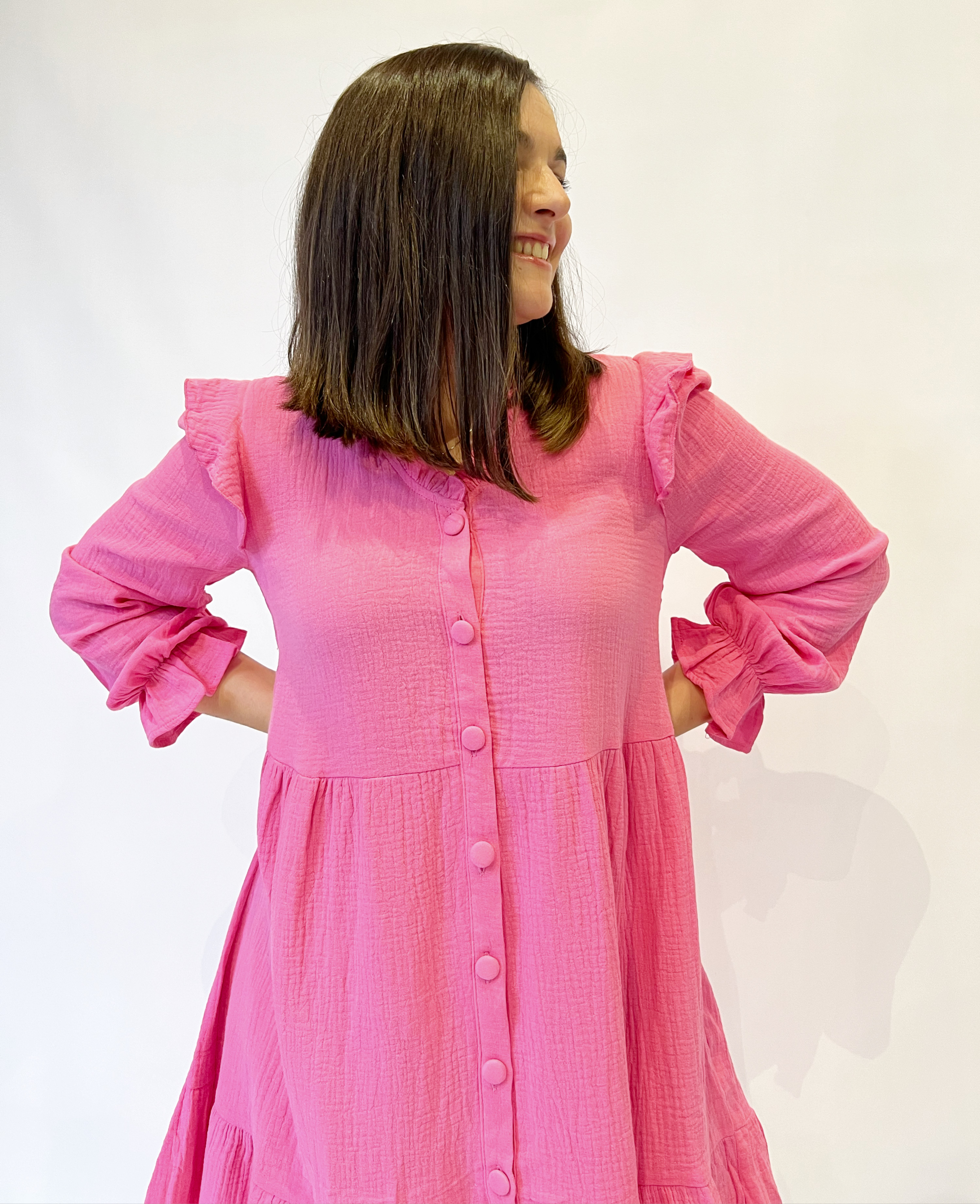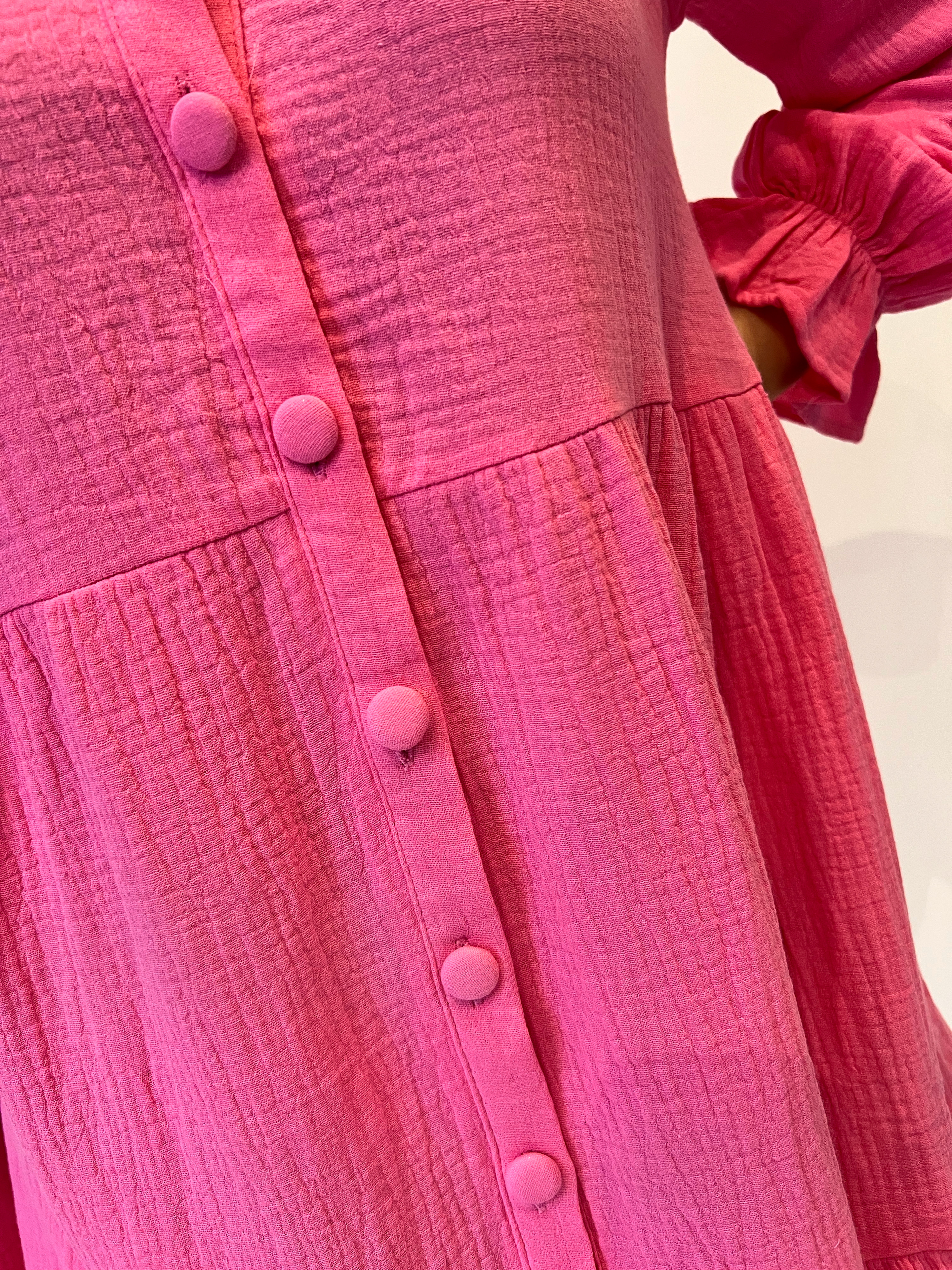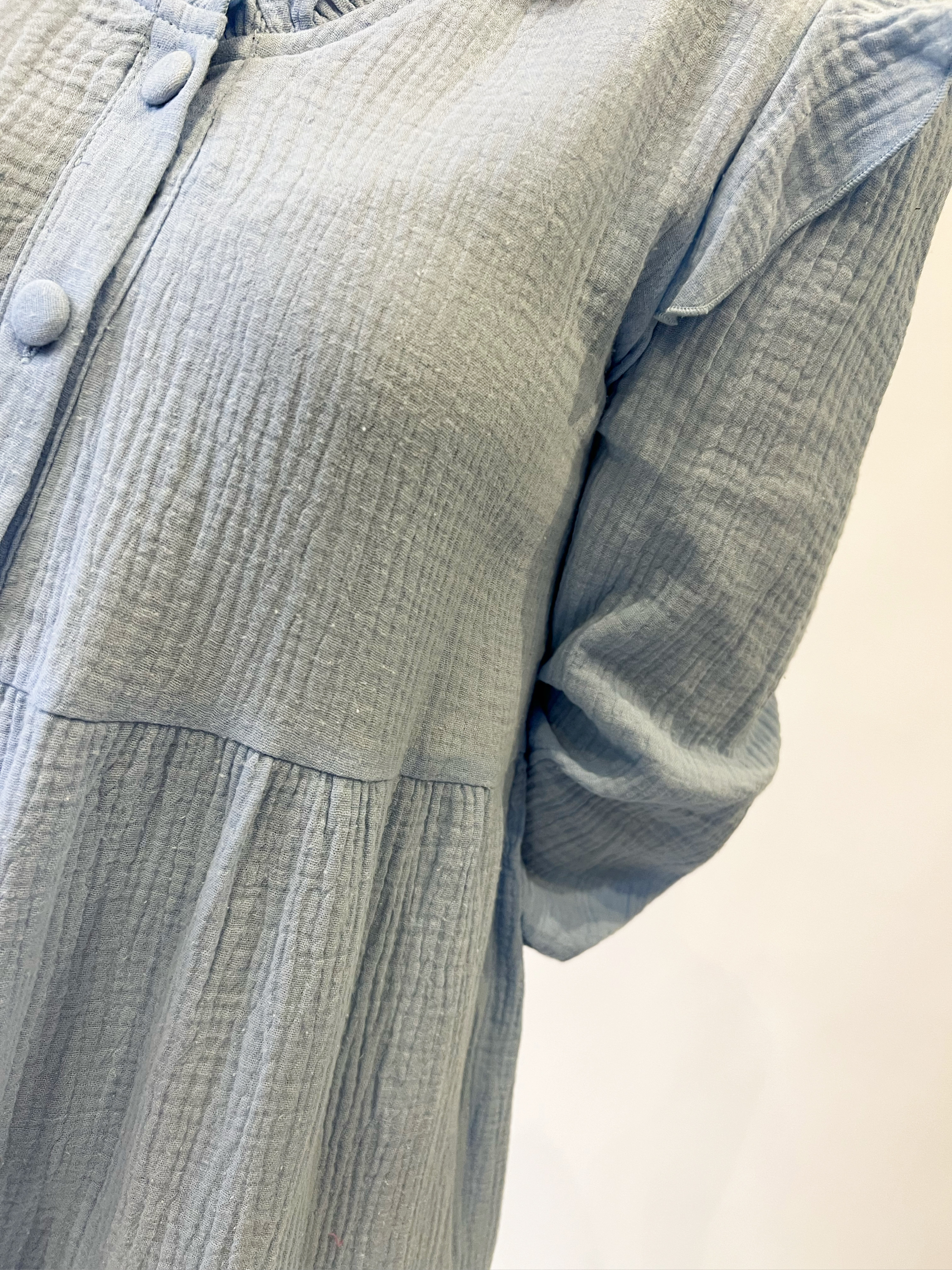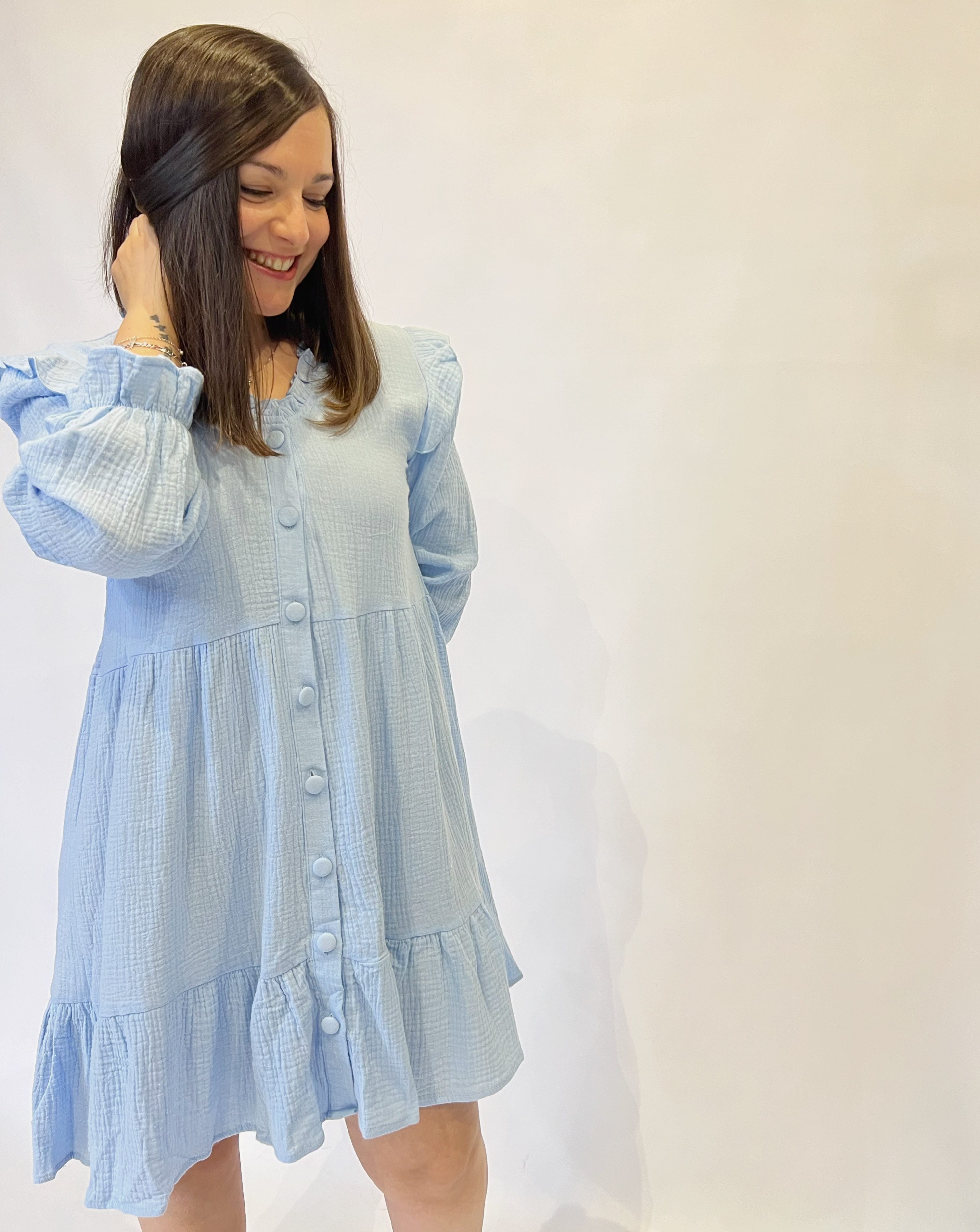 Vestido corto de manga larga con fruncido en superior puño y cuello pico. Extremos acabados en volante. Cierre frontal de botones. 100% algodón.