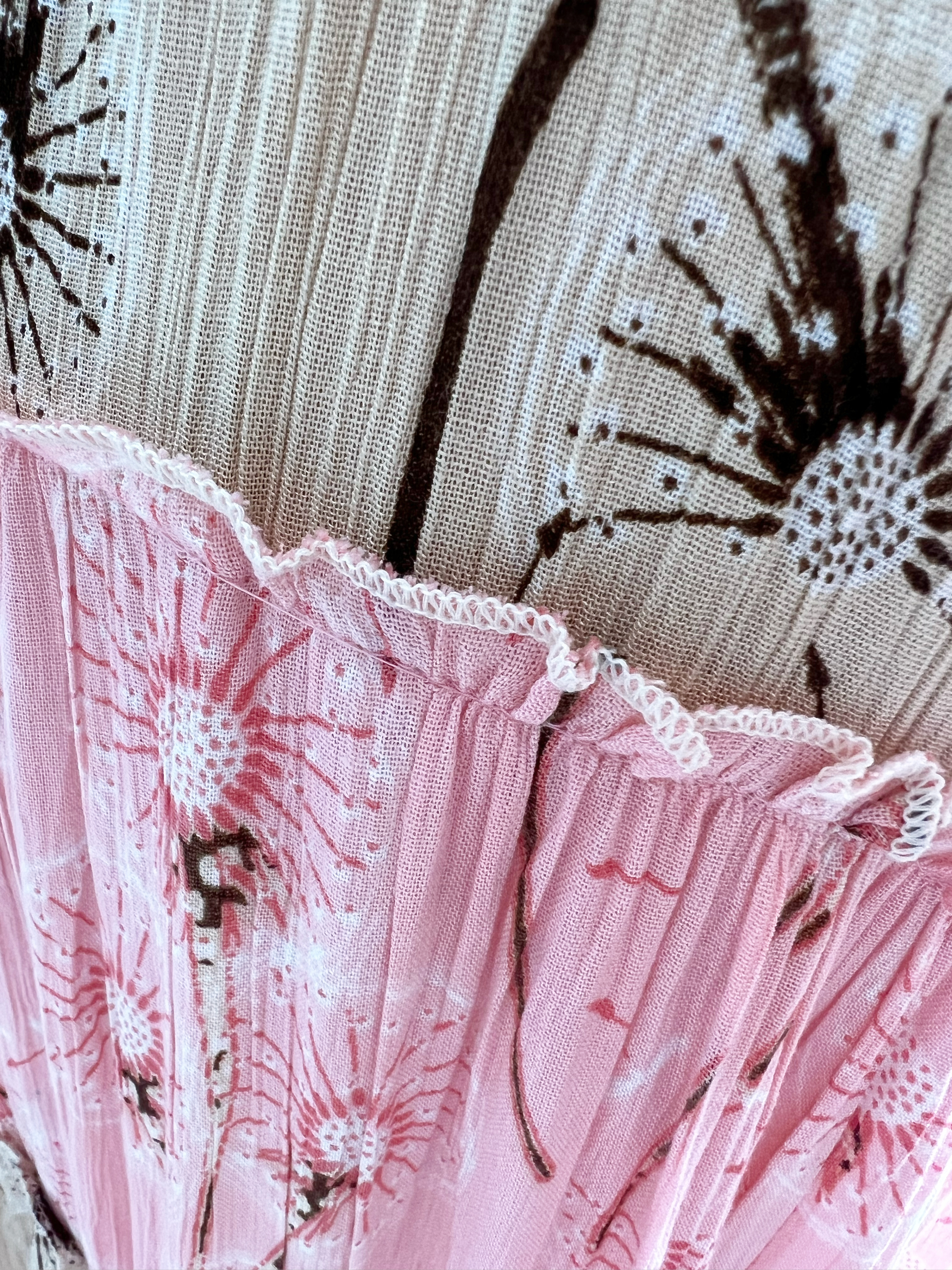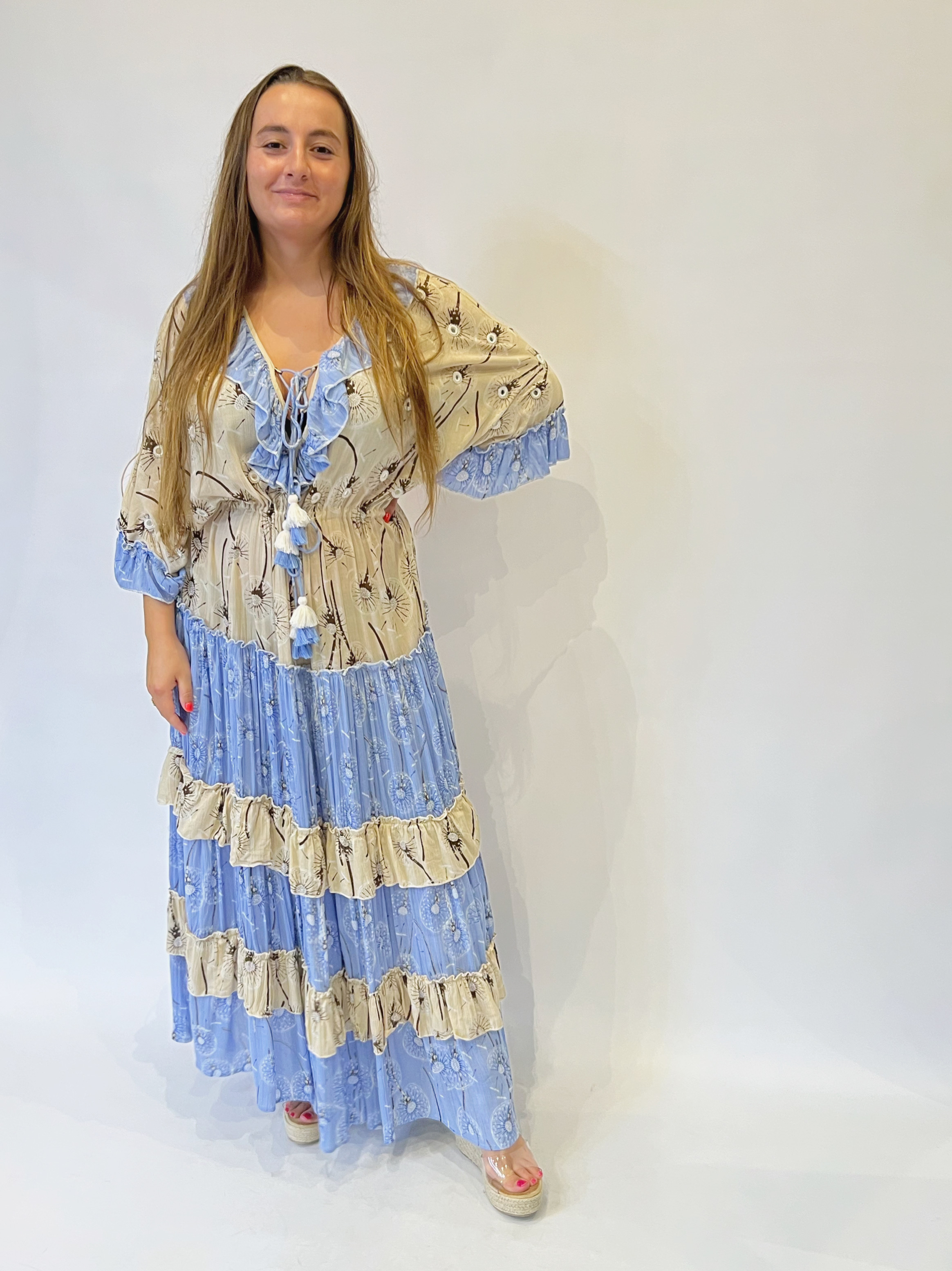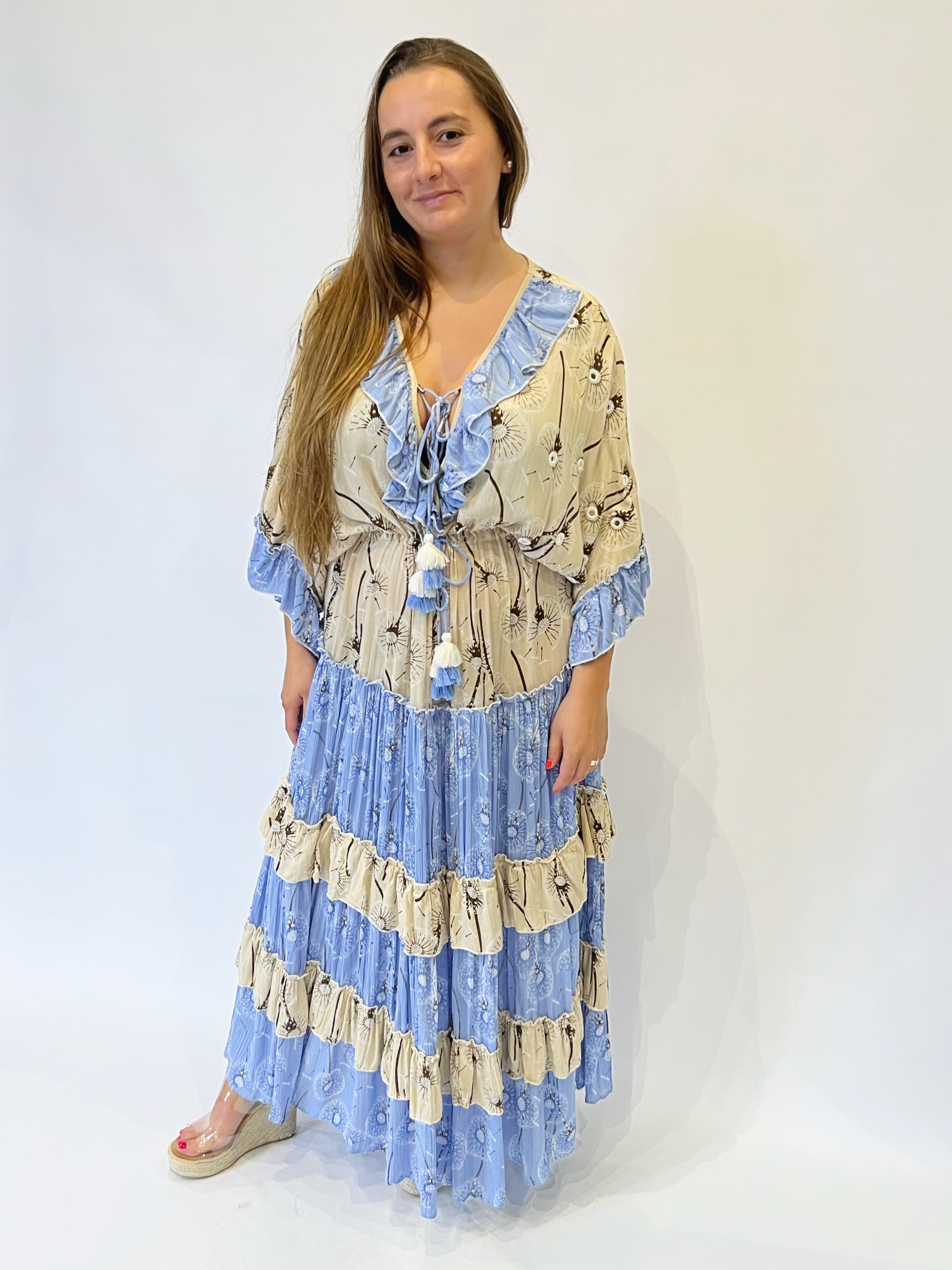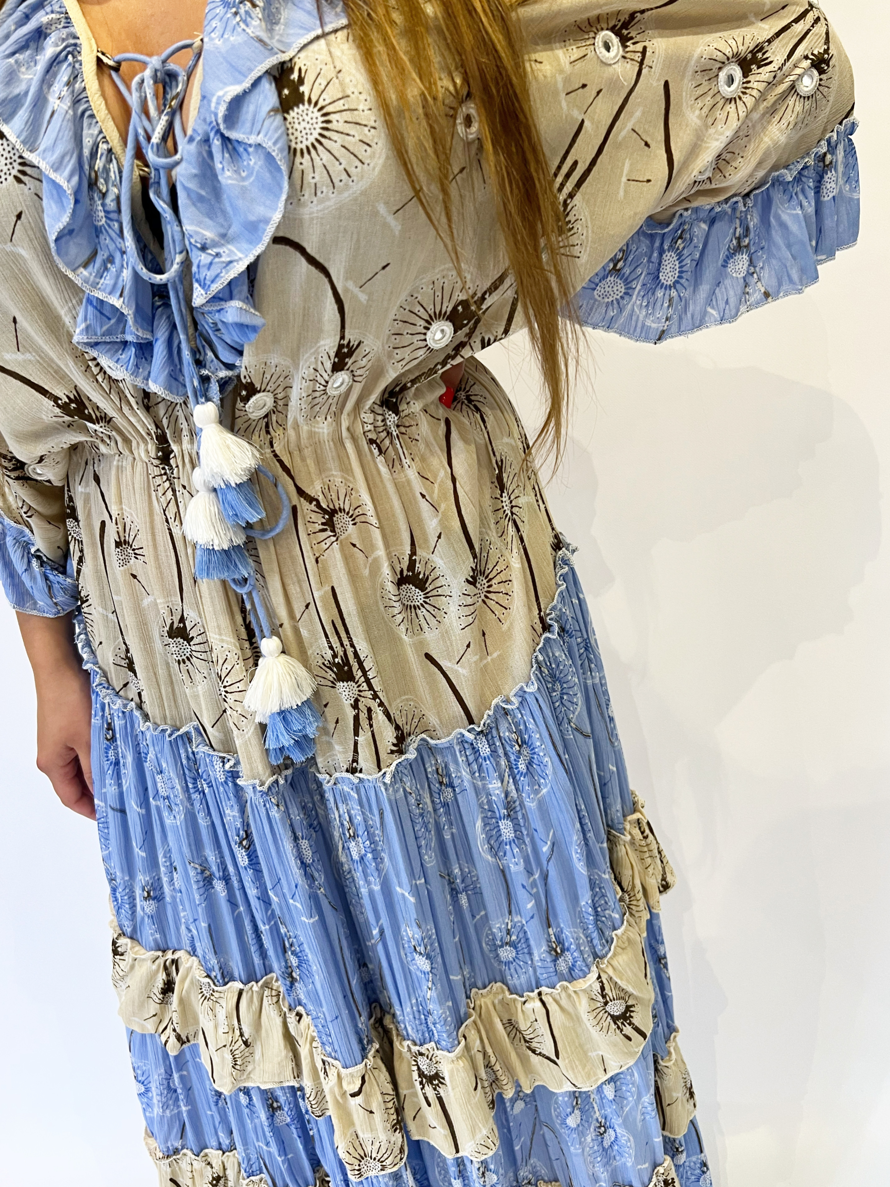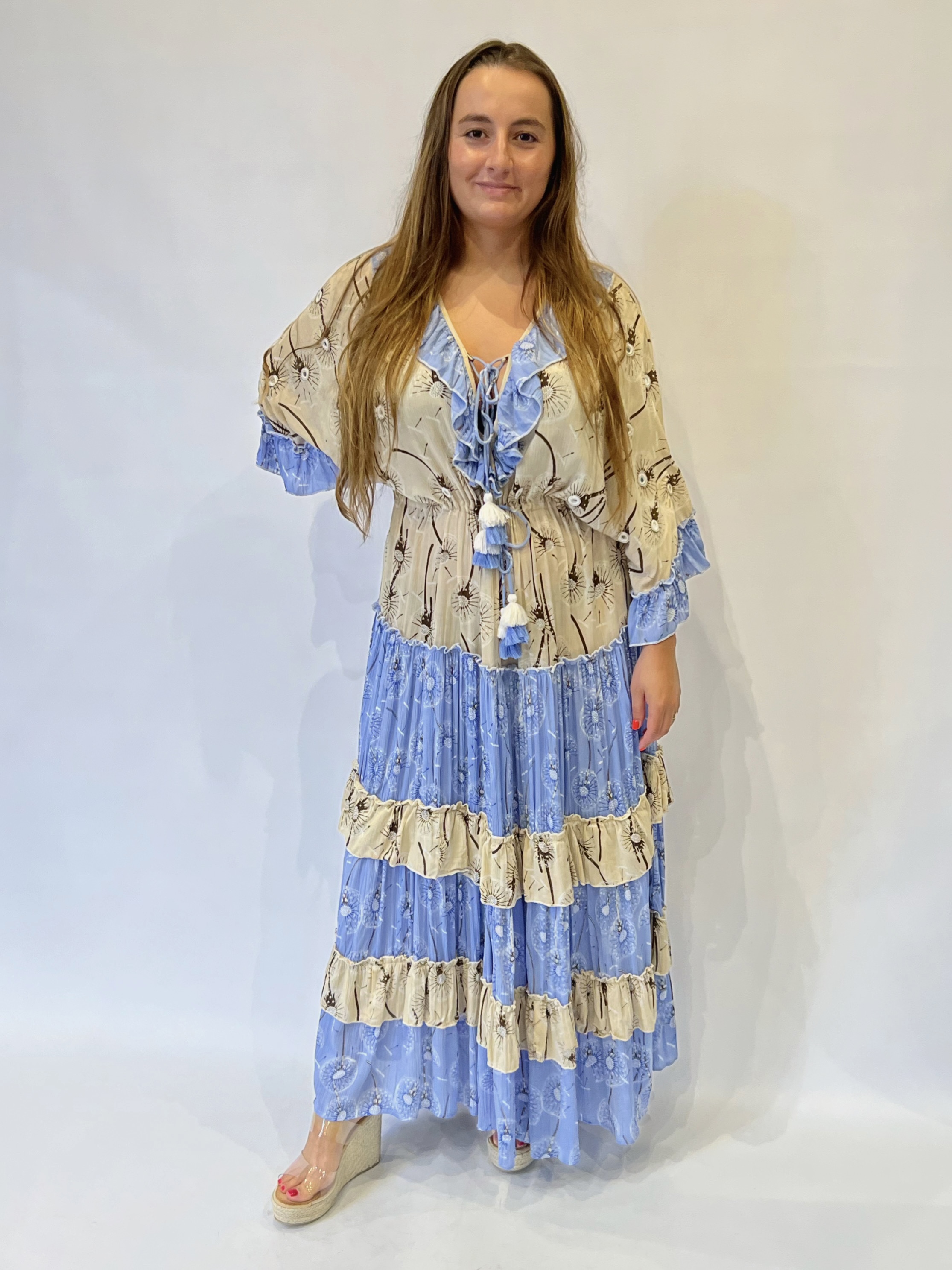Vestido largo con estampado de espejos mixto. Manga corta acabada en volante. Cuello pico con volante y escote trenzado de cordones acabados en pompón. Volantes en falda.. Forro interior en blanco. 100% viscosa. Fabricado en India.