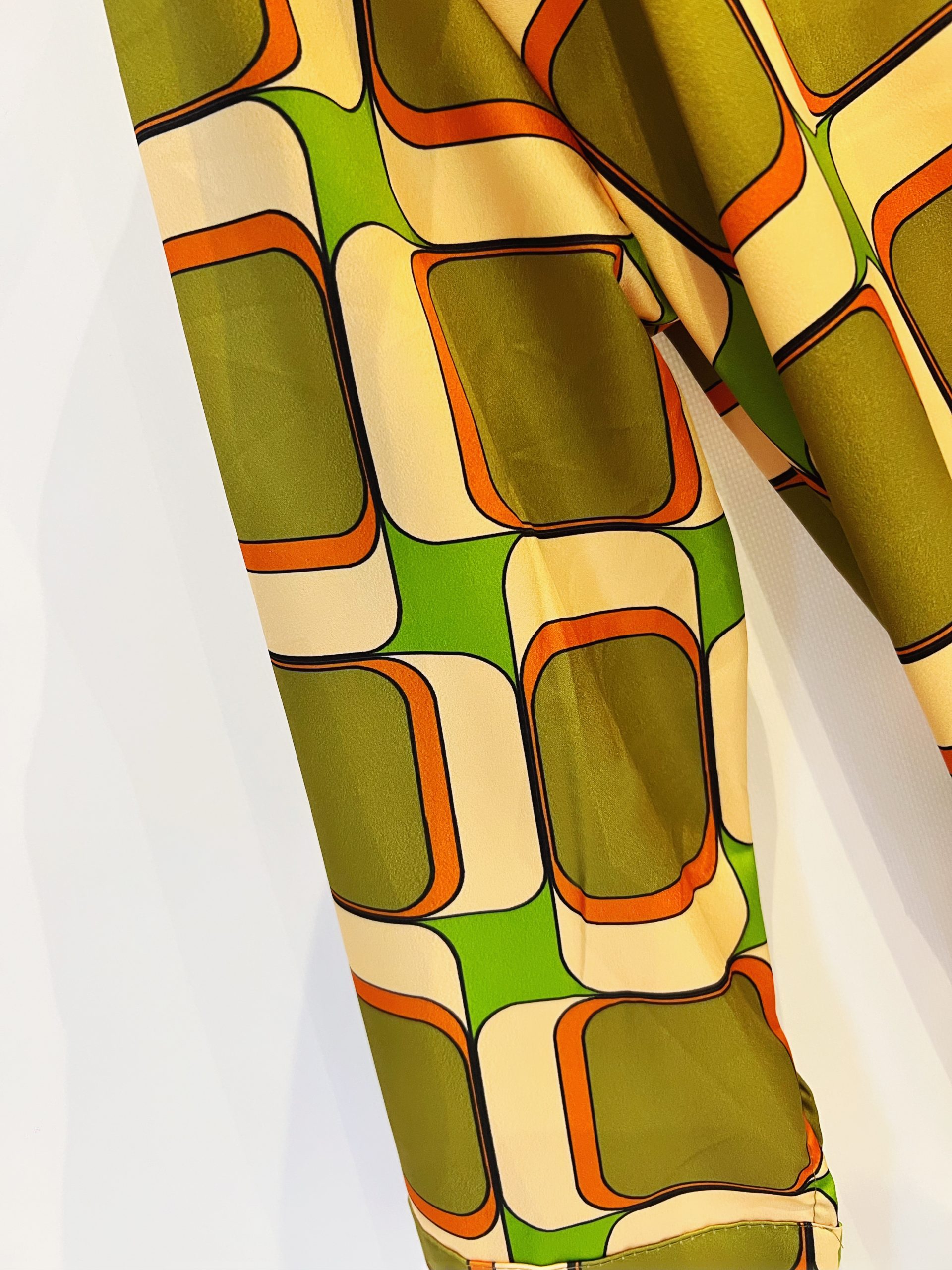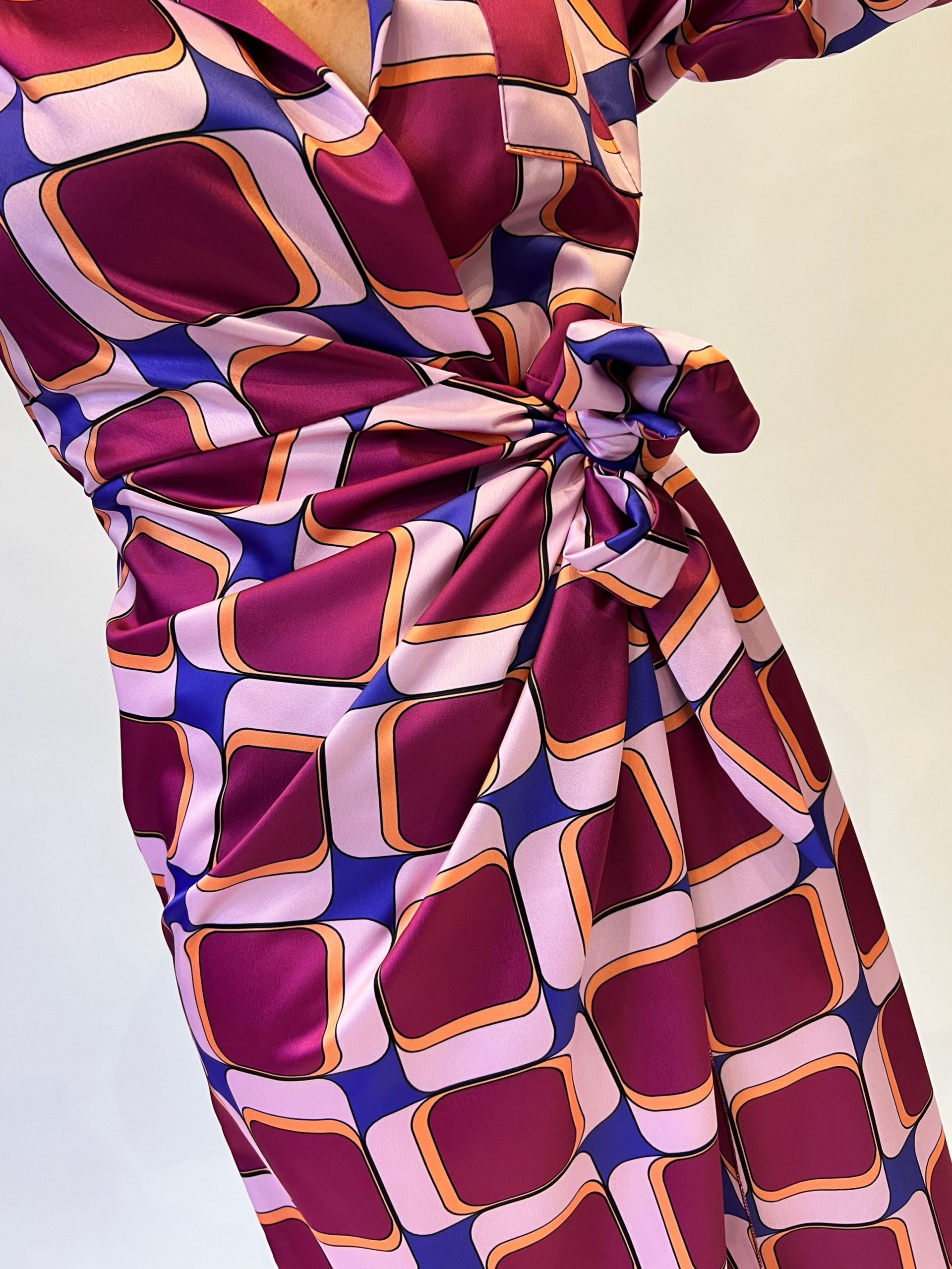Vestido largo con estampado simétrico, de cuello camisero y escote cruzado en pico. Manga larga acabada en puño con botón de cierre. Un bolsillo en pecho. Cierre de lazada interior en lateral derecho y exterior en lateral izquierdo. 55% algodón y 45% poliéster.