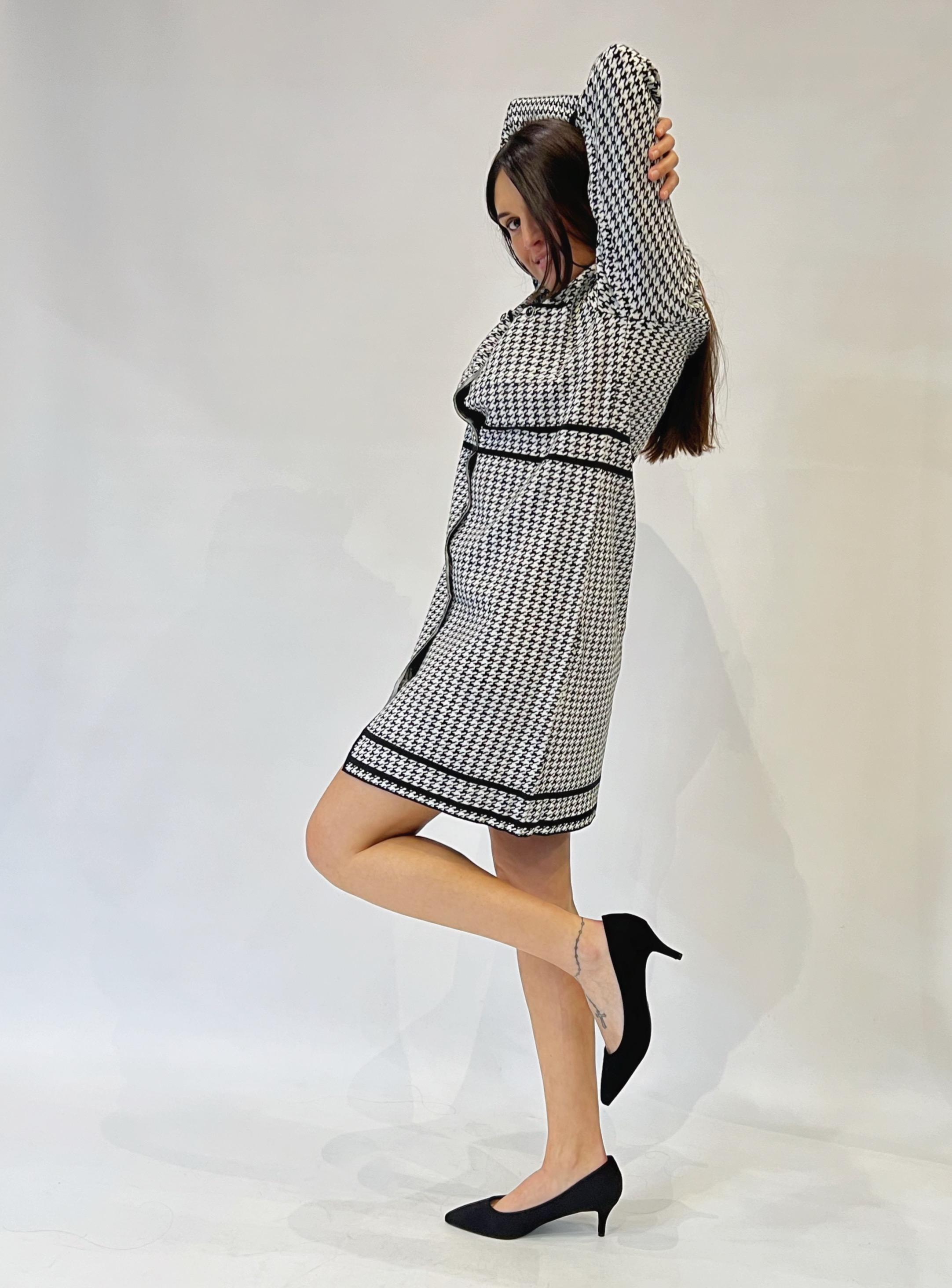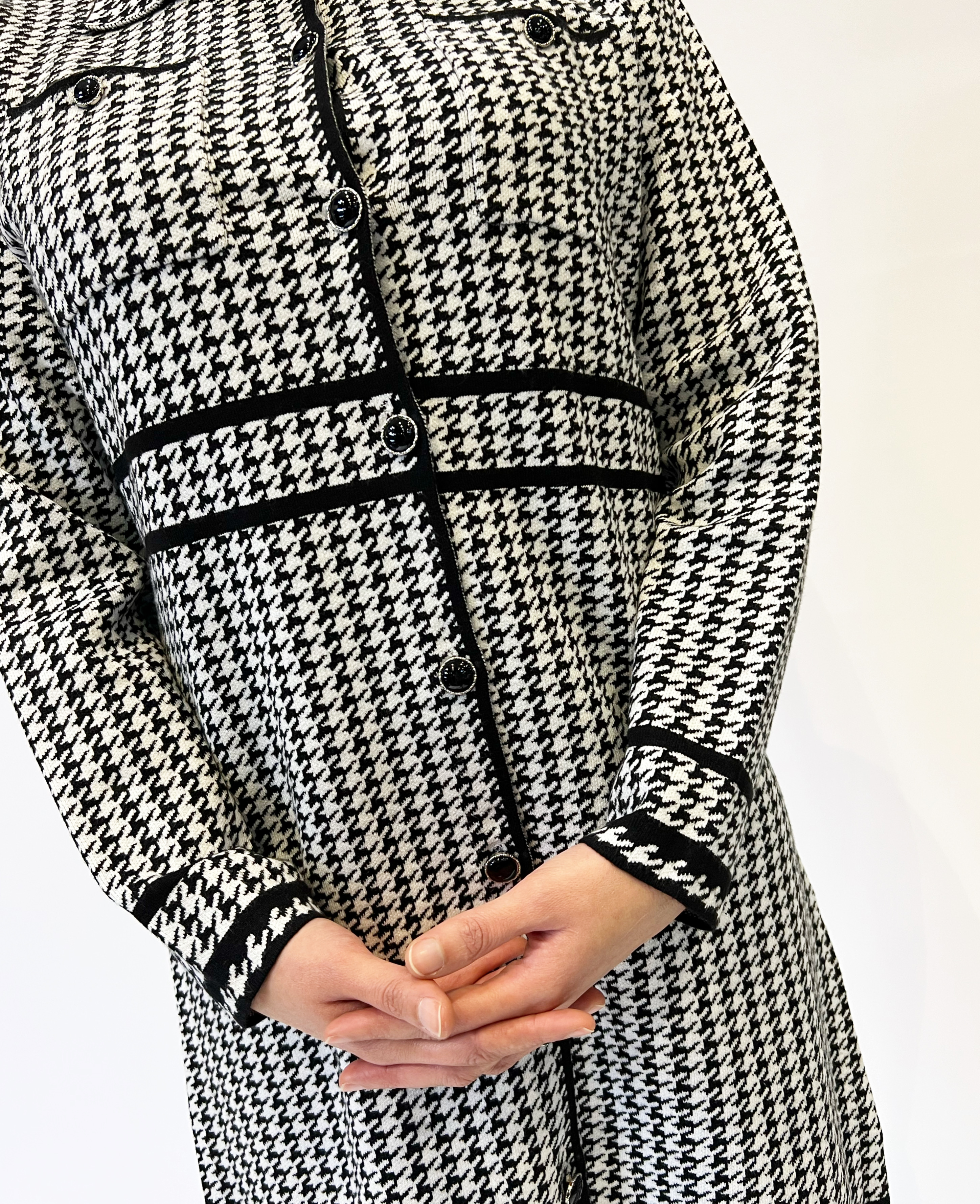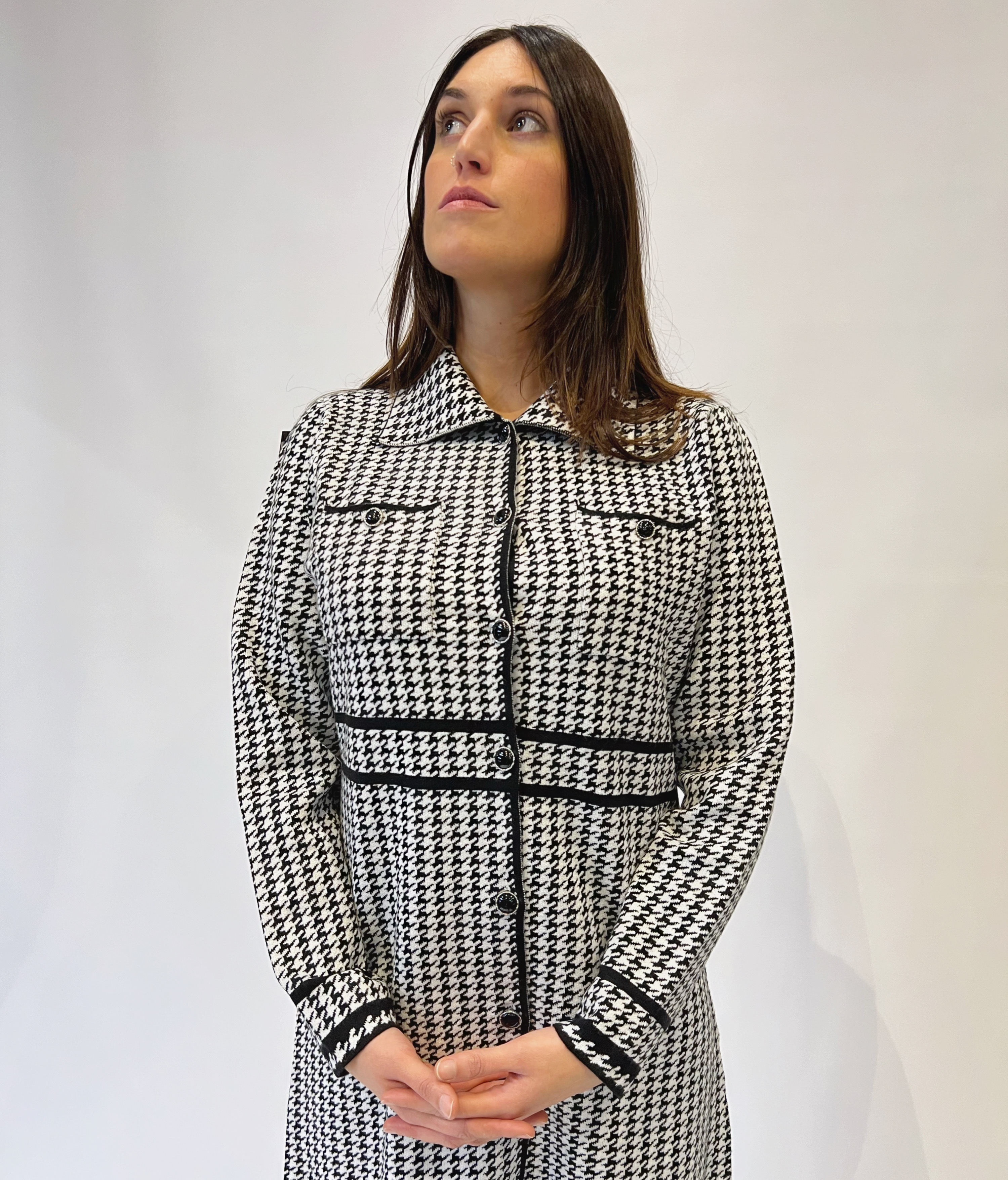 Vestido estampado pata de gallo de cuello solapa y manga larga. Dos bolsillos frontales en pecho con botón. Cierre frontal de botones perlados negros sobre círculo de metal platreado. Composición: 30% Poliamida, 30% Viscosa, 20% Modal y 20% Elastano.