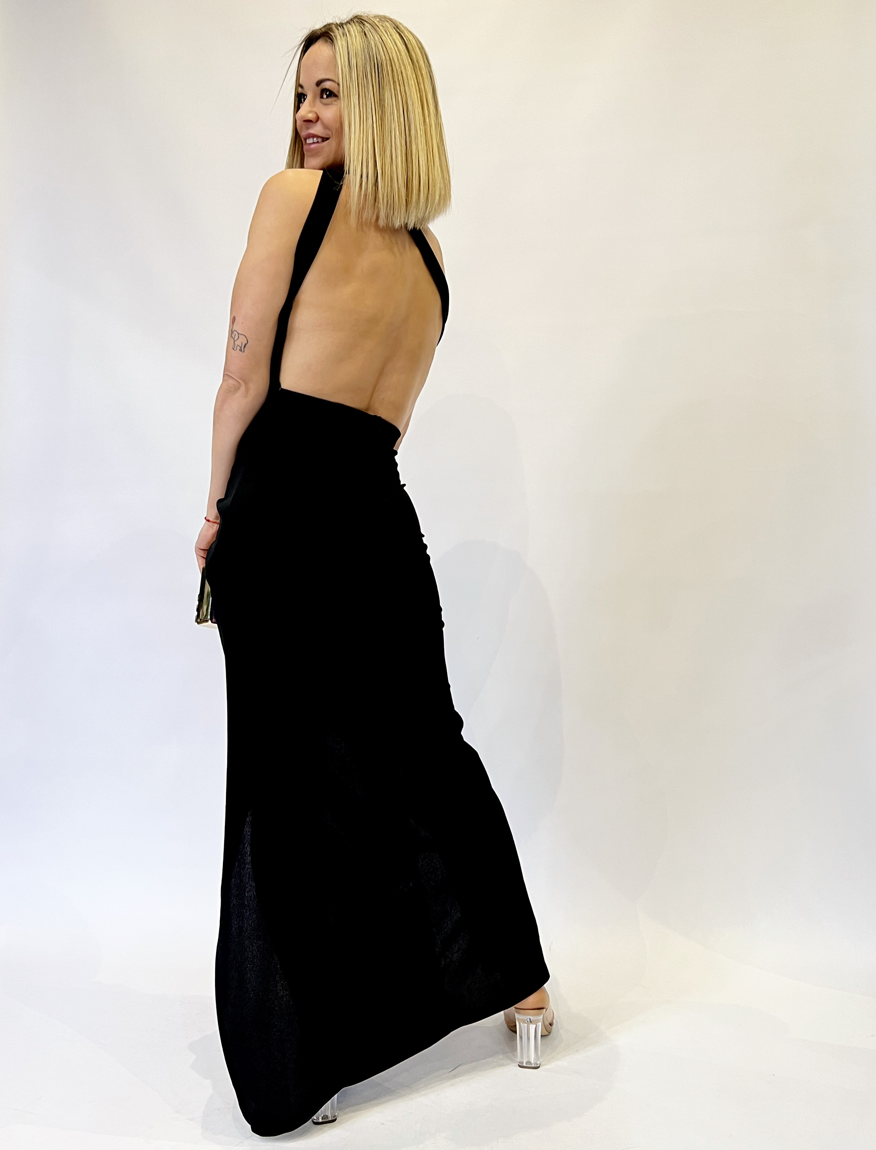 Vestido largo ajustado, sin mangas y espalda al aire. Escote asimétrico estilo Greco-Romano. Abertura cruzada en delantero. Cierre trasero de cremallera invisible. Composición: 90% poliéster y 10% elastano. Fabricado en Italia.