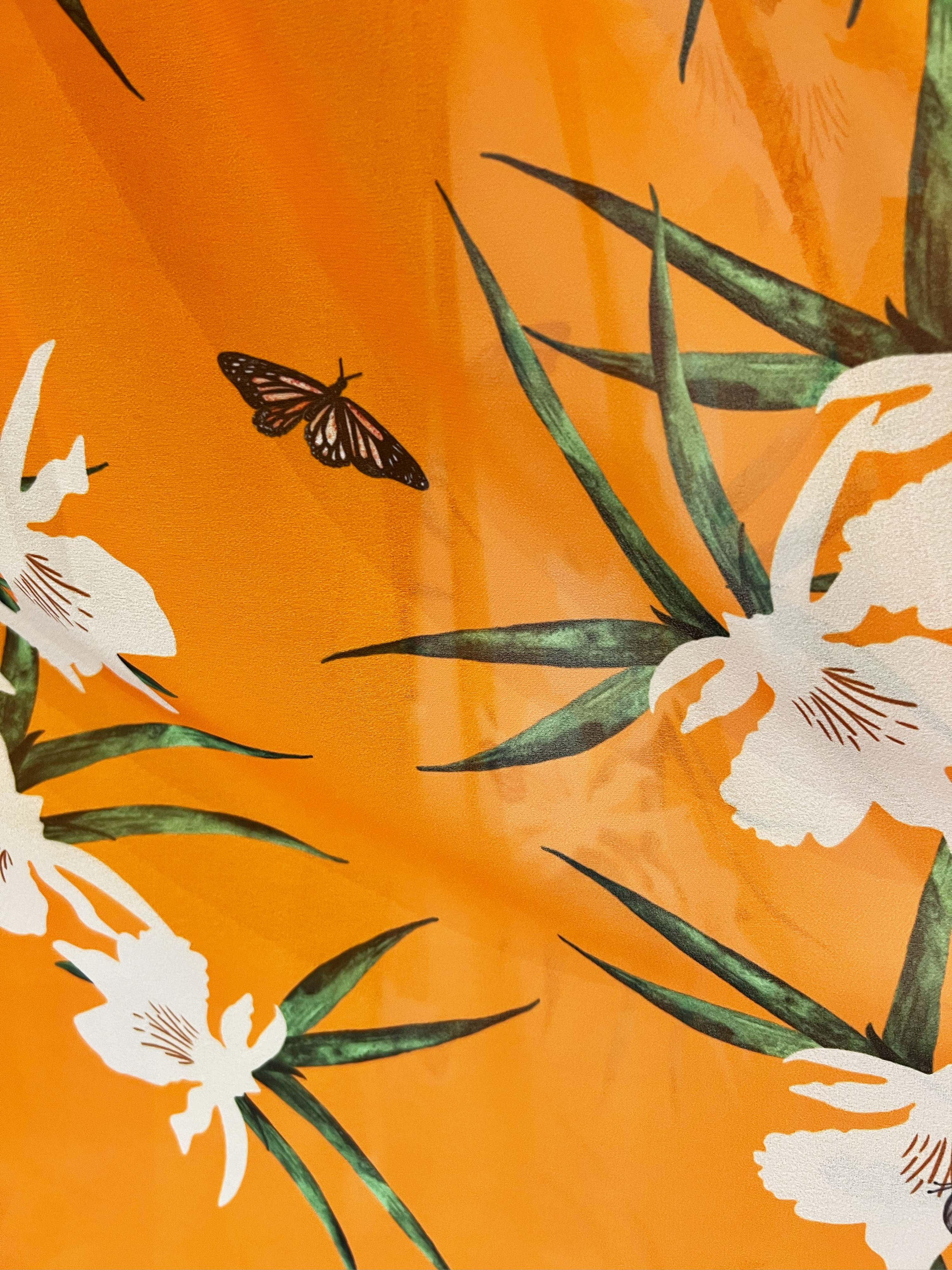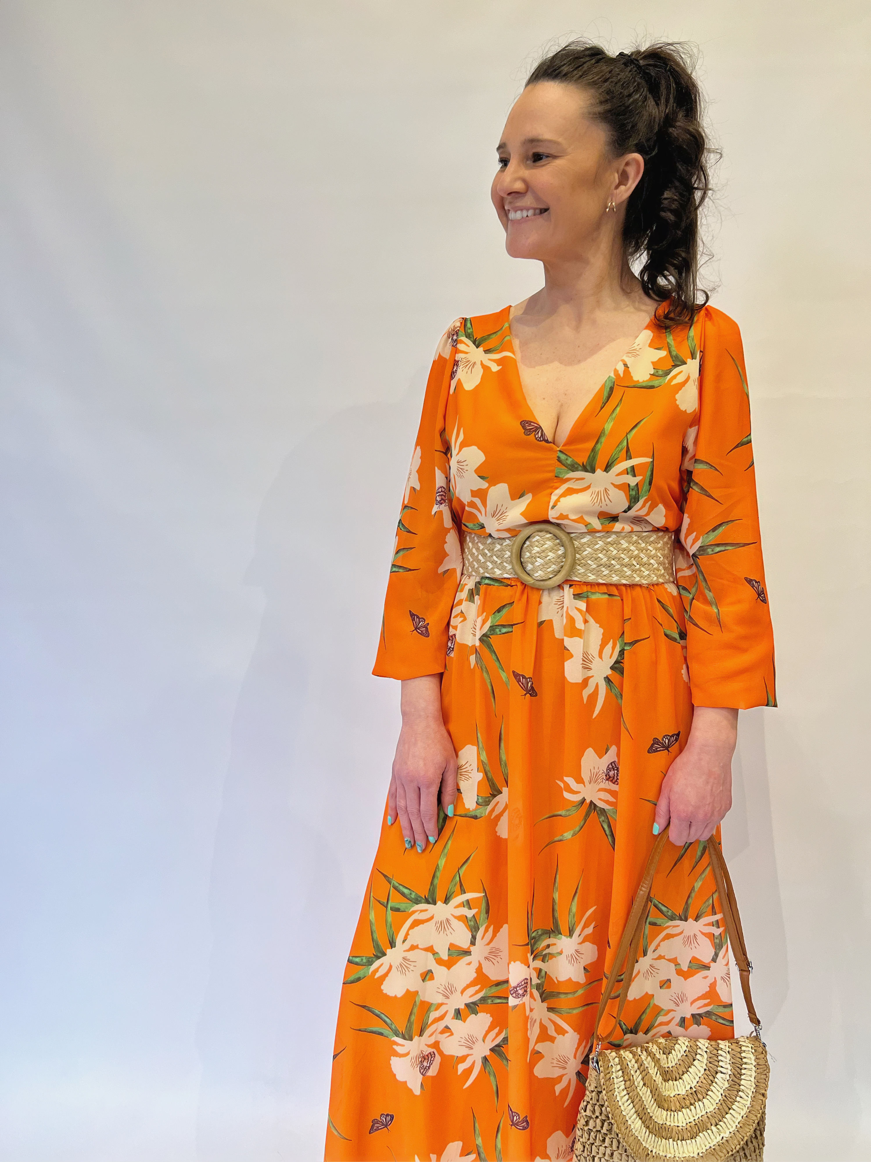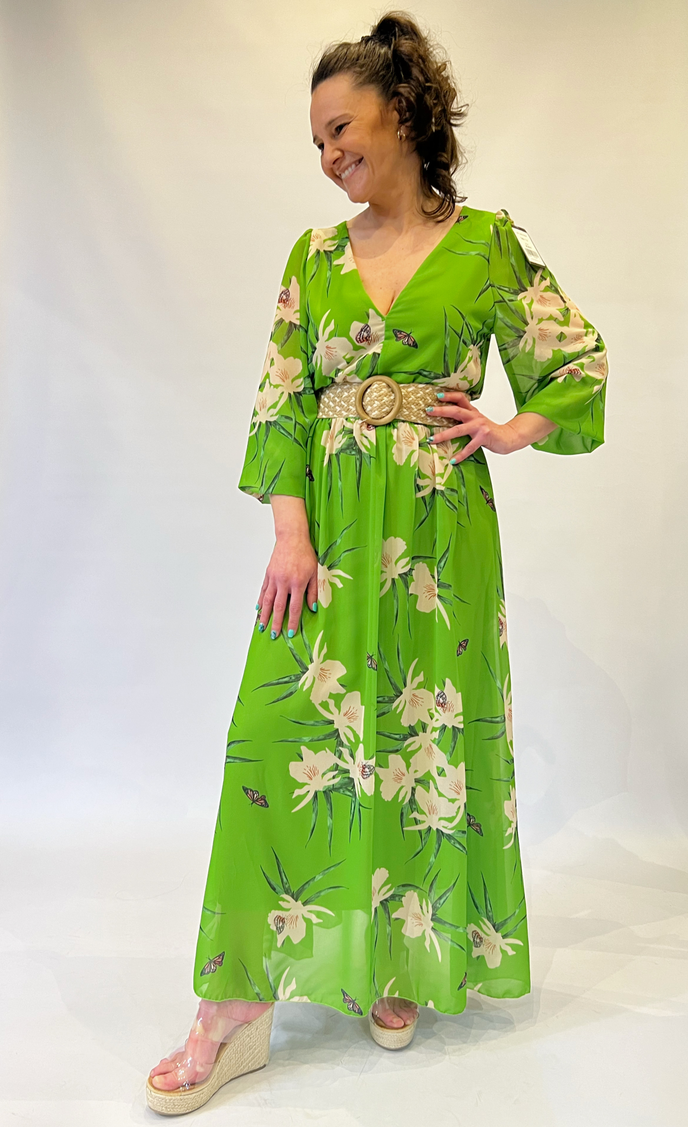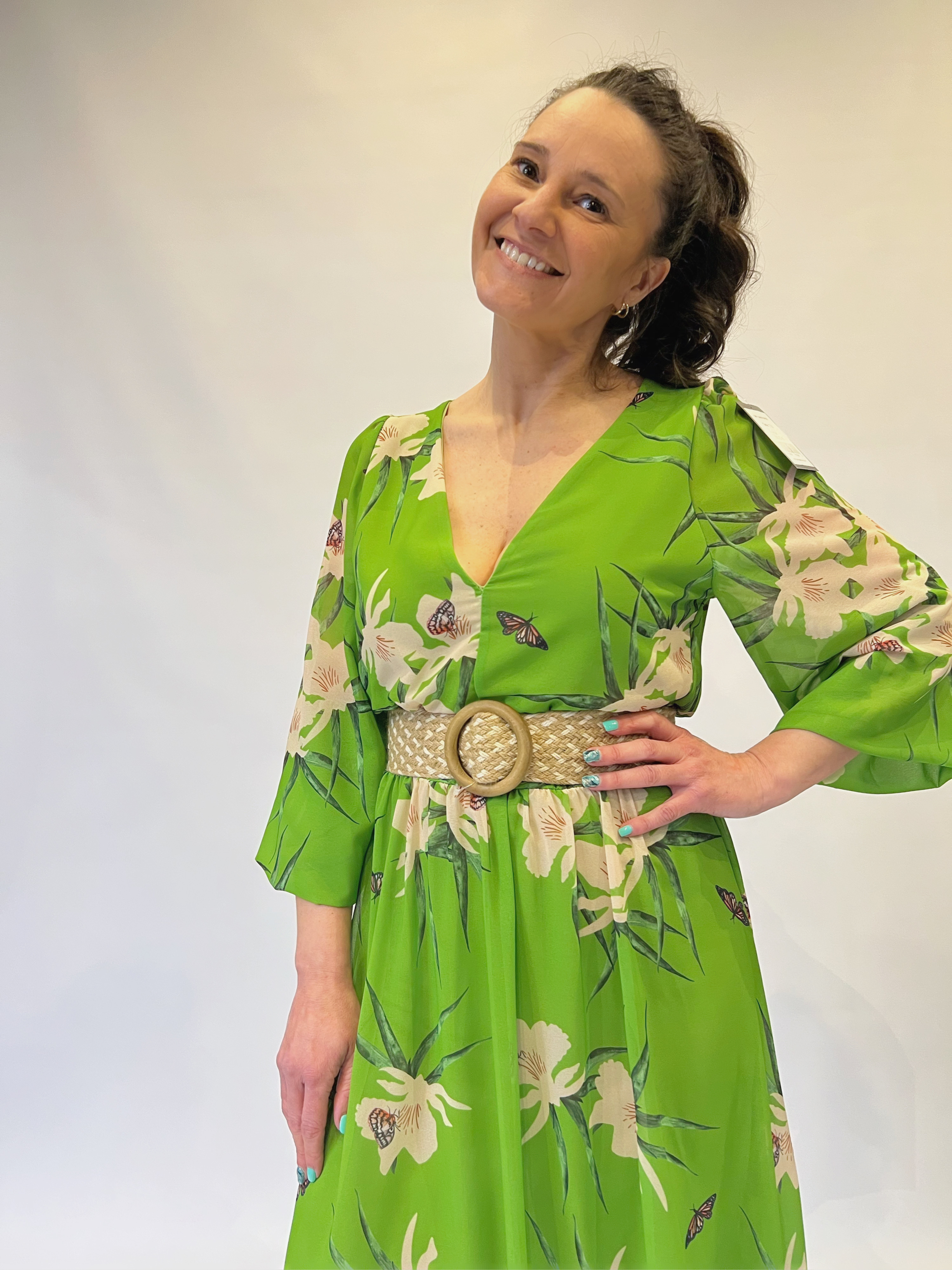 Vestido largo estampado floral de manga larga acabada en fruncido y escote pico. Elástico en cintura. Forro interior. 95% poliéster y 5% elastano. Made in Italy.