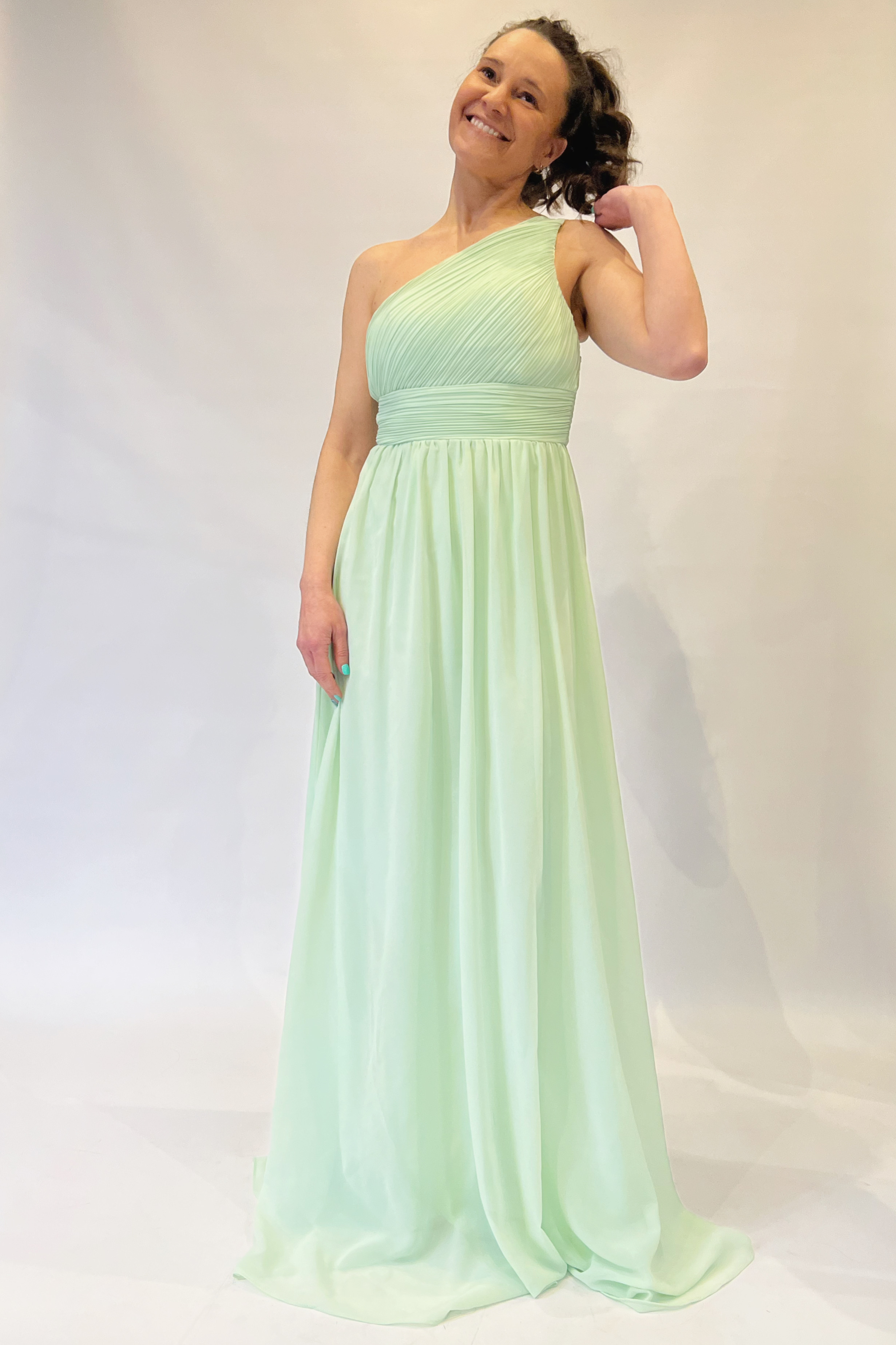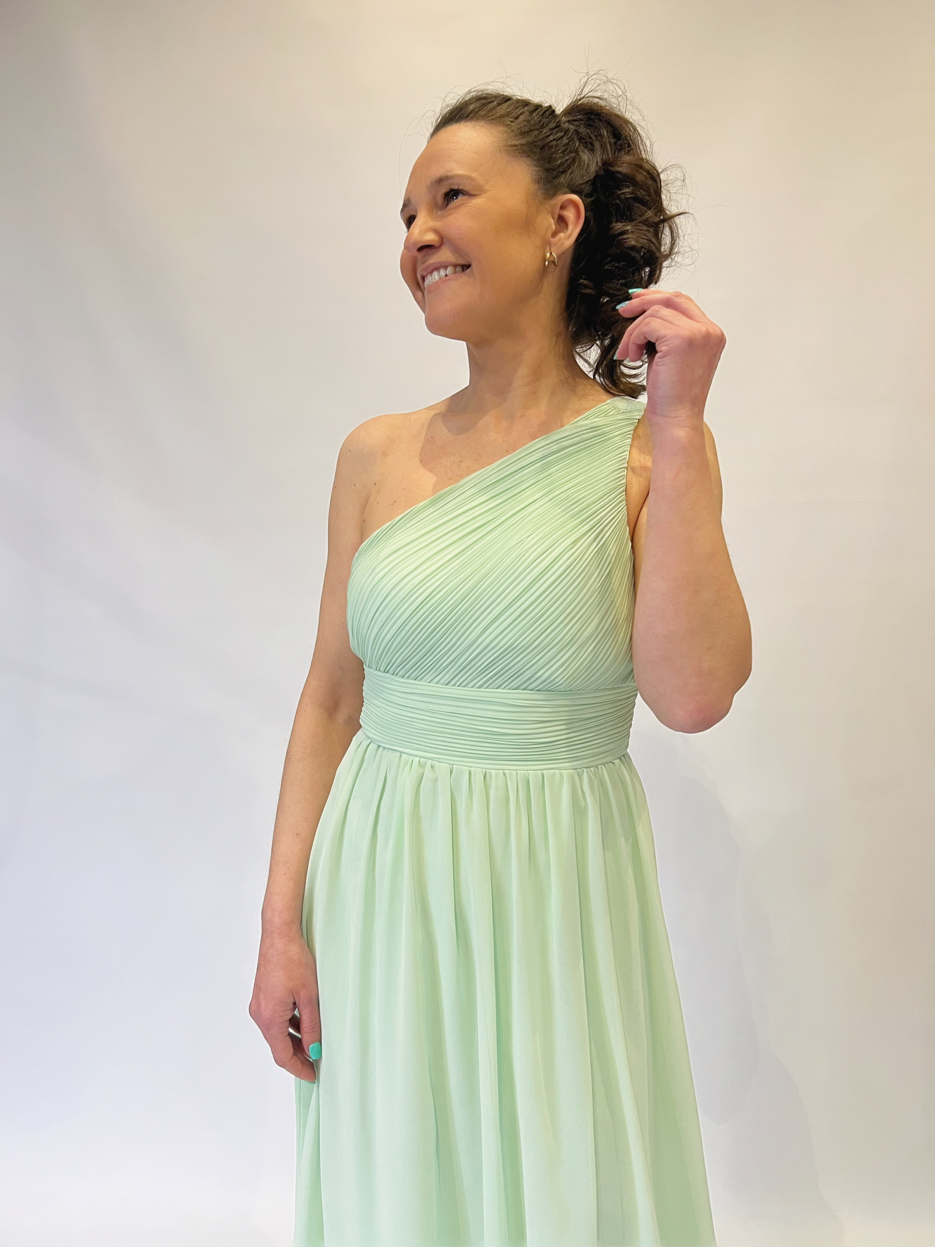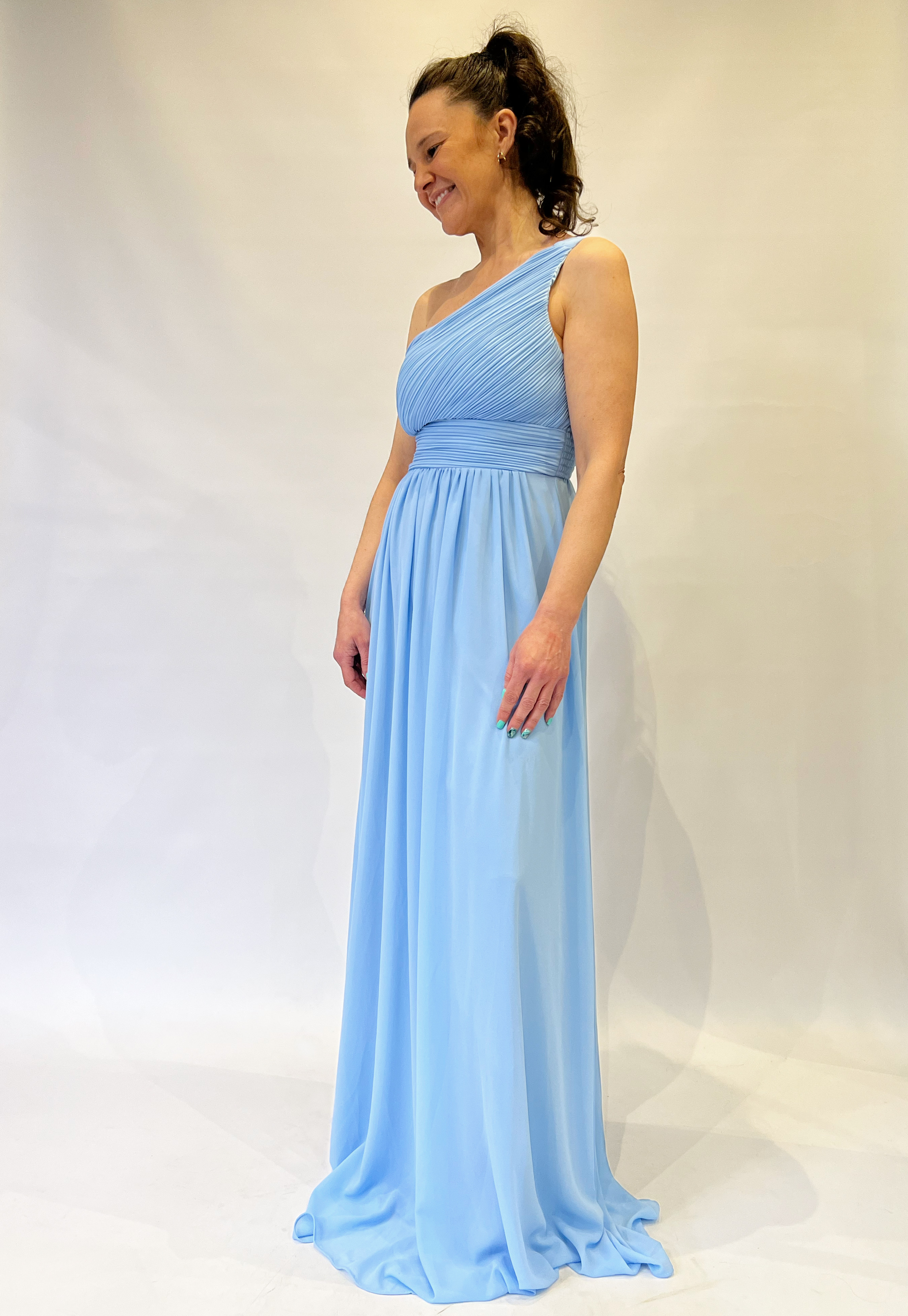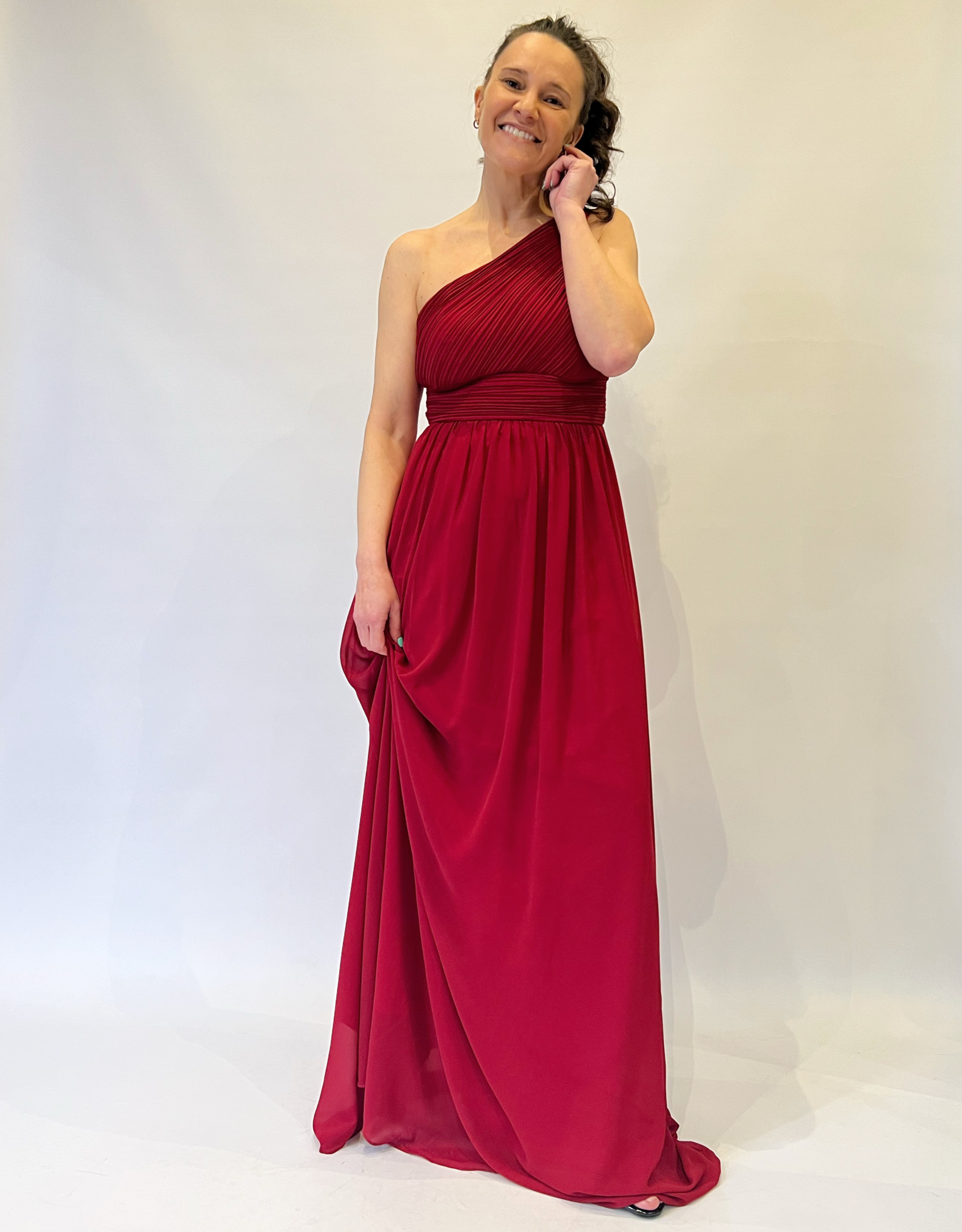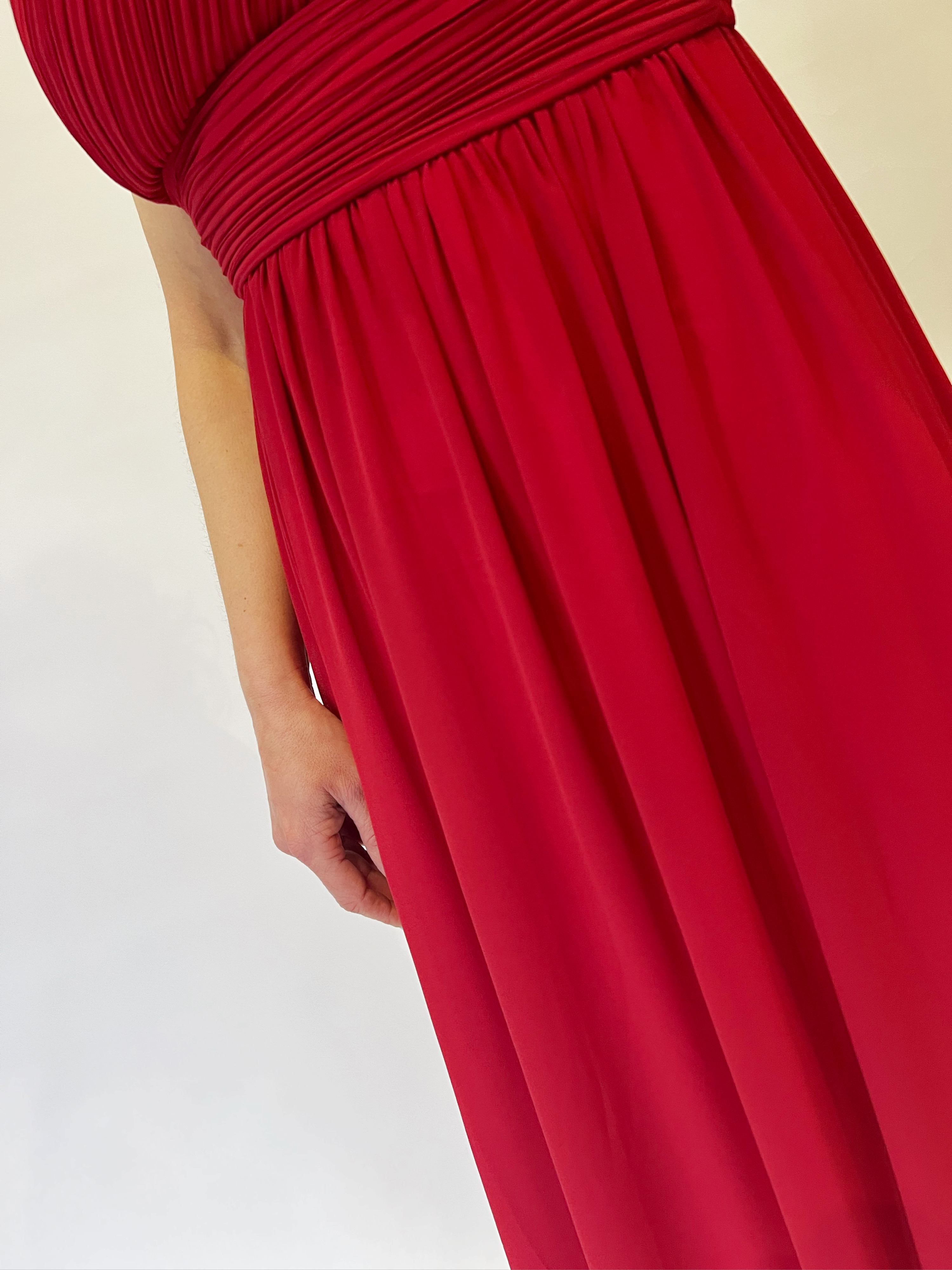Vestido largo de gasa, con un solo tirante cruzado, estilo Greco-Romano . Corpiño y tira frontal plisados y nido de abeja en espalda. Forro combinado a tono. 100% poliéster.