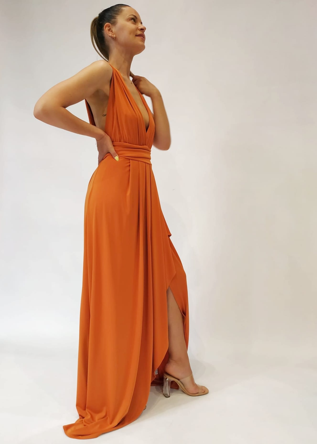 Vestido luna, color caldera, de tirantes anchos con efecto plisado. Presenta un escote pronunciado en V (también en la espalda). Banda del mismo tejido en cintura, fruncida en los laterales. 100% poliester.