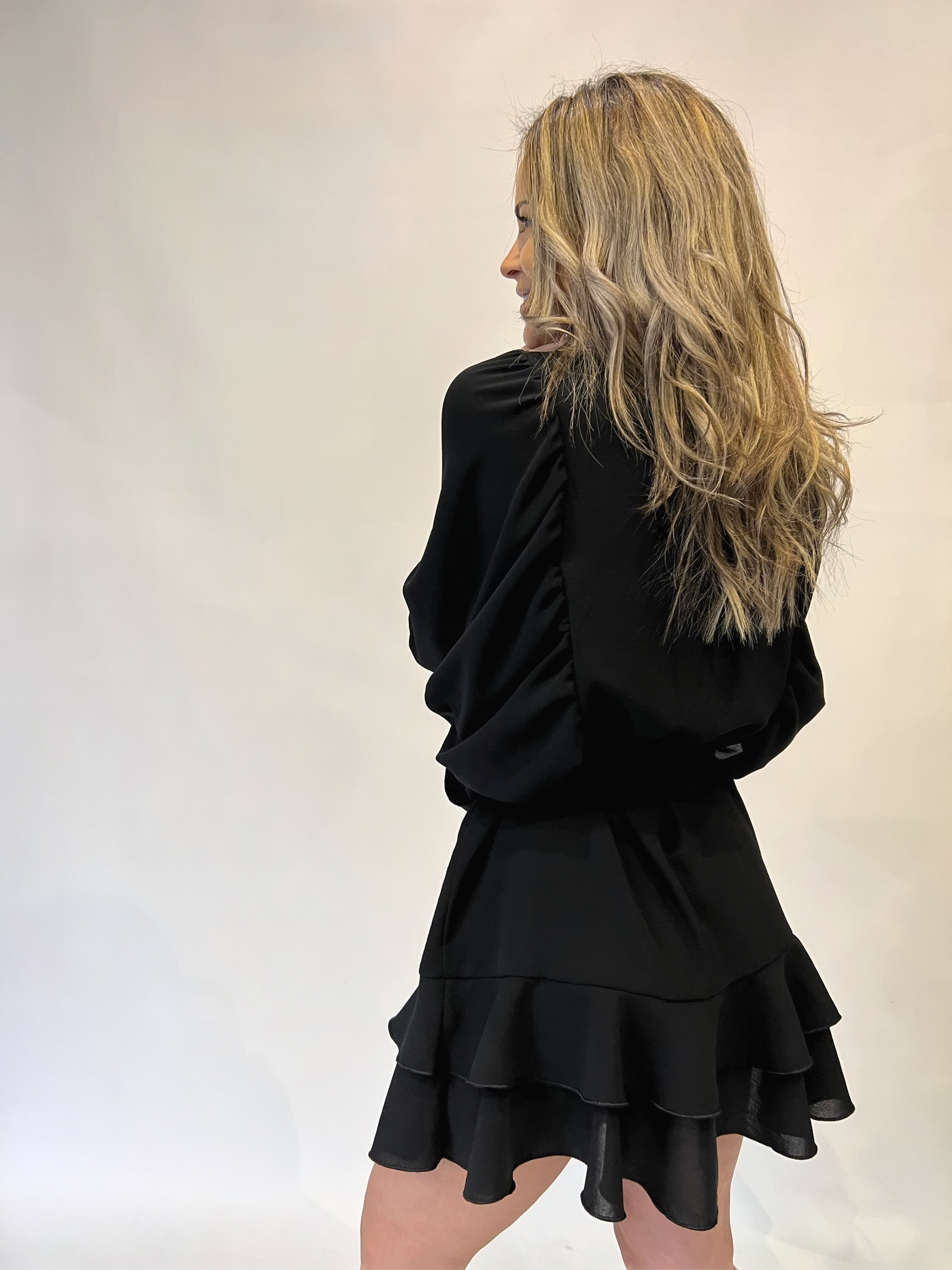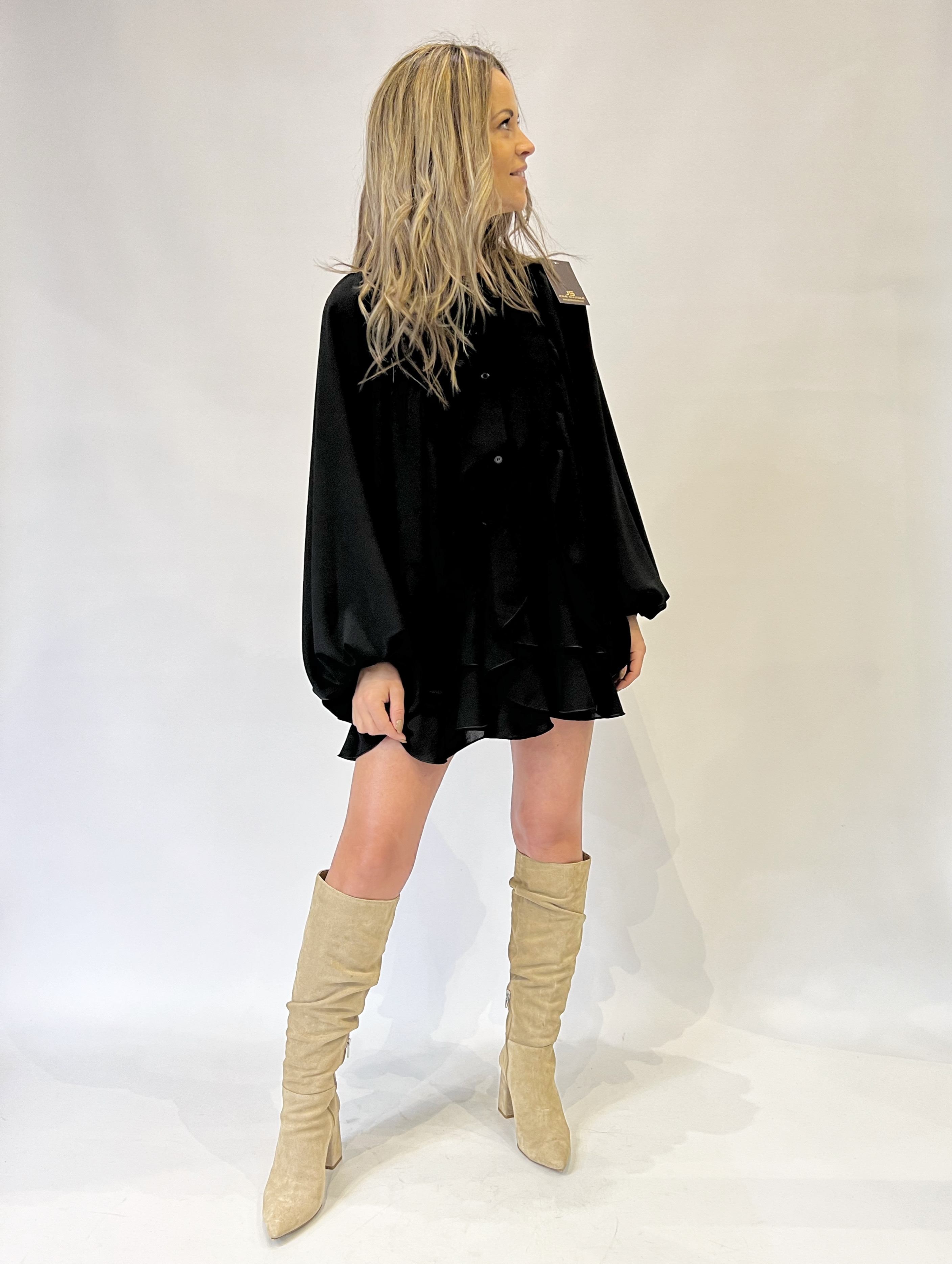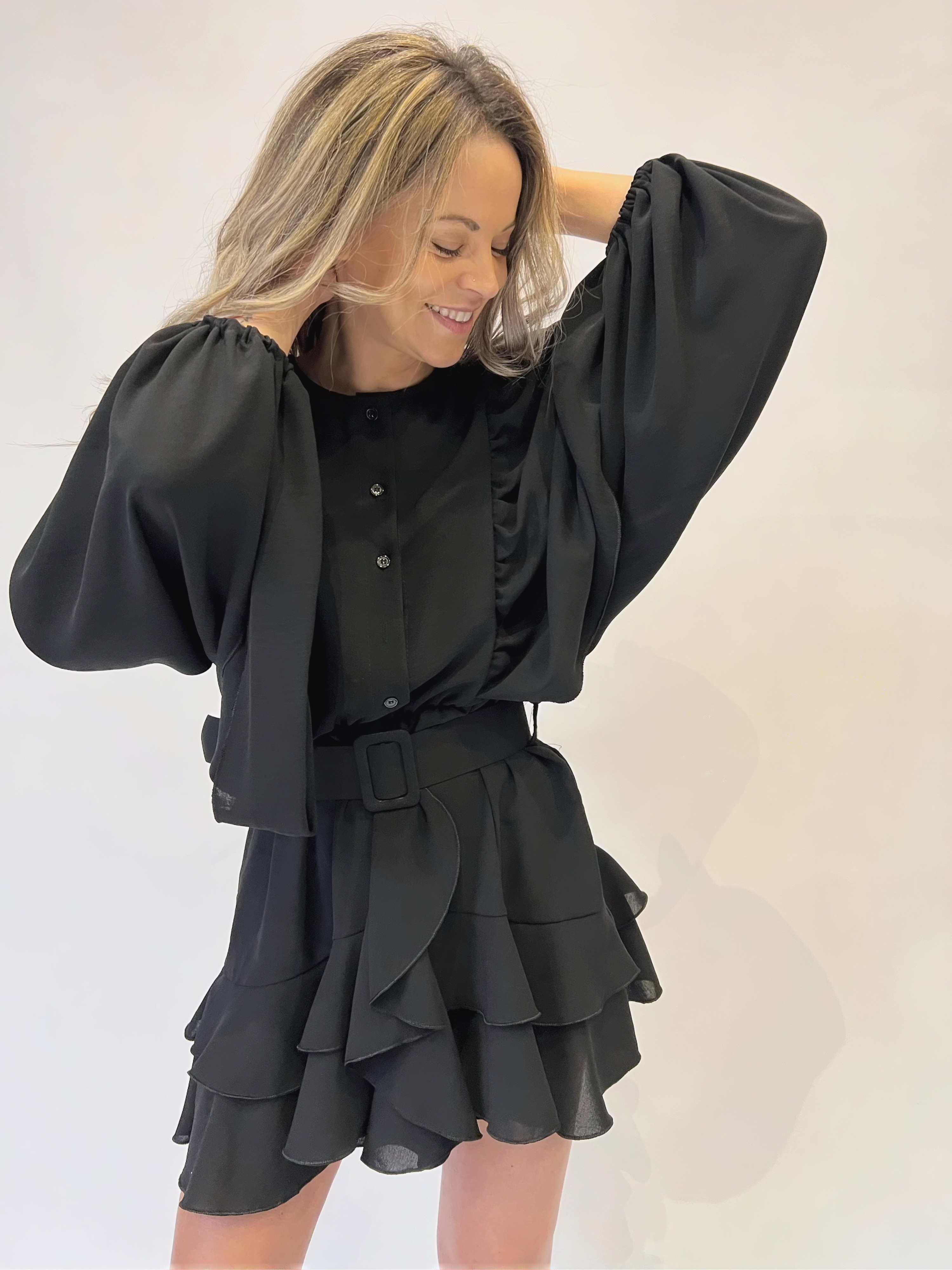 Vestido cuello redondo y manga larga extra ancha acabada en puño fruncido. Cierre de botonadura en pecho, cinturón en mismo color y falda con volantes. 100% poliéster. Made in Italy.