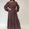 Vestido midi estampado floral, de cuello pico y manga larga. Fruncido en puños y cintura. Detalles de tiras en negro en frontal superior. 100% poliester.