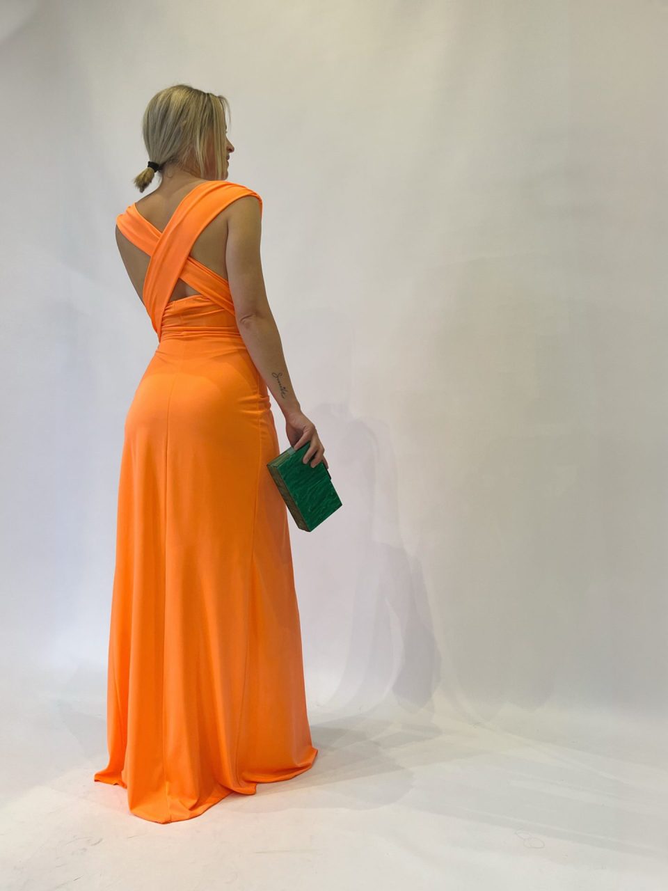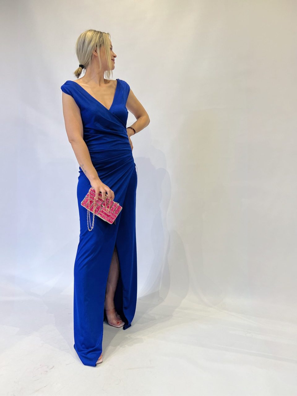 Vestido largo sin mangas, con escote cruzado en pico. Tiras cruzadas en espalda. Falda con abertura pronunciada en lateral. Hecho en Italia.