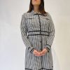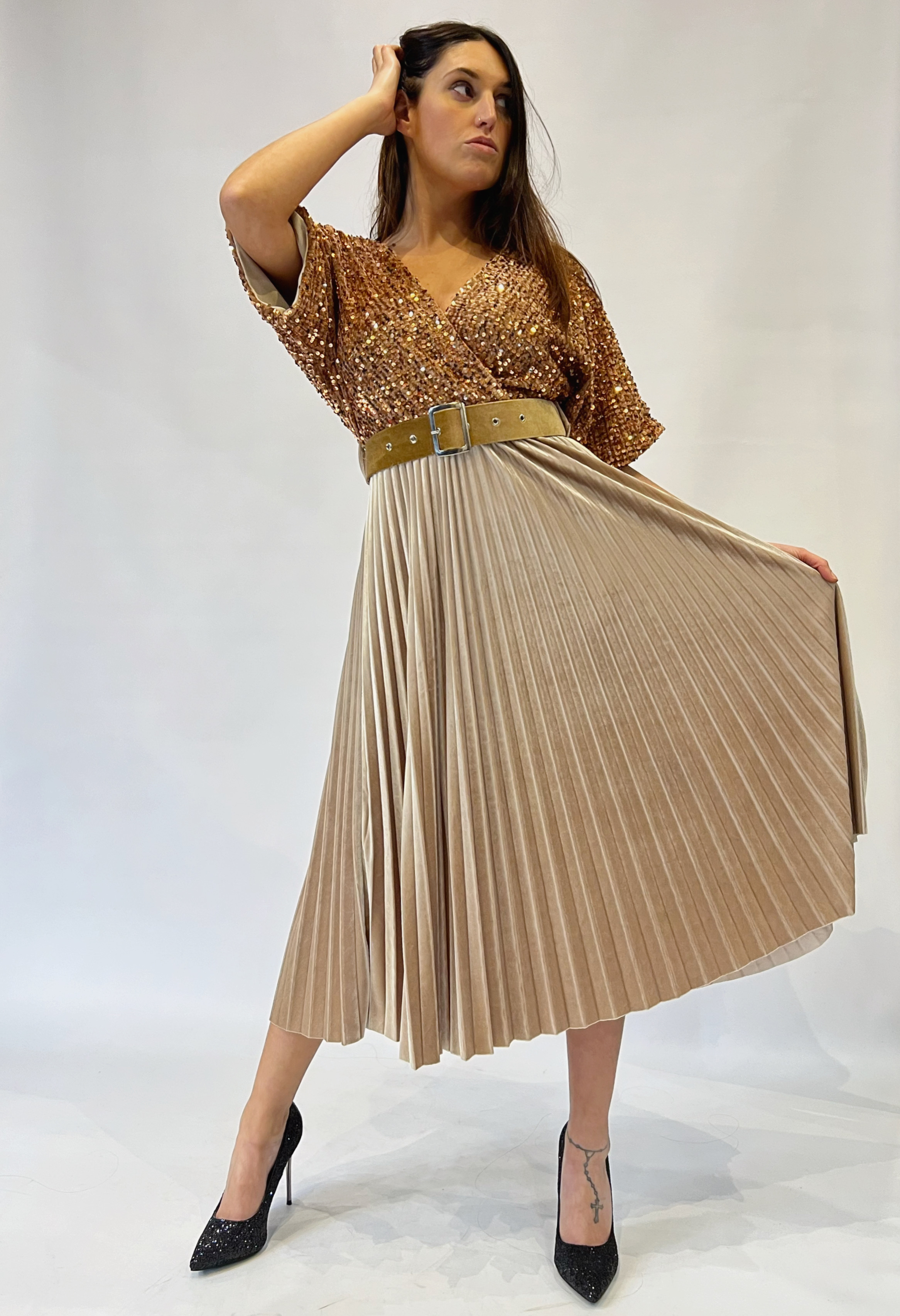 Vestido midi de terciopelo con lentejuelas en parte superior y mangas. Escote en pico cruzado y manga corta. Falda plisada en terciopelo. Corte en cintura con dos trabillas para cinturón con hebilla metálica plateada. Composición: 95% poliéster y 5% elastano. Fabricado en Italia.