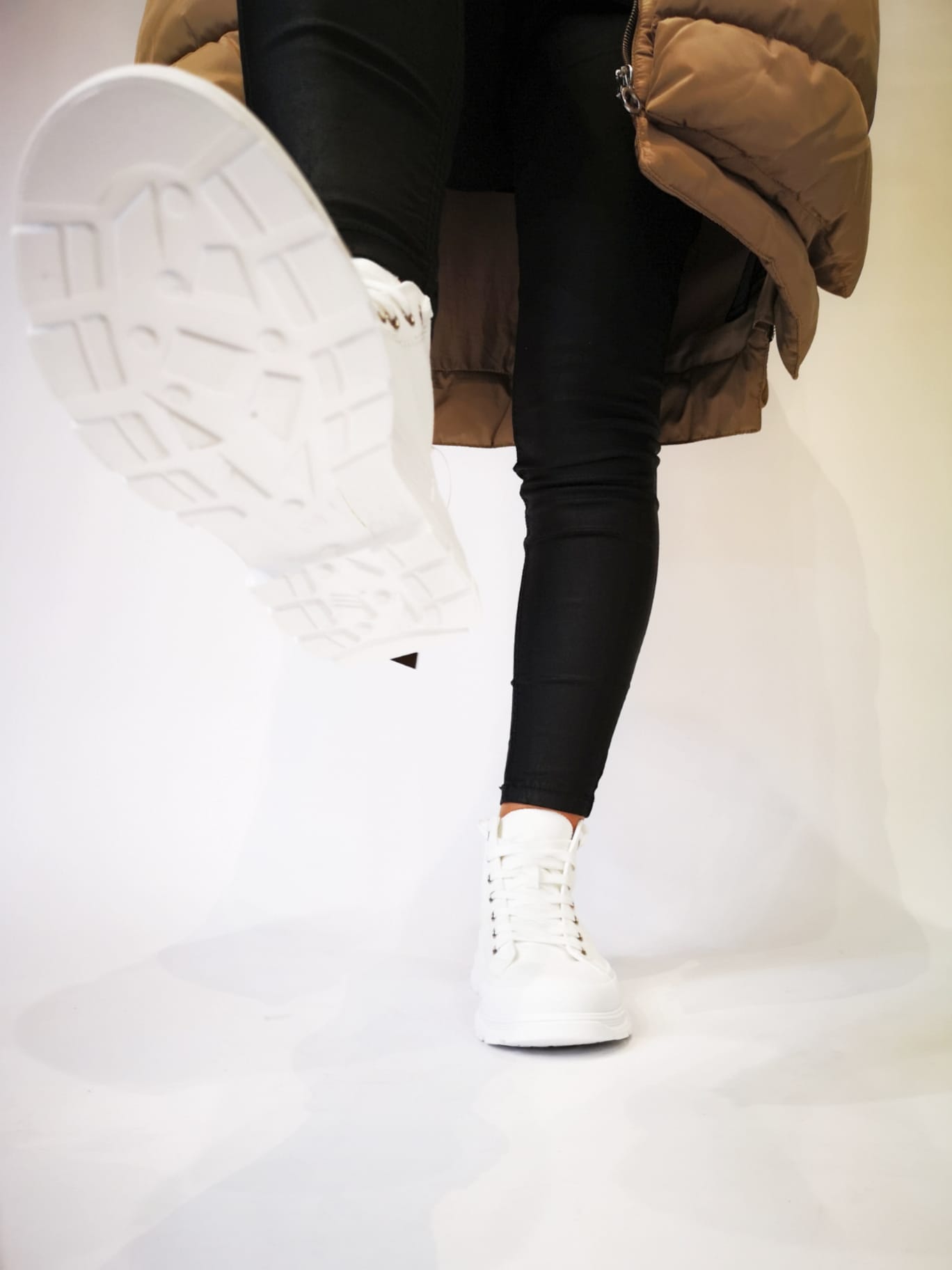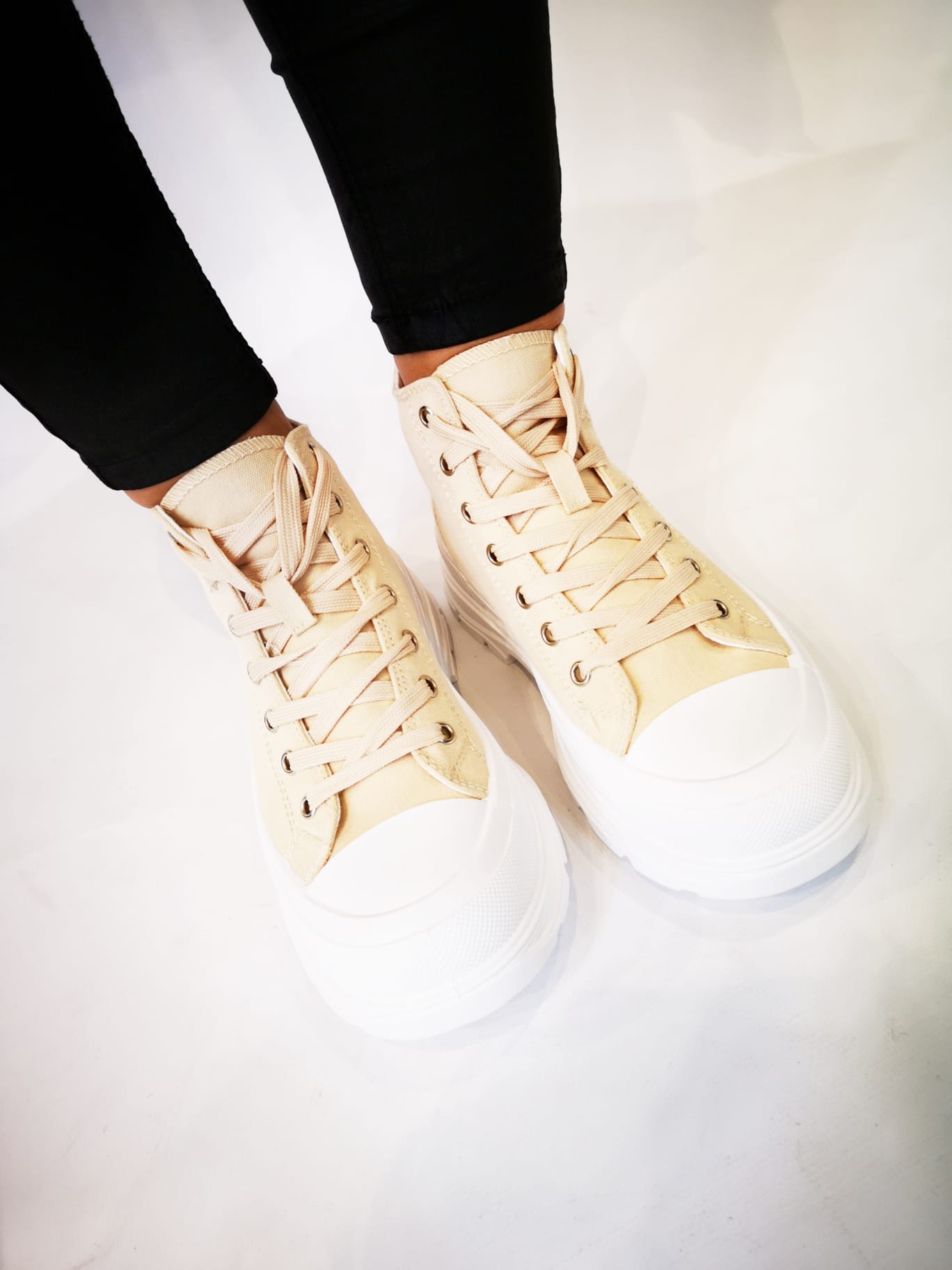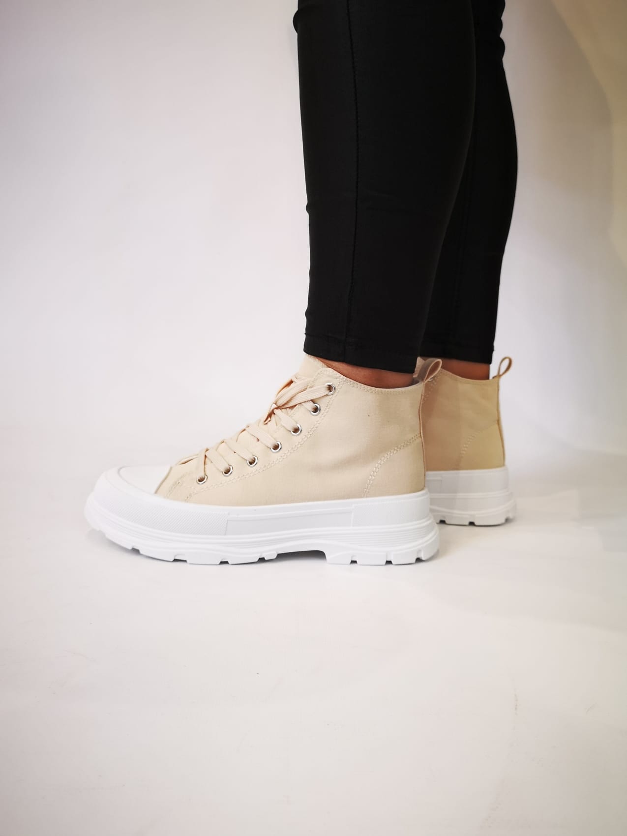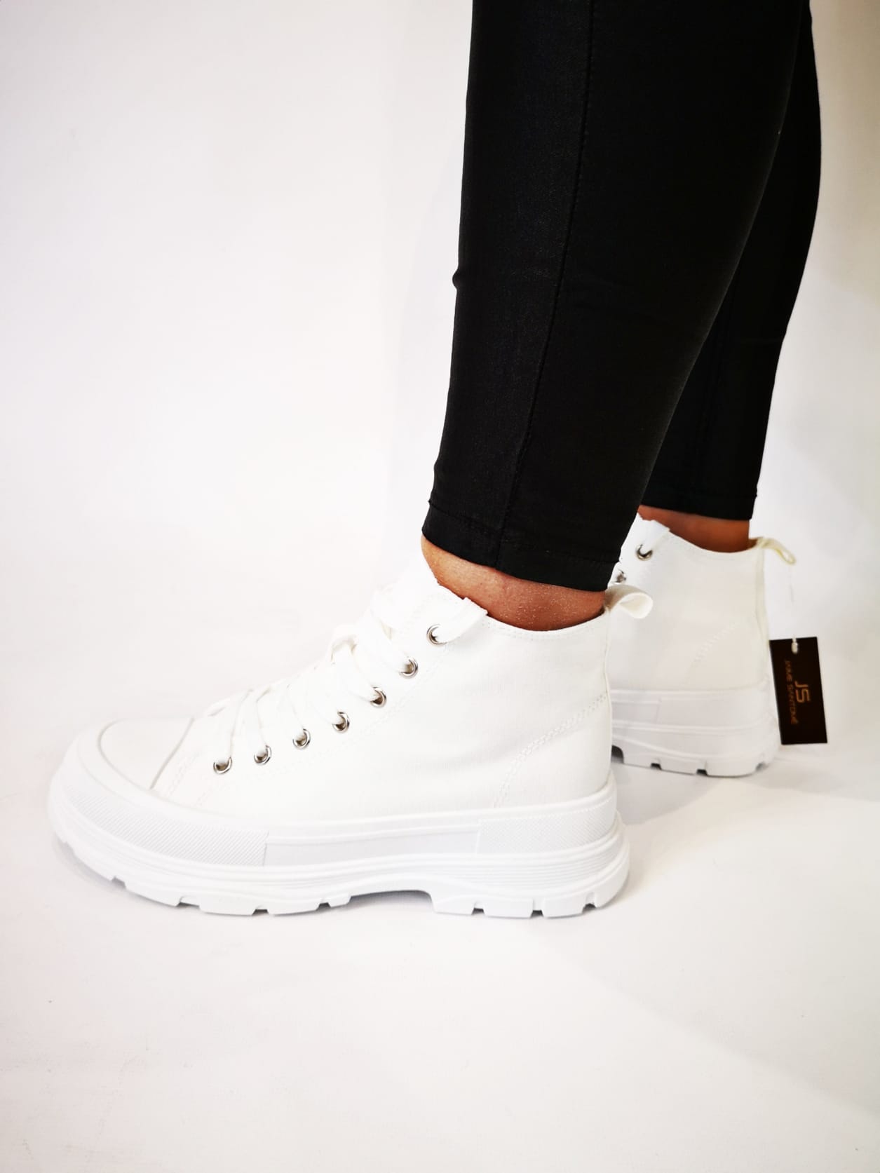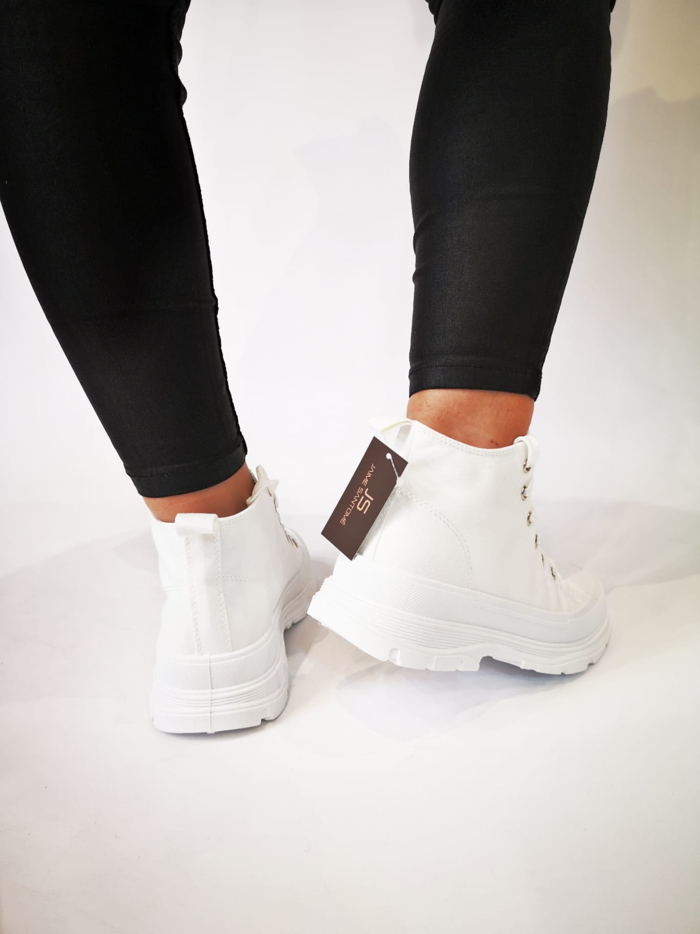 Zapatilla botín de loneta color blanco ó beige. Suela ancha y puntera en polipiel, todo en color blanco. Cordones de atar y tirador trasero del mismo color que la loneta.