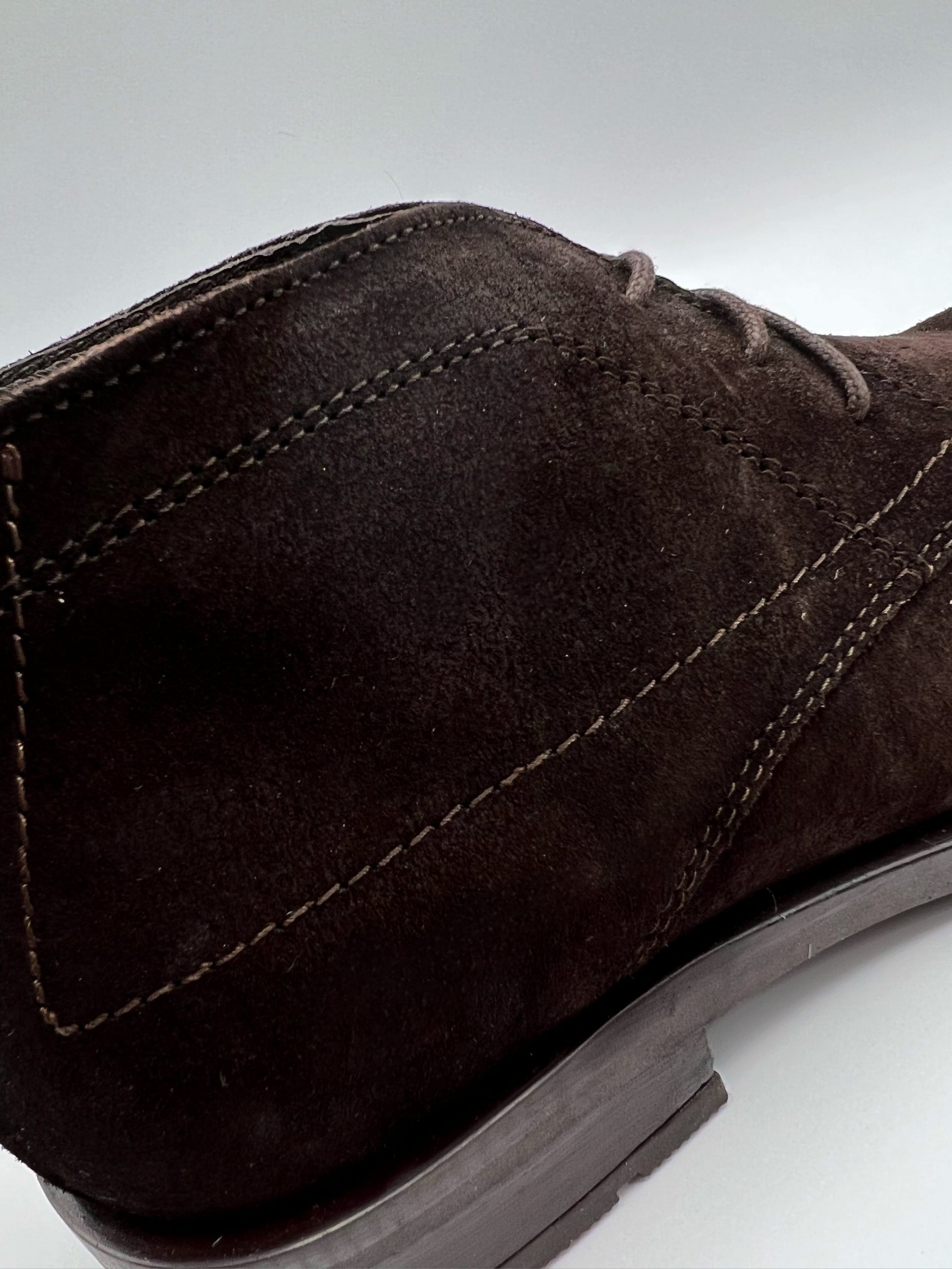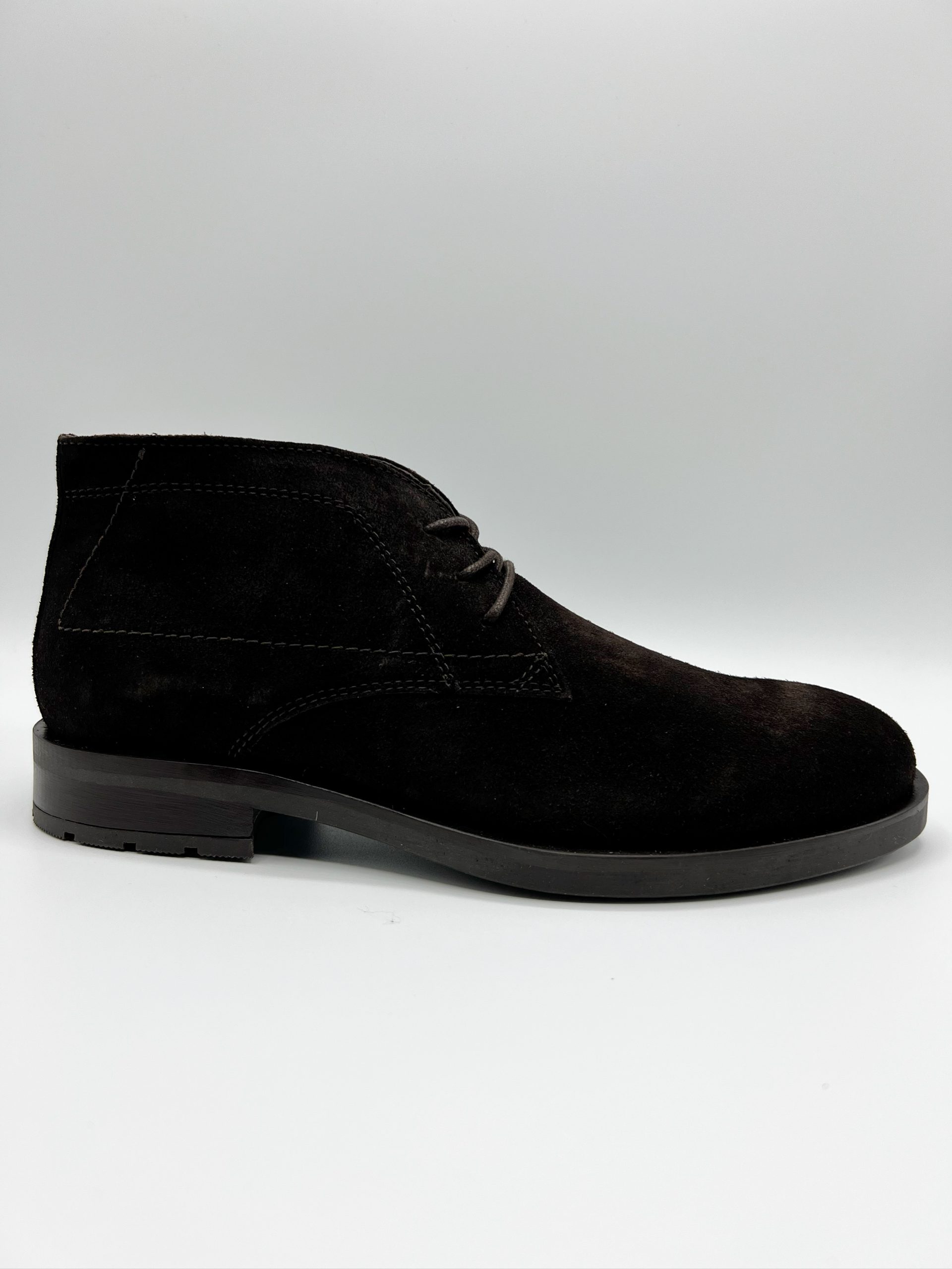 Zapato alto al tobillo con cierre de cordones redondos frontales. Corte exterior en piel antelina. Interior y plantilla en piel natural y suela de goma. Fabricado en Portugal.